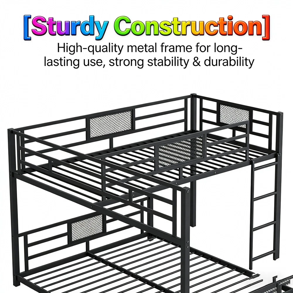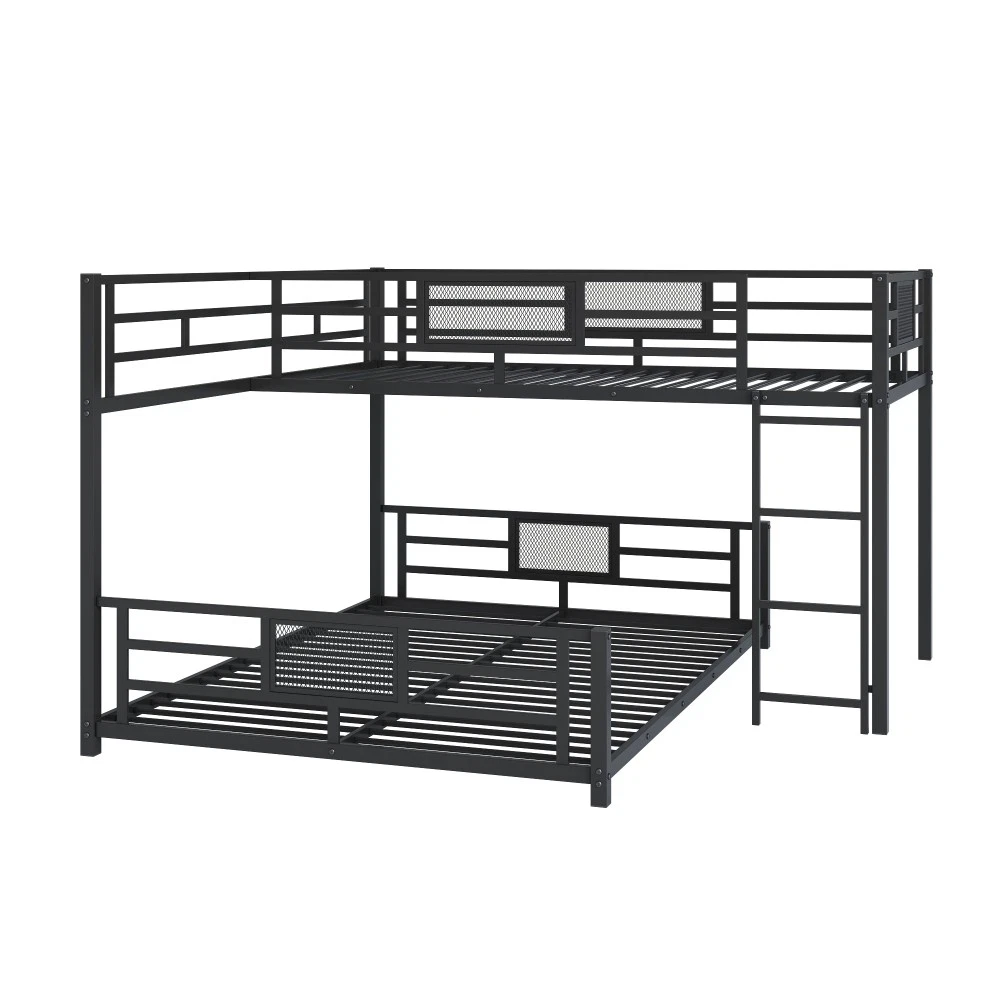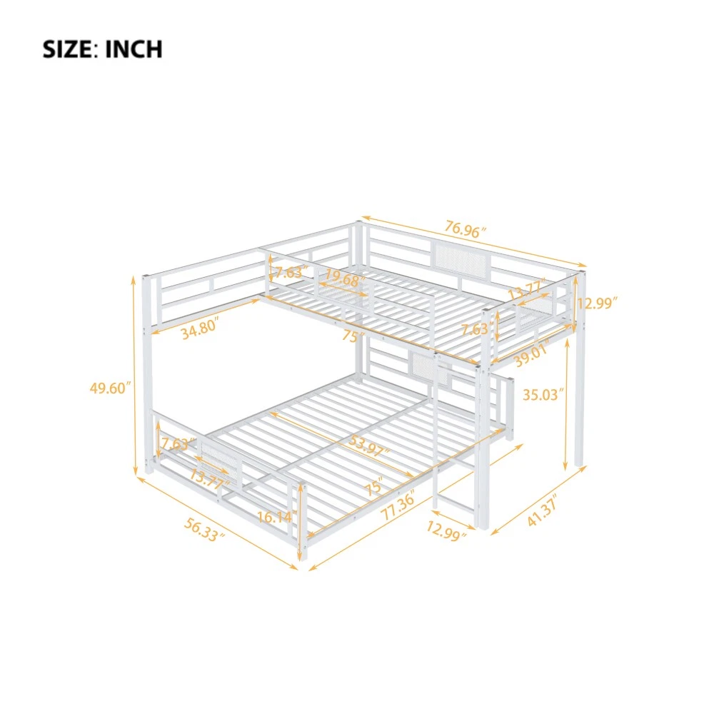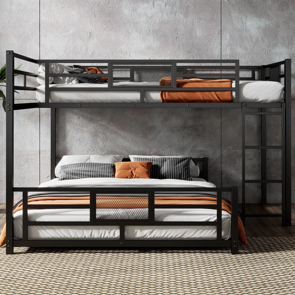 Key Specifications Origin : Vietnam Color : Sleek Black Material : Premium Metal (Frame & Slats) Size : Twin Over Full (Twin: 75''x39'' | Full: 75''x54'') Assembled Dimensions : 76.96''L x 77.36''W x 49.60''H Weight Capacity : Upper Bed (250 lbs) | Lower Bed (350 lbs) Product Weight : 115 lbs Package Details : 1 Package (77.75''L x 16.75''W x 7.90''H, 120.37 lbs) Mattress Requirement : 6'' Thickness Recommended (Box Spring NOT Required) Assembly : Required (All Tools & Instructions Included) Why Choose This Bunk Bed? ✅ Ultra-Sturdy Construction : Built with high-quality metal frame and solid metal slats, this bunk bed offers exceptional stability and long-lasting durability—designed to withstand daily use for years to come. ✅ Space-Saving Essential : The L-shaped design maximizes floor space, while the open area underneath the lower bed provides endless customization options (storage, seating, workspace, etc.). Ideal for compact living spaces! ✅ Top-Tier Safety Features : Equipped with full-length guard rails on the upper bunk for added protection, plus anti-slip metal slats that keep mattresses securely in place—no shifting or squeaking! ✅ Hassle-Free Assembly : Comes with detailed, easy-to-follow instructions and all necessary tools. Assemble your new bunk bed in no time without additional purchases. ✅ No Box Spring Needed : Durable metal slats provide strong, even support for your mattresses, extending their lifespan while eliminating the need for extra box springs. Premium Guarantees for Your Peace of Mind 1-Year Manufacturer Warranty : We stand behind the quality of our product! Enjoy a 1-year warranty covering manufacturing defects and structural issues. 30-Day Free Return & Exchange : Not completely satisfied? Return or exchange your bunk bed within 30 days of delivery—no questions asked, free of charge. 用一张兼顾功能、时尚和可靠性的双层床升级您的家。非常适合家庭、大学生或任何想要优化空间的人——今天就下单吧!