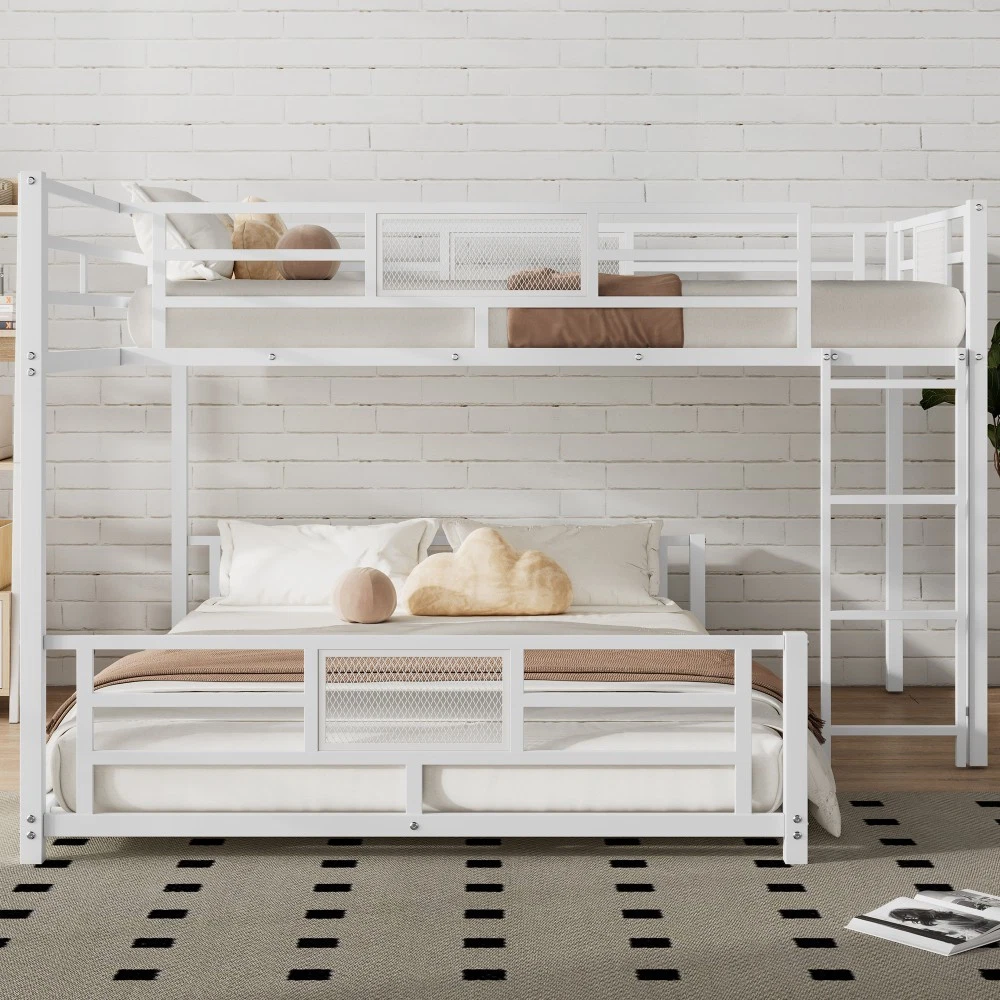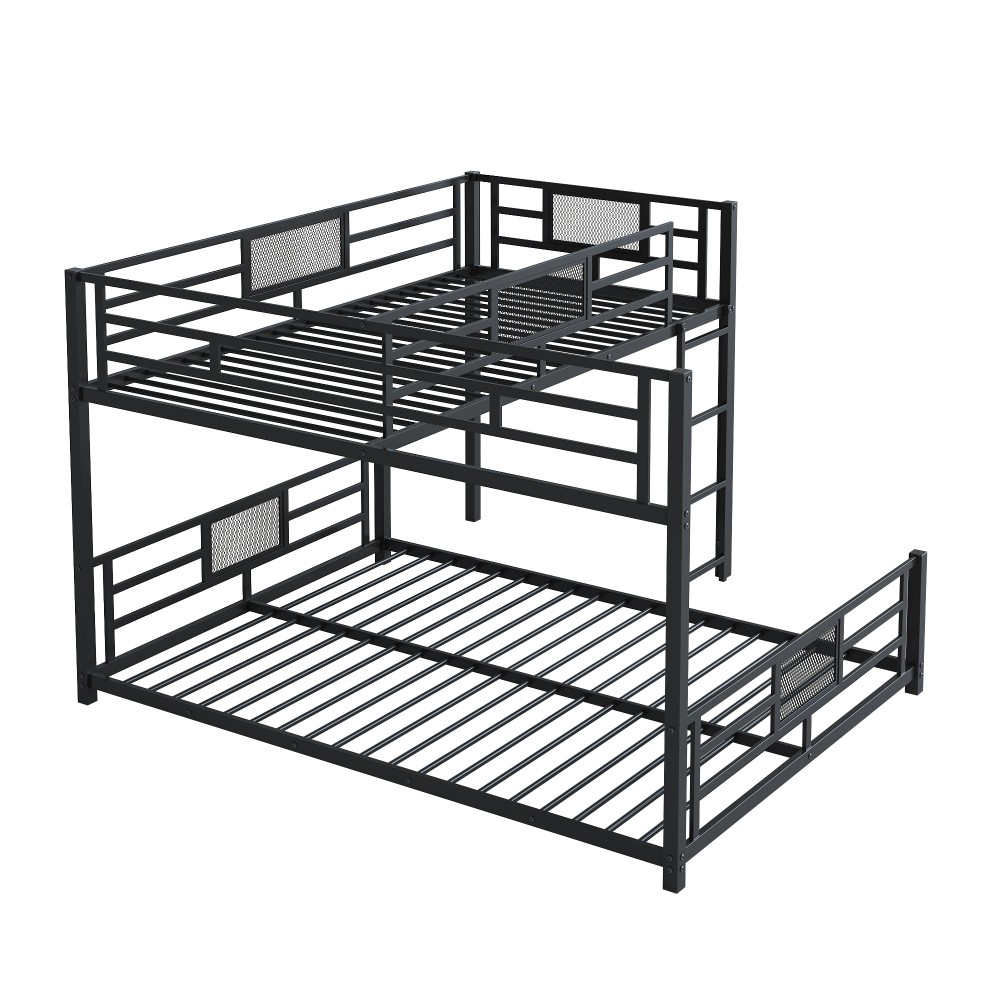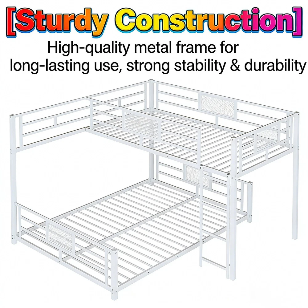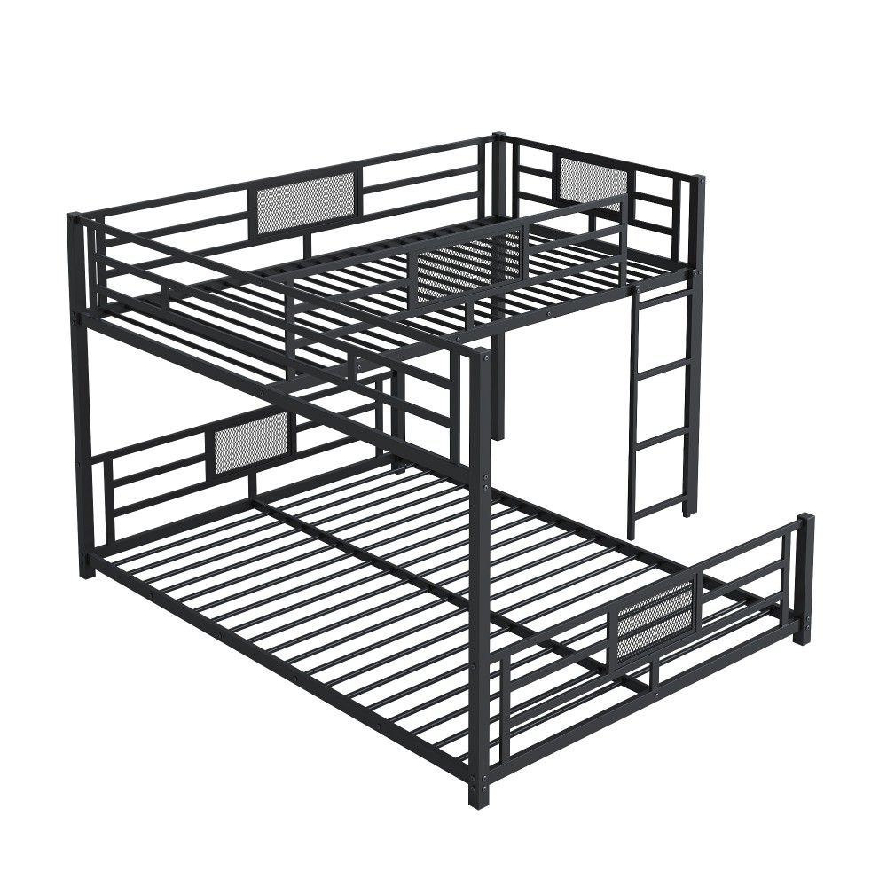 Key Specifications Origin : Vietnam Color : Sleek Black Material : Premium Metal (Frame & Slats) Size : Twin Over Full (Twin: 75''x39'' | Full: 75''x54'') Assembled Dimensions : 76.96''L x 77.36''W x 49.60''H Weight Capacity : Upper Bed (250 lbs) | Lower Bed (350 lbs) Product Weight : 115 lbs Package Details : 1 Package (77.75''L x 16.75''W x 7.90''H, 120.37 lbs) Mattress Requirement : 6'' Thickness Recommended (Box Spring NOT Required) Assembly : Required (All Tools & Instructions Included) Why Choose This Bunk Bed? ✅ Ultra-Sturdy Construction : Built with high-quality metal frame and solid metal slats, this bunk bed offers exceptional stability and long-lasting durability—designed to withstand daily use for years to come. ✅ Space-Saving Essential : The L-shaped design maximizes floor space, while the open area underneath the lower bed provides endless customization options (storage, seating, workspace, etc.). Ideal for compact living spaces! ✅ Top-Tier Safety Features : Equipped with full-length guard rails on the upper bunk for added protection, plus anti-slip metal slats that keep mattresses securely in place—no shifting or squeaking! ✅ Hassle-Free Assembly : Comes with detailed, easy-to-follow instructions and all necessary tools. Assemble your new bunk bed in no time without additional purchases. ✅ No Box Spring Needed : Durable metal slats provide strong, even support for your mattresses, extending their lifespan while eliminating the need for extra box springs. Premium Guarantees for Your Peace of Mind 1-Year Manufacturer Warranty : We stand behind the quality of our product! Enjoy a 1-year warranty covering manufacturing defects and structural issues. 30-Day Free Return & Exchange : Not completely satisfied? Return or exchange your bunk bed within 30 days of delivery—no questions asked, free of charge. 用一张兼顾功能、时尚和可靠性的双层床升级您的家。非常适合家庭、大学生或任何想要优化空间的人——今天就下单吧!