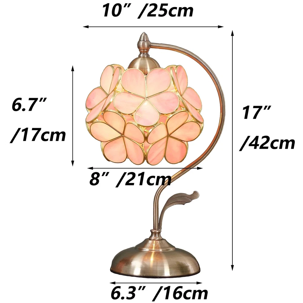 Cherry blossoms are a symbolic flower of the spring, a time of renewal, and the fleeting nature of life. Their life is very short. After their beauty peaks around two weeks, the blossoms start to fall. ... A cherry blossom makes people merry. This is a Tiffany-style stained glass petal lamp. Each lampshade has 11 flowers, each flower has 5 petals, each petal is made of pink stained glass that is wrapped by copper rims that add strength and durability to the lampshade. it looks stunning when you place it in your house. you definitely will receive many compliments. It's also a special gift for your lover, parents, children, clients, and colleagues; It perfectly fits for a bedside, living room, end table, working table, and dining room, etc If you use it at night, the petals will be projected onto the wall. the light and shadow on the wall will add a great ambiance to your house. it definitely an amazing nightstand lamp. is a worldwide well-known brand of Tiffany-style stained glass products, we specialize in designing and manufacturing Tiffany style lamp, window panel, and other stained glass artworks. Size: 8-inch wide lampshade, 17-inch high, Uses 1 x 40W (Max) E26 bulb (Not included), In-line switch; ELEGANT PETAL: This is a simple style petal lampshade that is made of pink stained glass; Simplicity is the key to aesthetic success in spaces inspired by this style HANDMADE: This lamp is handmade by skilled craftsmen; The lampshade is made of stained glass and it is prepared by using the copper foil method TIMELESS: The stained glass is timeless and never losing its luster; You will notice the difference in color between the light on and off IDEAL DECOR: You will see many shadows of the petal on you wall when you light it up at night. it's really an amazing home decor no matter where you place it.