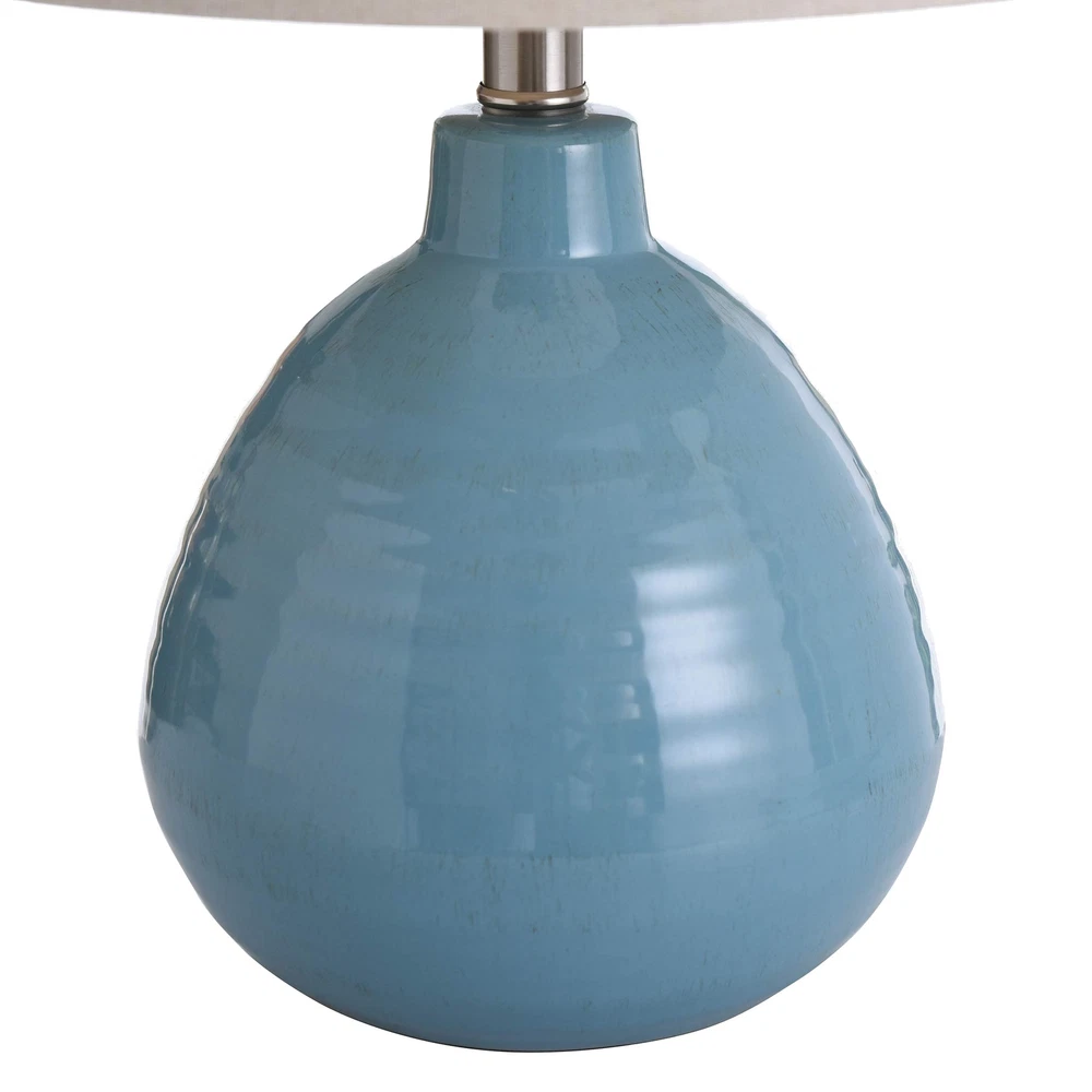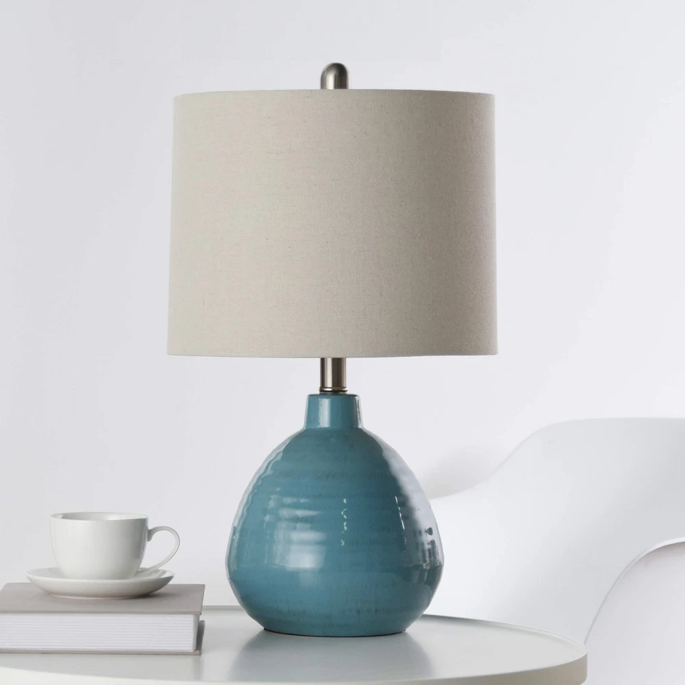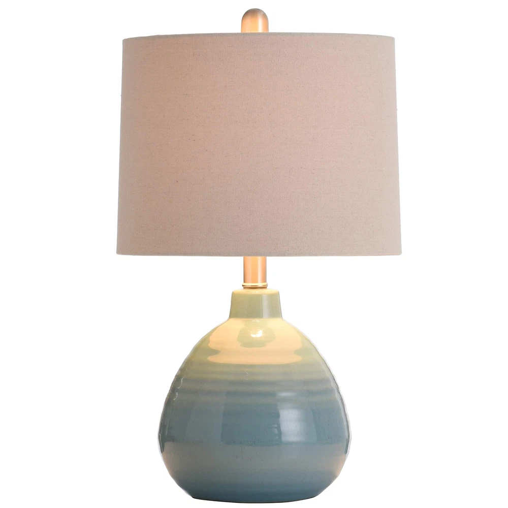 This beautiful ceramic table lamp will be the perfect accent in any family room. It comes with a standard rotary on/off switch, but even when it is not illuminated, you will enjoy the aesthetic it brings to the room. This lamp features a rotary on/off switch at the socket of the lamp This item is for dry locations, meaning it can be used in an indoor area that is not normally subject to dampness. May include a location subject to temporary dampness provided ventilation is adequate to prevent any accumulation of moisture such as the bathroom This product is manufactured in China This piece measures as 7"L x 7"W x 0"H - 11.4lbs. Crafted from: Metal, Glass, Glass Suitable for any indoor location Requires 1 x 5-watt E26 Medium base bulb (not included) - 120V Shade measures as 7"Dia. x 3"H Due to lighting and monitor differences, actual colors and finishes may vary slightly from what appears online.