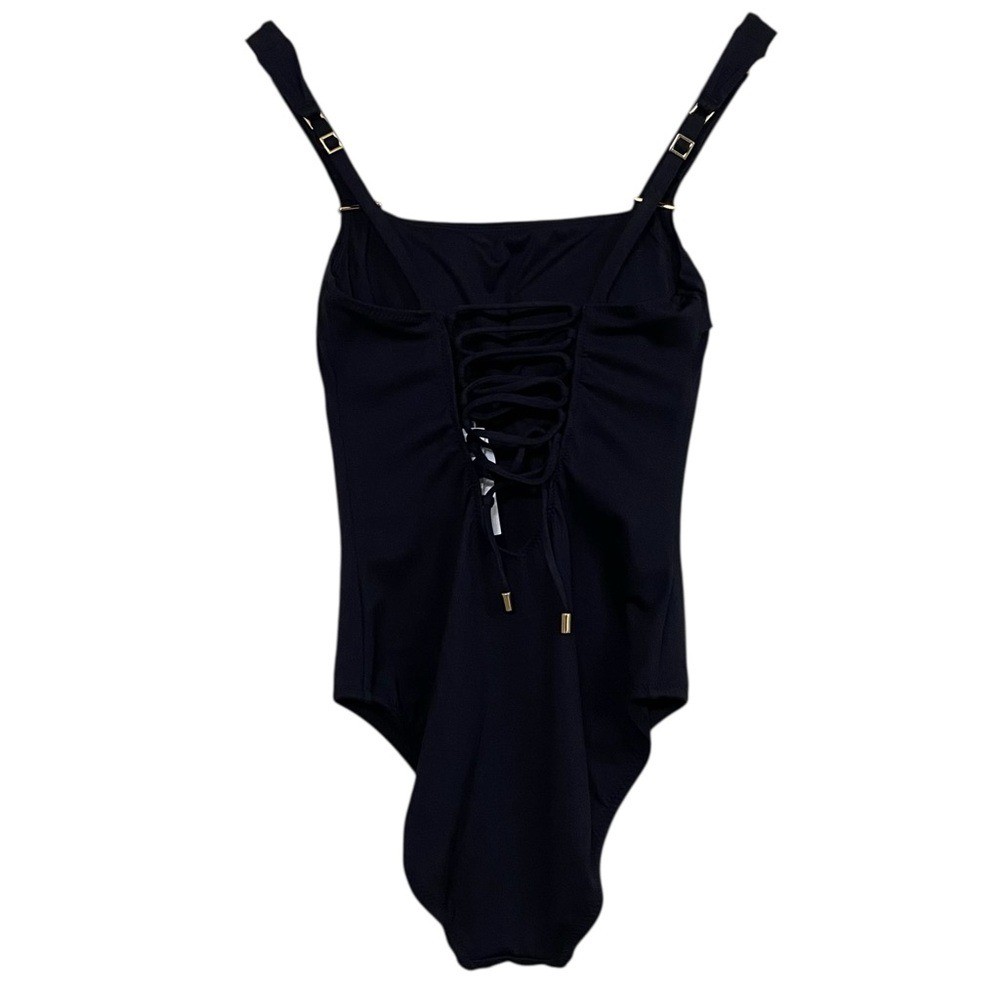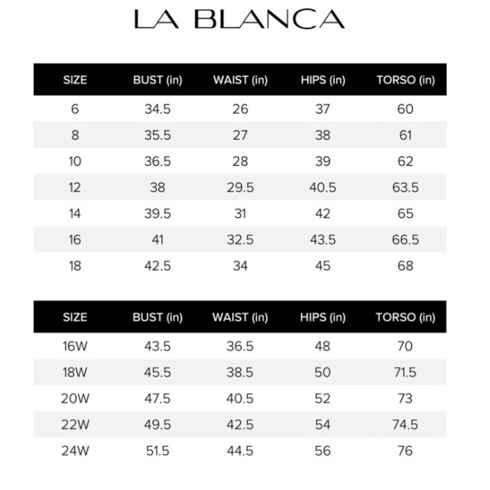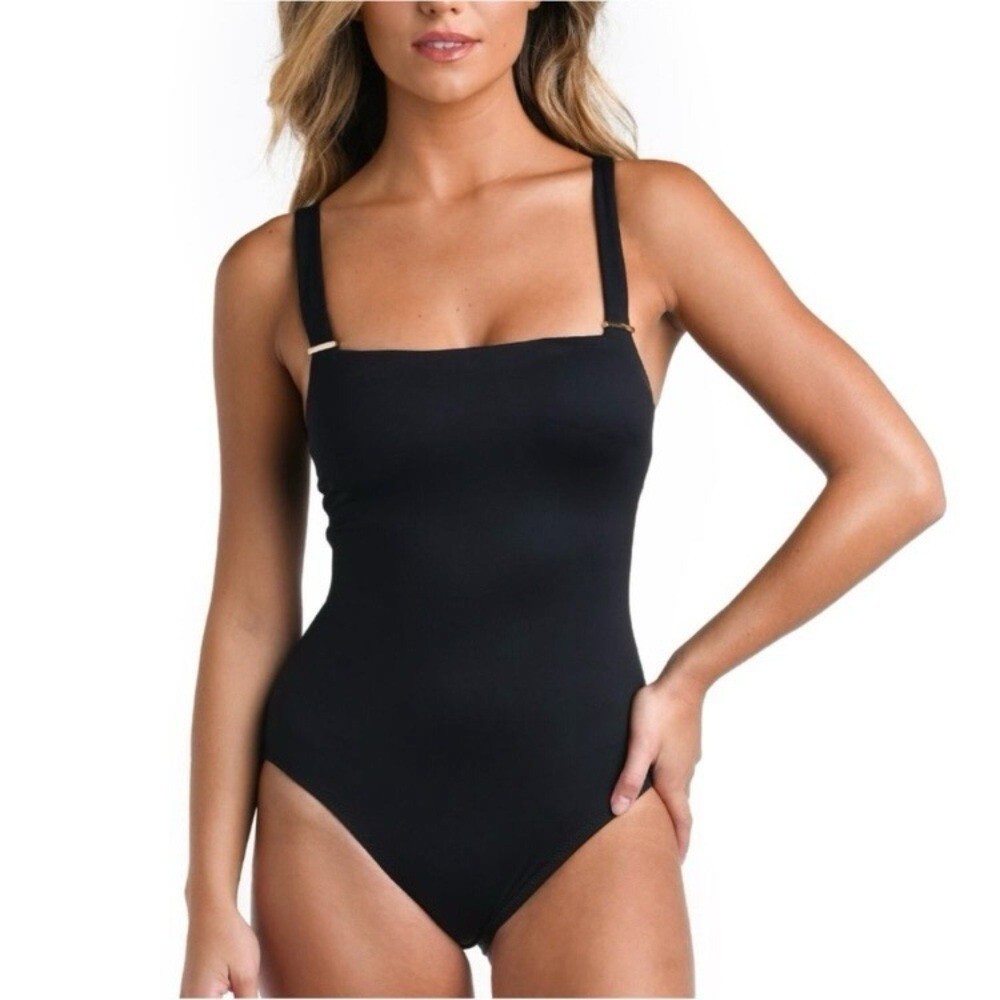 LA BLANCA Luxe Swimsuit Black One Piece Swim Tummy Control Compression NWT Size 6 Size chart in photos Introducing La Blanca Luxe line of compression swimwear. Designed with a specialty knit spacer fabric that consists of 3 dimensional layers, exclusive to La Blanca. Air filled space between the two surfaces provide cushioning and ventilation. Get ready to feel sculpted and confident while wearing this swimsuit! Details One piece swimsuit UPF 50+ High level of chlorine resistance Long lasting fit & shape retention Compression and shaping Adjustable straps w/ gold bar details Removable cups Lifting and sculpting Built-in tummy control Fast drying & moisture wicking Fabric Adjustable lace up back 57% Nylon, 43% Elastane