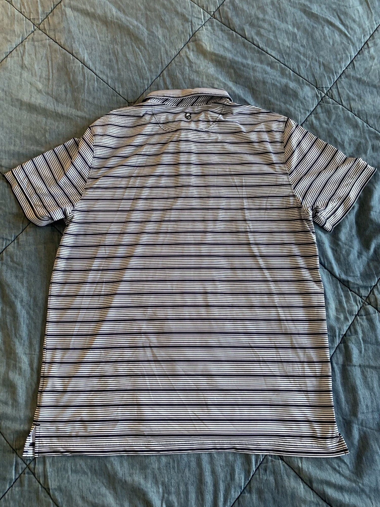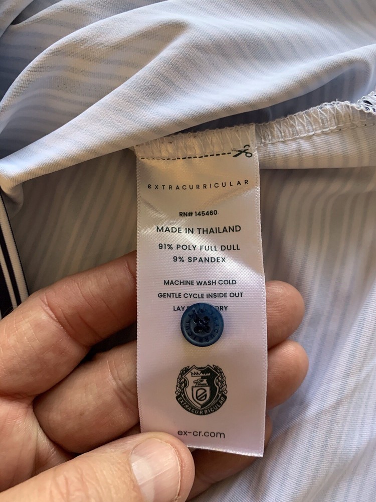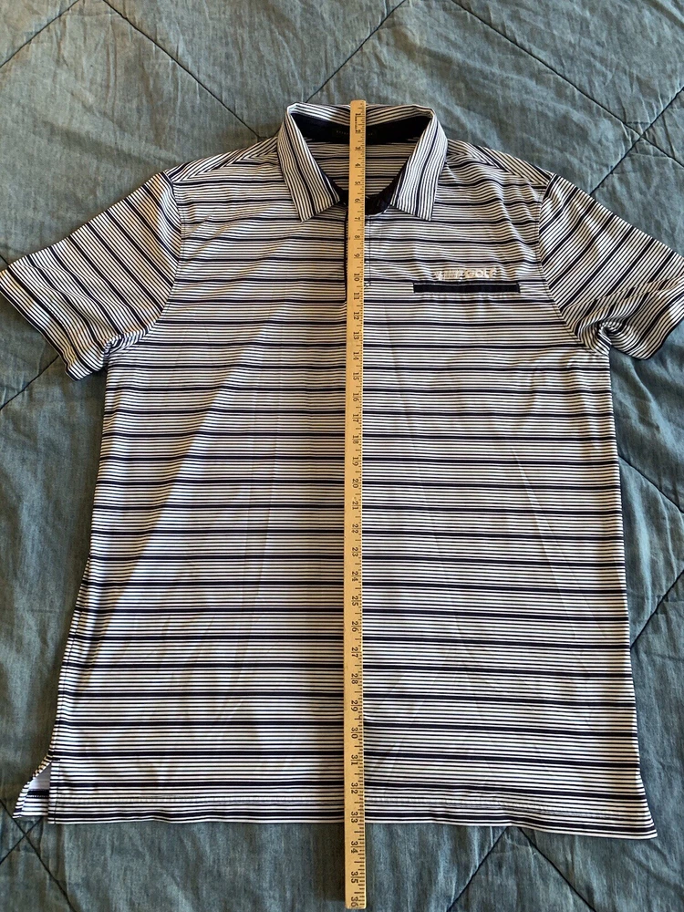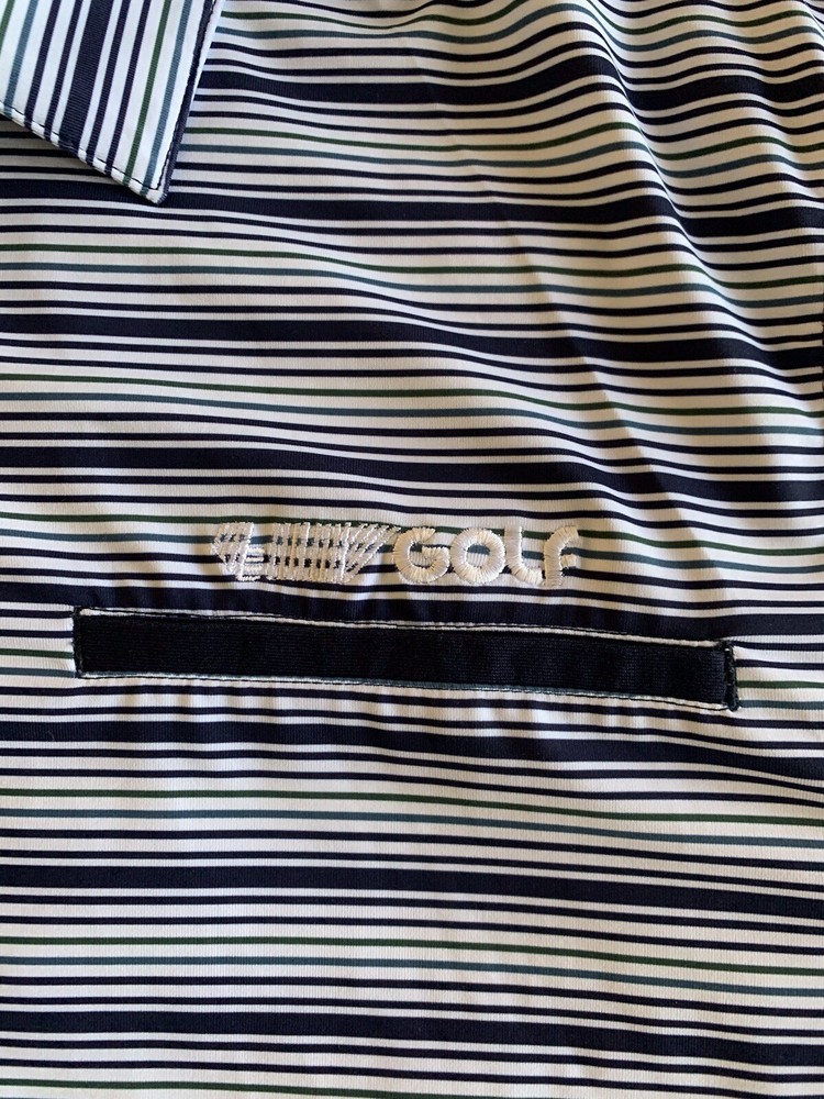 The Extracurricular LA LIV GOLF Polo Shirt for men is a stylish and comfortable option for those who enjoy playing golf. This short sleeve polo features a blue and green striped pattern, collared neckline, and button accents with a logo detail. Made from a blend of polyester and spandex, this shirt offers a stretch fit for maximum comfort on the golf course. Designed with a regular fit in size XL, this polo is a practical and fashionable choice for any golfer looking to elevate their wardrobe with a touch of style.