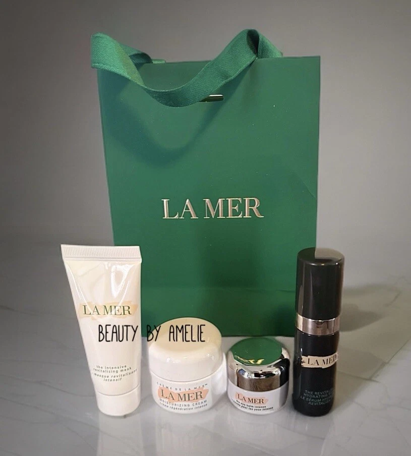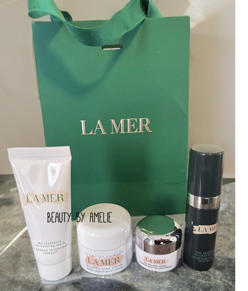 Deluxe samples of: The Eye Balm Intense Cream (3 ml.), Crème de la Mer Moisturizing Cream (7 ml.), The Intensive Revitalizing Mask (15 ml.) The Revitalizing Hydrating Serum (5 ml.) Small gift bag (bag has a few creases from shipping)
