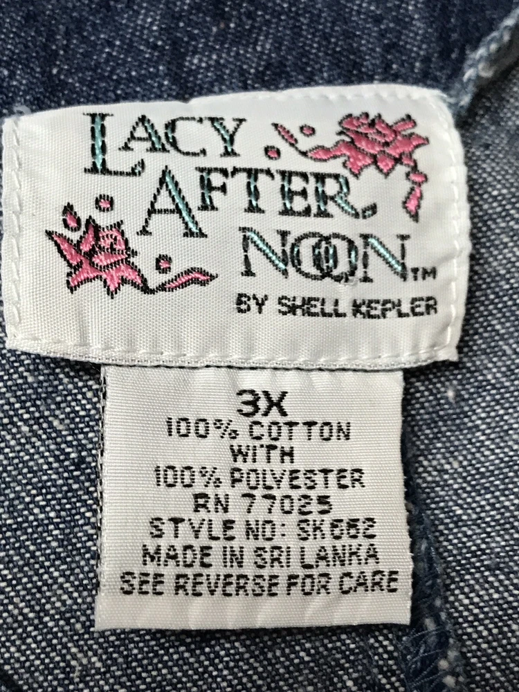 LACY AFTERNOON by SHELL KEPLER Denim Vest Lace Pockets Women's 3X in great condition! 4 Buttons down the front Two front denim pockets with lace overlay 100% cotton Measurements are in "Item Specifics" Please check all pictures as they are part of the description! I have great feedback and will be happy to answer any questions! This is a smoke-free home. Fast shipping! One business day handling!