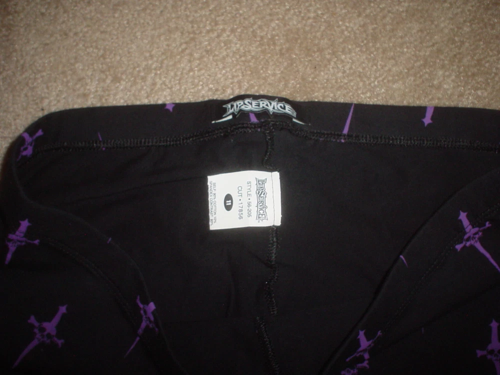 Up for Auction is: SKULL LEGGINGS THIS IS A (LIP SERVICE - STYLE 56-205) STRETCH LEGGINGS. PULL-ON STYLE WITH STRETCH ELASTIC WAIST BAND & STRETCHY FABRIC. FABRIC STRETCHES BOTH DIRECTIONS. NEW - NO TAGS. SLIGHT WRINKLING, LINT, ETC. FROM STORAGE. (PLEASE SEE ALL PICTURES & ZOOM IN FOR CLOSER VIEWS). LADIE'S/ JUNIOR'S SIZE 11. SMOKE-FREE PET-FREE PERFUME FREE WAIST MEASURES ABOUT 31.5" OR SO DEPENDING ON WHERE YOU MEASURE - UNSTRETCHED (ABOUT 15 3/4" OR SO ACROSS ONE SIDE OF WAISTBAND AT THE VERY TOP AS SHOWN IN PICTURES WITH TAPE MEASURE - NOT SURE WHAT RISE THE WAIST IS??) - FRONT RISE MEASURES ABOUT 7 7/8" OR SO FROM TOP OF WAISTBAND TO CROTCH SEAM. LENGTH ALONG OUTER SIDE MEASURES ABOUT 35.5" OR SO LONG. INSEAM LENGTH MEASURES ABOUT 28 1/4" OR SO LONG. MEASUREMENTS ARE DEPENDING ON WHERE YOU MEASURE - HARD TO GET EXACT. (PLEASE SEE ALL PICTURES). **PLEASE MAKE SURE IT WILL BE THE RIGHT SIZE & LENGTH IS ACCEPTABLE TO YOU BEFORE BUYING**. NOT SURE HOW TIGHT IT WILL FIT ON YOUR LEGS?? - DEPENDS ON YOUR LEG SIZE. PLEASE ASK WITH ANY QUESTIONS. WILL BE FOLDED FOR SHIPPING. LEGGING IS MADE OF A STRETCHY BLACK FABRIC WITH PURPLE SKULLS. (SELF: 90% COTTON & 10% SPANDEX. CONTRAST: 93% COTTON & 7% SPANDEX). THIS LEGGING IS VERY RARE, UNIQUE, & AWESOME. (ZOOM IN ON PICTURES TO SEE THE DESIGN, COLORING, FEATURES, ETC.). CHECK OUT THE OTHER AWESOME CLOTHING, SHOES, & OTHER ITEMS WE ALSO HAVE LISTED TO TEMPT YOU WITH!!! YOU WILL BE THE ENVY OF ALL!!! SOLD AS IS - NO RETURNS Good Bidding, Please see my other Ebay Items, Thanks Fionasjoy. I COMBINE ON SHIPPING ALSO