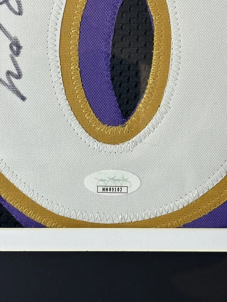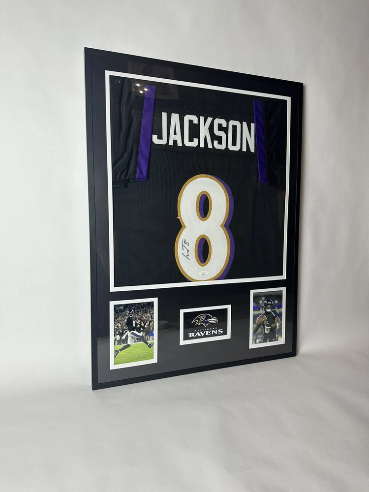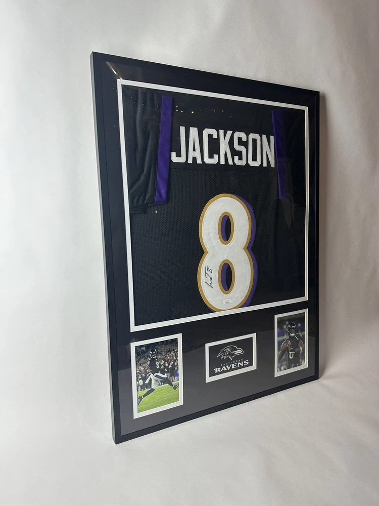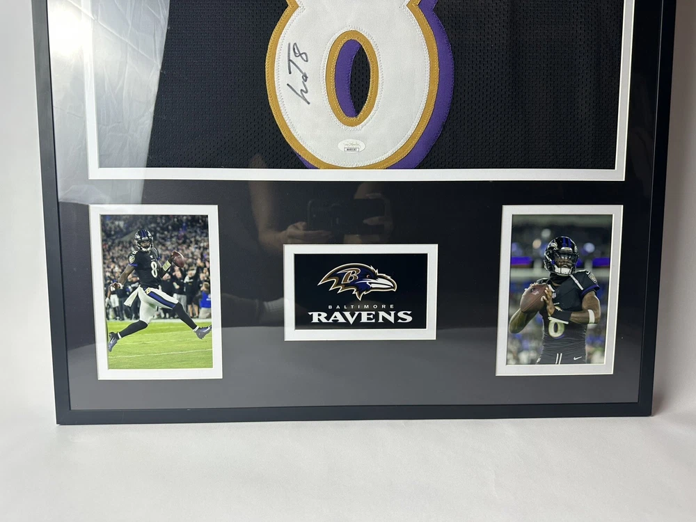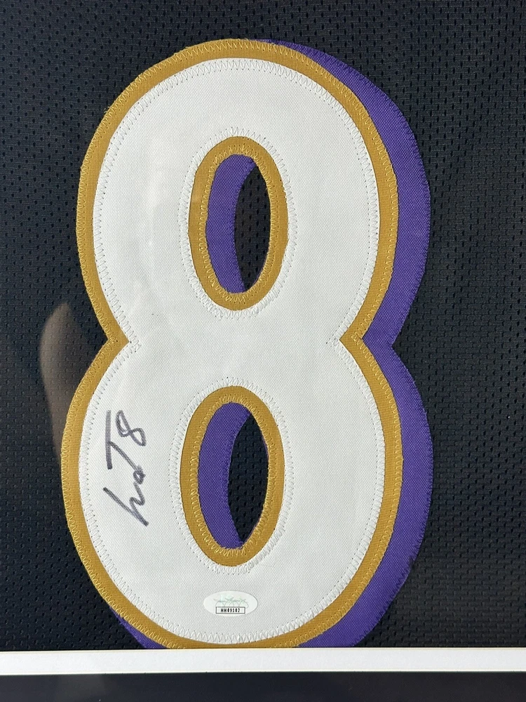 Own a piece of Baltimore Ravens history with this autographed custom jersey signed by Lamar Jackson. This authentic jersey comes framed and ready to display, with a JSA Certificate of Authenticity to ensure its validity. The signature is located on the front of the jersey, making it a must-have for any true football fan. This original piece is perfect for collectors or fans looking to add a unique touch to their sports memorabilia collection. Represent your team with pride and show off your love for Lamar Jackson with this signed jersey. The frame is 32”x24” in size.