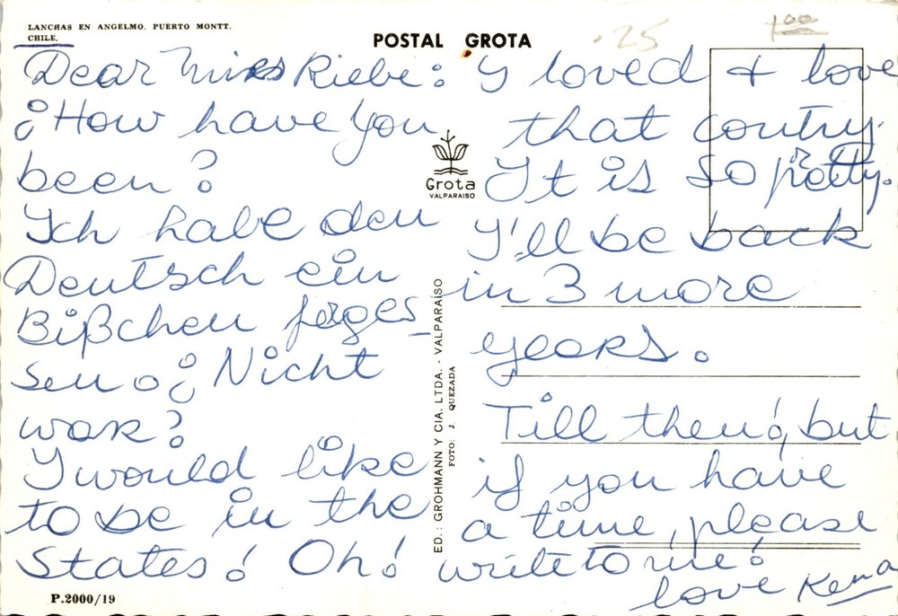 MAKE AN OFFER. THE MORE YOU BUY THE BETTER DEAL I WILL ACCEPT The postcard is written in a mix of English, German, and Spanish, sent from Puerto Montt, Chile, to someone named Miks Riebe. The sender expresses their love for Valparaiso and mentions being in Chile for three more years. The postcard also includes a mention of Grohmann y Cia. Ltda.