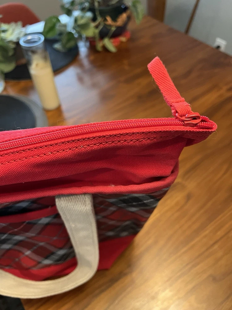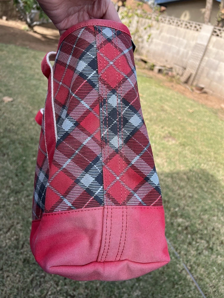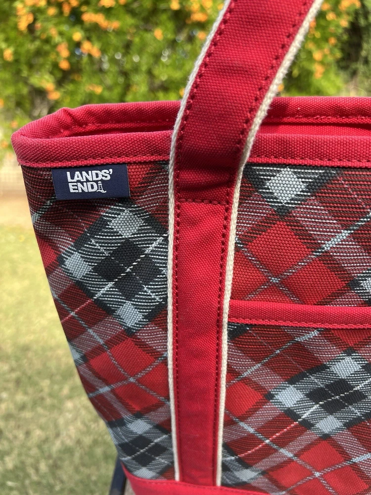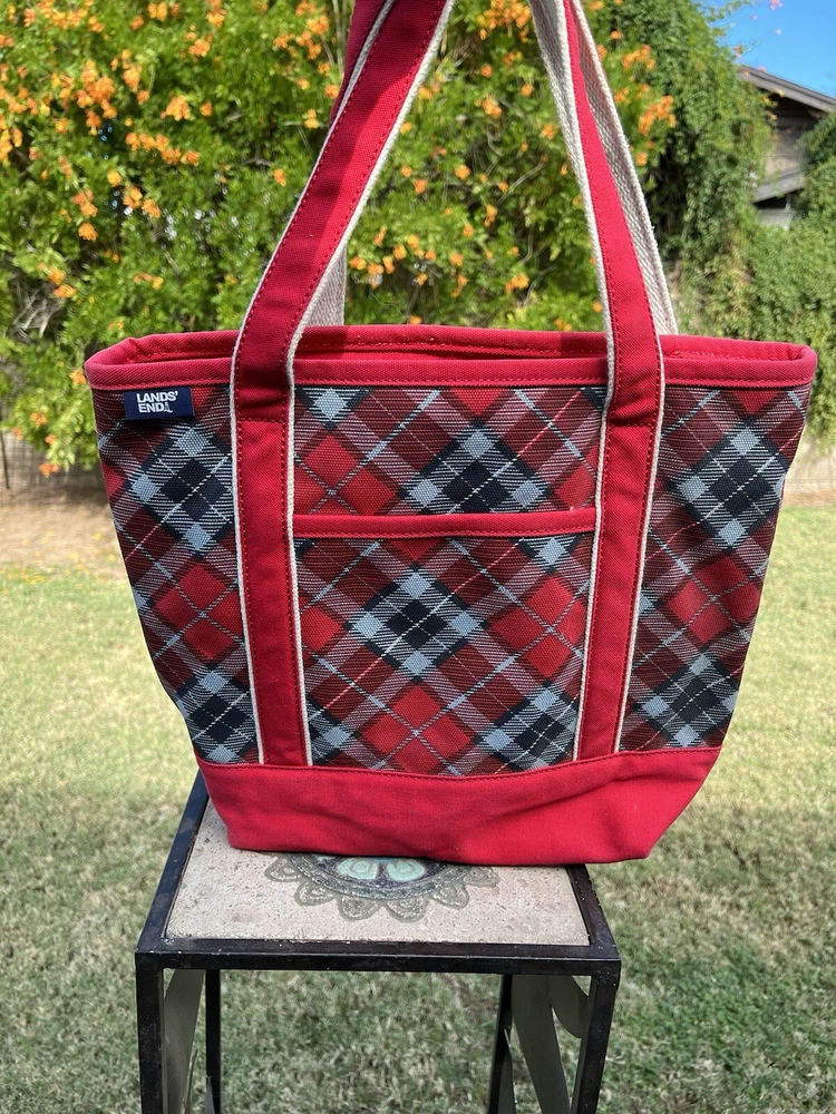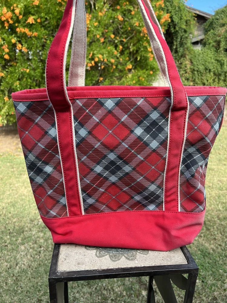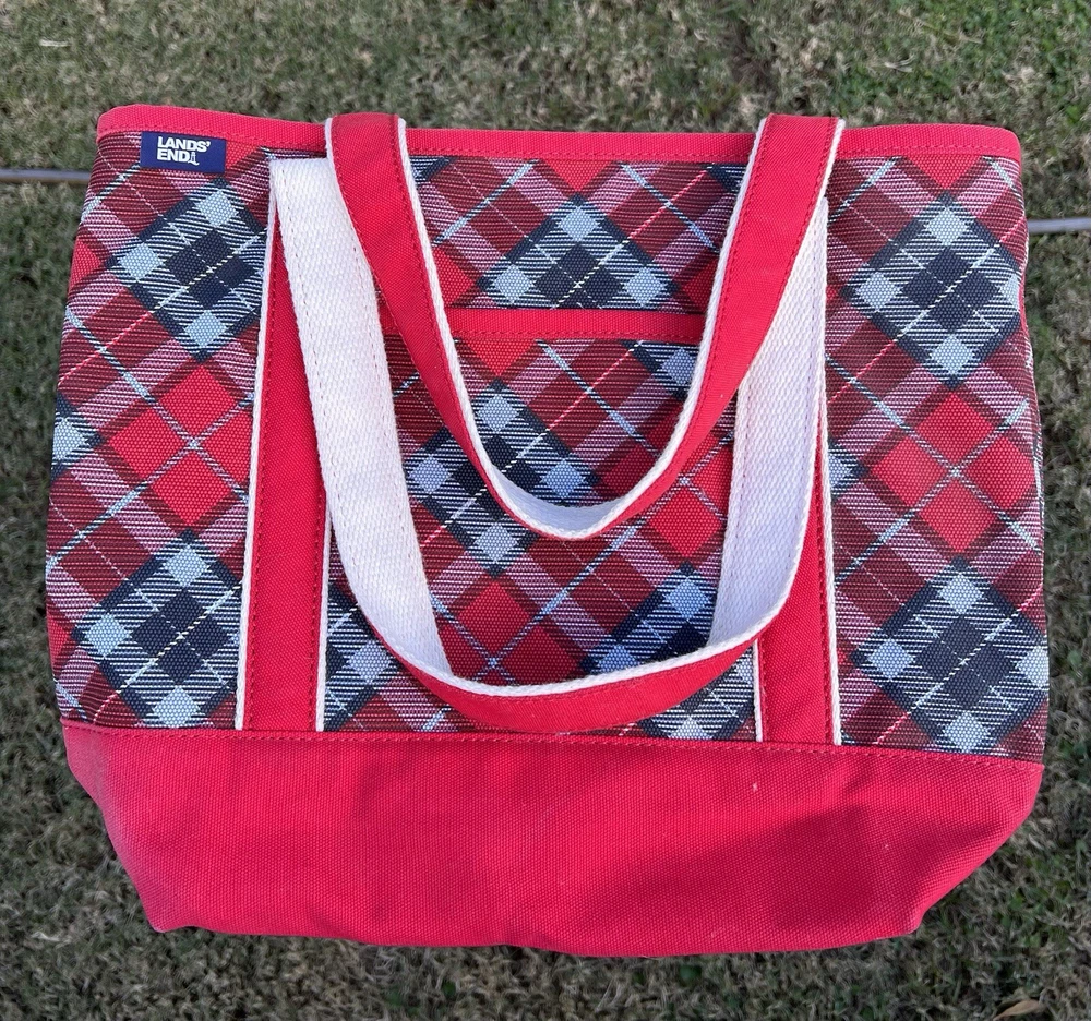 LANDS END Canvas Boat Tote Bag Zip Top Red Plaid