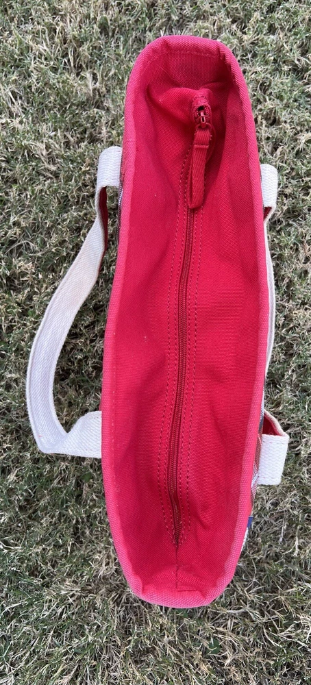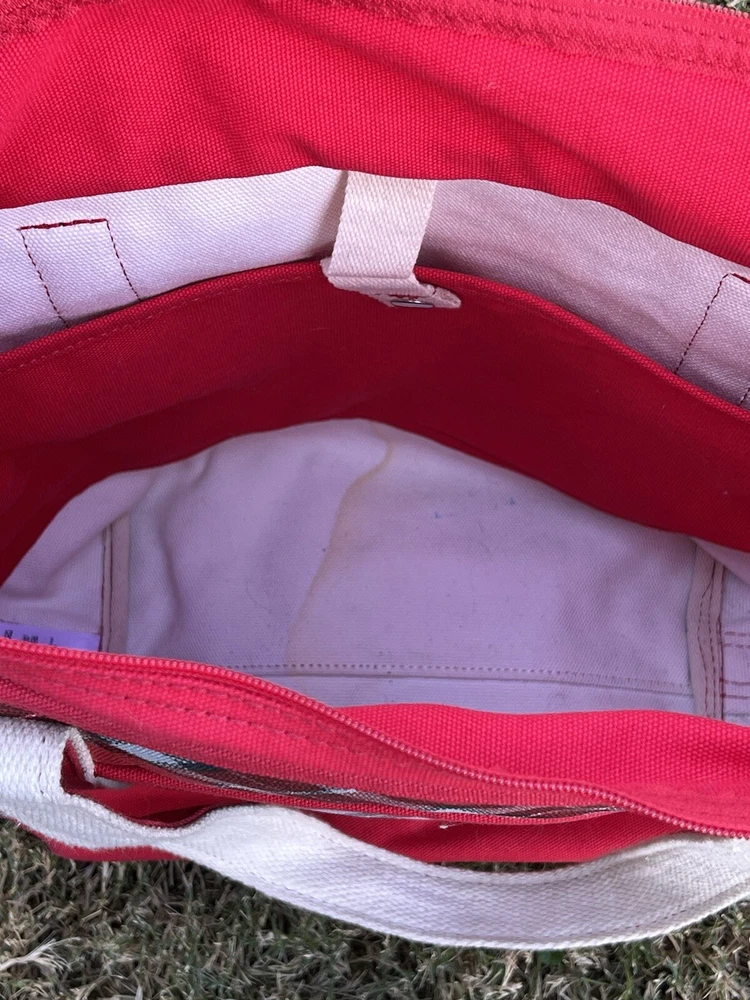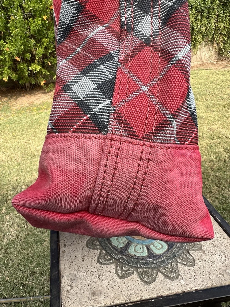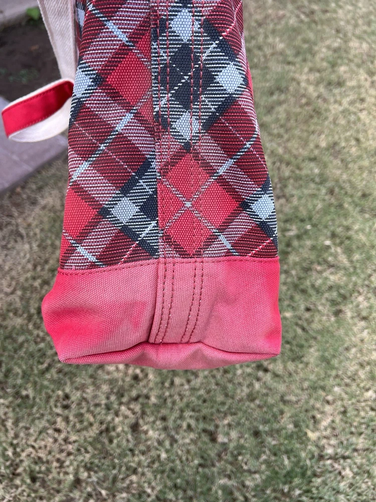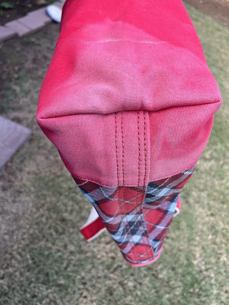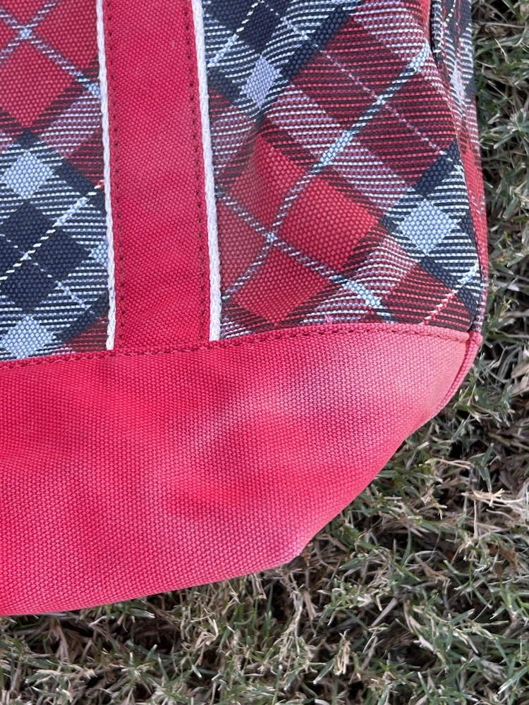 LANDS END Canvas Boat Tote Bag Zip Top Red Plaid