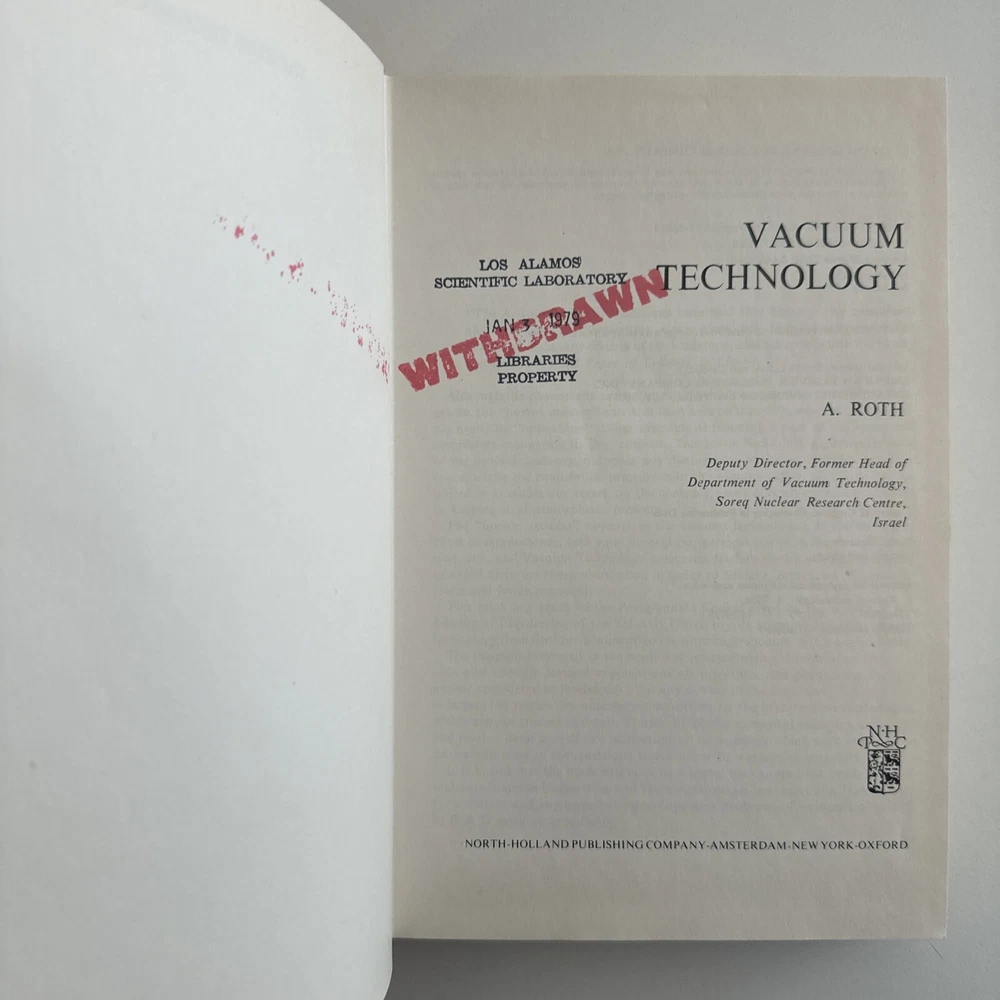 LANL Copy! Vintage 1978 Vacuum Technology by Roth (Soreq) HC 1st Ed 2nd Print