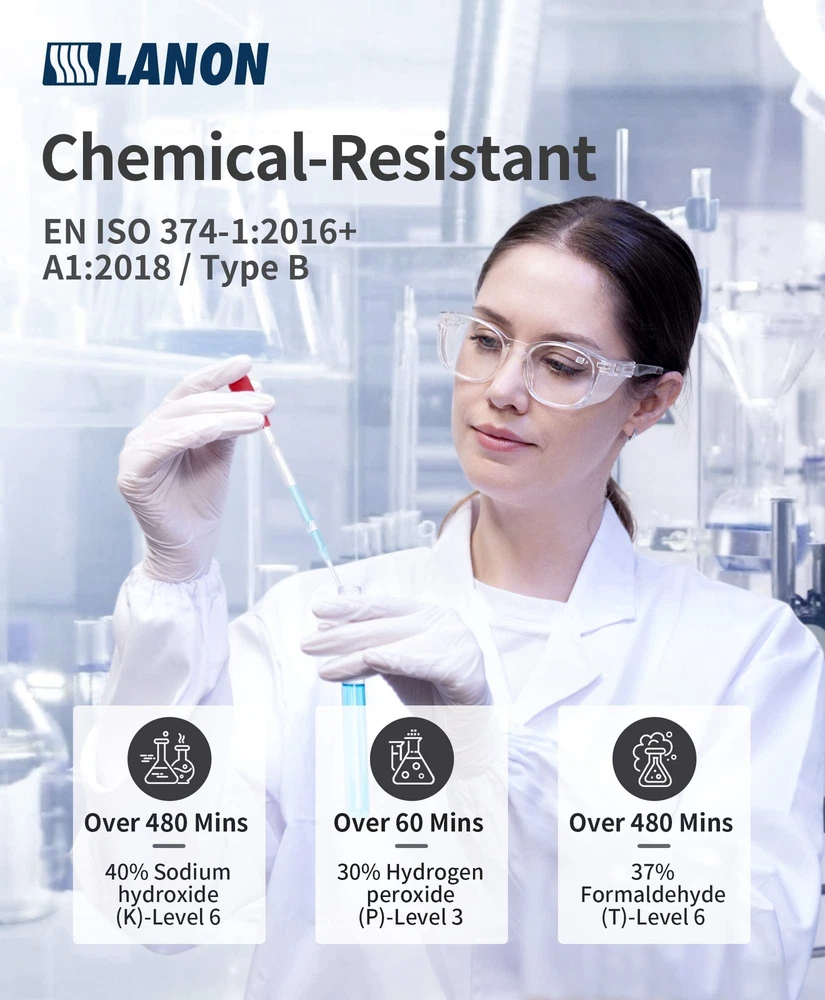 Specification: Brand: LANON Protection Material: Nitrile Color: Brilliant White Thickness: 3 mil Grade: Food Contact Grade Finish: Latex Free Style: Multi-Purpose Hand Compatibility: Ambidextrous Use Type: Disposable Package Included: Box of 100 Warning & Cautions: 1. Don't use these gloves as chemical resistant protection. 2. Don't use these gloves as heat resistance protection. 3. Don't use these gloves as cut resistance protection. Because of manual measurement, please allow slight deviation for the measurement. Latex-Free & Food Safe - The white nitrile disposable gloves are made of the 100% highest quality nitrile materials, latex-free, DEHP-free, and meet F.D.A 21 C.F.R, suitable for contact with all food types, and a better solution for people with sensitive skin. Durable & Comfortable - 3.5g lightweight construction provides a balance of strength and sensitivity. It's the strongest form of nitrile gloves, better than plastic, vinyl, or latex. We offer small, medium, large, and xl sizes for a snug fit and greater comfort — ideal for food handling, cooking, food prep services, cleaning, kitchen, and more. Ultra Grip - As disposable work gloves, the textured fingertip design provides great gripping strength, particularly when working in wet or oily conditions, and doesn't slip easily. Chemical-Resistant - The disposable nitrile gloves are powder-free, silicone-free, and non-sterile, tested to EN ISO 374 Chemical-Resistant. It's waterproof and resistant to a variety of low-concentration oil grease, light solvents, brake cleaner, and light and high-purity solvents, such as household detergent stain remover and other cleaners. Next-Level Performance - EU Certificated, CAT III, with Standards EN ISO 374-1:2016+A1:2018 / Type B, EN 374-4:2013, EN ISO 374-5:2016. The three EN ISO 374 test chemicals: K-Level 6, over 480 min; P-Level 3, over 60 min; and T-Level 6, over 480 min. The rolled cuff is easy to wear and remove, prevent tearing during donning.