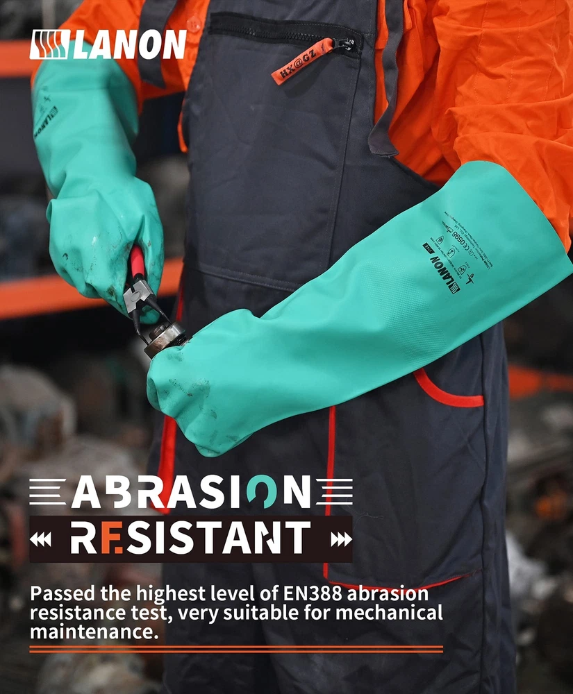 Specifications: Brand: LANON Protection Material: Nitrile Color: Green Length: 18 Inches Style: Multi-Purpose Hazard: Heavy Duty Use Type: Reusable Washing Way: Machine Washable (Air Dried) Maintenance & Cleanup: 1. The gloves can be hand washed with neutral detergent and running water. If machine washed, please do not put them into the dryer, just air dried. 2. The nitrile gloves should be stored at low temperatures, in a dry and dark place. Cautions: 1. Don't use with chemicals without prior trials other than oil/grease tested. 2. Don't wear sharp ornaments like the diamond ring and other jewelry in case of a scratch. 3. Keep away from sharp items like needles and toothpicks in case of a puncture. 4. Don't use nitrile gloves as heat resistance protection. 5. Don't use the gloves in solvents. DURABLE MATERIALS - The ergonomically shaped reusable work gloves are made of premium nitrile, have excellent elasticity and durability, offer high resistance to chemicals, acid, alkali, solvent, and mechanical risks, also can maintain the high performance for the oily environment. LONG SLEEVE PROTECTION - The 22Mil (0.55 millimeter) thickness unlined heavy duty gloves are very soft, easy to pull on and off. The amazing flexibility of these long sleeve 18 inches gloves is the most notable feature, provide effective barrier protection for wrist and ebow from splashes, abrasives and dangerous chemicals. GREAT GRIP - The non-slip particle textured palm chemical resistant gloves offer good grip to grab the wet and greasy parts. They passed the highest level 4 (at least 8000 cycles) of abrasion resistance test, level 1 (1.2 index) of blade resistance test and level 2 (60 newton) of puncture resistance test. MULTIPURPOSE - The NBR work gloves are latex free, better solutions for people with sensitive skin. They are ideal for handling chemicals industry, petrochemical, mechanical manufacturing, mining, agriculture, farm, gardening, construction, automotive industry, forestry, car washing, household cleaning and more. CERTIFICATIONS - LANON industrial gloves for hand protection are certificated by CE 0598 CAT III, with Standards EN 388:2016, EN 420, EN ISO374-5:2016, EN ISO374-1:2016/Type A, and meet CA Prop.65 regulations for phthalates.
