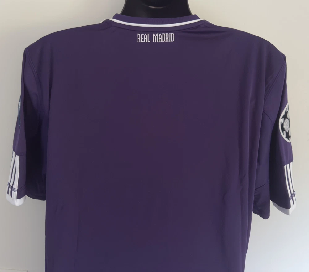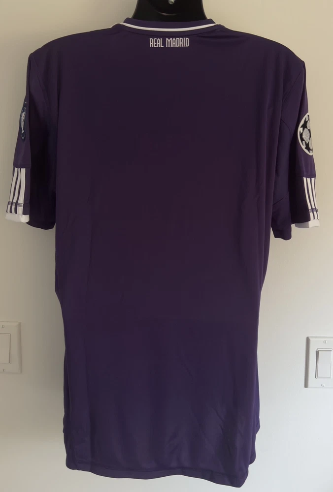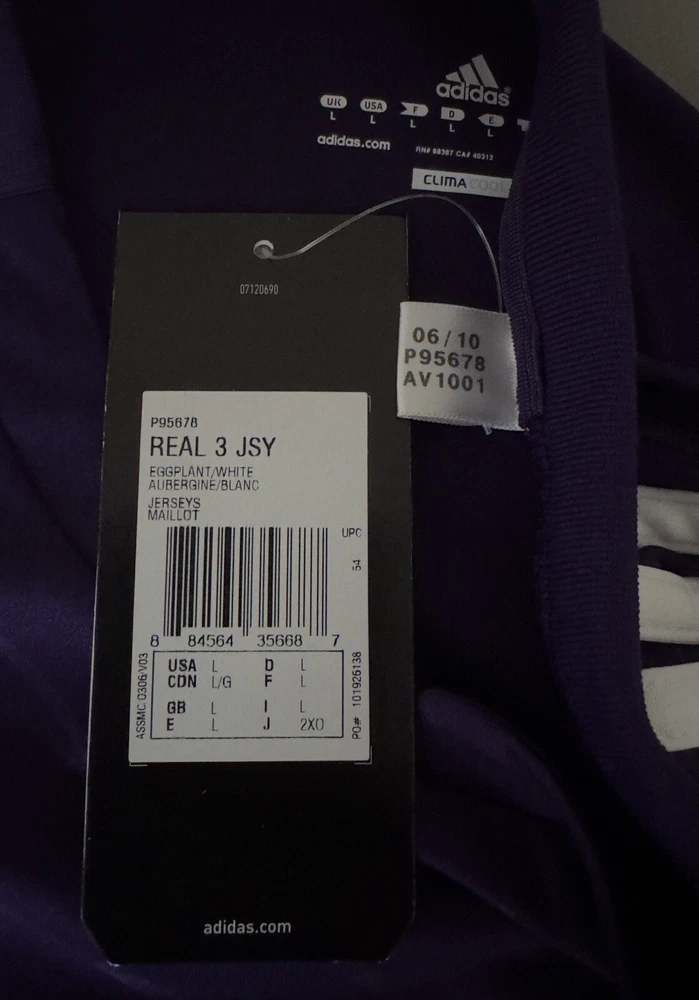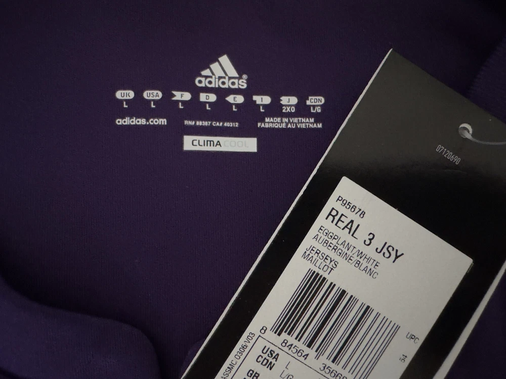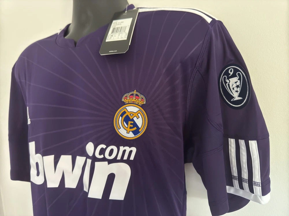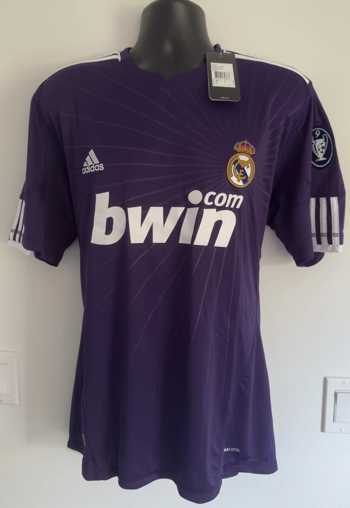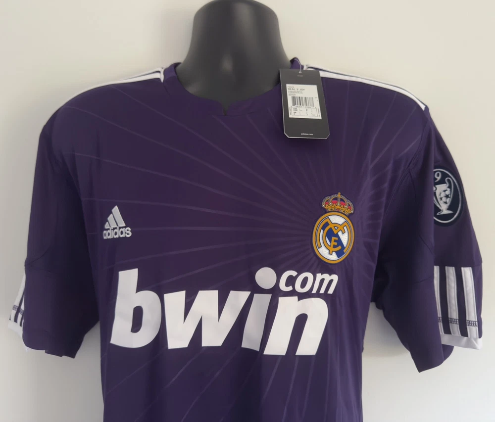 LARGE BNWT Real Madrid 2010/11 Third Jersey Shirt 10/11 3rd Top Kit Ronaldo Era. Dispatched via Canada Post. Authentic Real Madrid FC X Adidas product. Product code: P95678 Brand new with tags condition. No stains, holes, marks or other blemishes on the fabric. The shirt has been stored out of direct sunlight to avoid any heat related damage. The Bwin shirt sponsor has a slight blue mark on the right side of the 'n' as shown in image 13. There are no marks other than this. The sponsor shows no peeling or cracking. Adult size Large (L). Pit-to-pit measurement is approximately 23 inches. Shoulder-to-hem measurement is approximately 30 inches. Official Champions League Star Ball patch on right sleeve. Official Champions League Trophy (9 times winners) patch on the left sleeve. The patches are the official flock material and have been professionally applied. They show no peeling or other signs of wear. All pictures are my own and are of the exact shirt you will receive. All available items ship from a pet-free and smoke-free environment. All purchases will be packed securely and shipped the next working day.