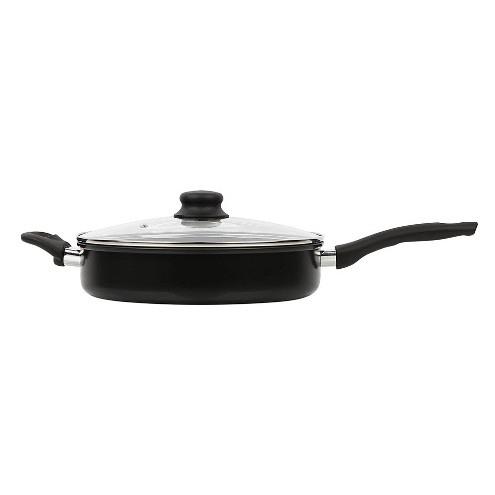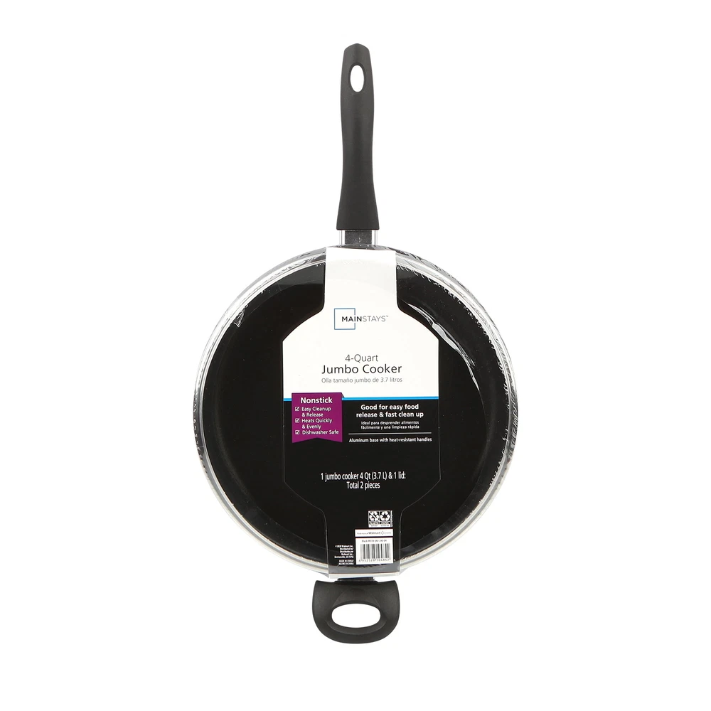 The Mainstays 4-Quart Non-Stick Jumbo Cooker with Glass Lid is ideal for everyday, multi-use at home. The jumbo cooker heats quickly and evenly with its aluminum body and the two layers of non-stick interior coating makes it easy to cook with and easy to clean up. Cool touch handles, securely attached with robust rivets, offer easy and comfortable handling. It's great for cooking your favorite one-pan meals, whipping up a serving of pan-fried chicken, or making a breakfast scramble for a delicious and hearty breakfast. It's dishwasher safe, but hand washing will prolong the life of the non-stick coating. Update your kitchen essentials with the Mainstays 4-Quart Non-Stick Jumbo Cooker with Glass Lid. Build your kitchen from the ground up with all the cookware, bakeware, tools, dinnerware and other items you need to create a useful cooking and dining arrangement. The Mainstays kitchen collection focuses on colorful and decorative design applied to simple basics, keeping your daily life vibrant and efficient. This category includes such a wide variety of products that you may want to make a list of the kitchen items you need and use the product filters on the left side of the page to browse more efficiently. This way, you'll get to see all the relevant Mainstays kitchen products in each subcategory to find the best match for your lifestyle. Mainstays 4-Quart Non-Stick Jumbo Cooker with Glass Lid, Black Cool-touch handle provides a comfortable grip 4 qt capacity is ideal for everyday Suitable for all cooktops except induction Riveted handle for strong connection Non-stick coating for easy cooking and clean up