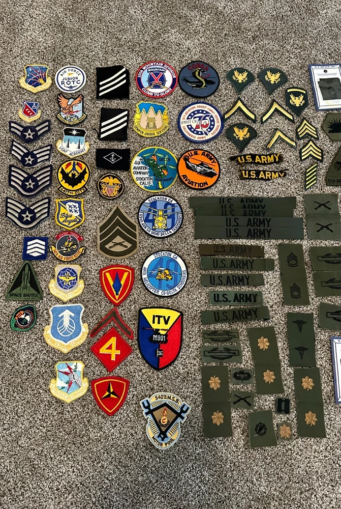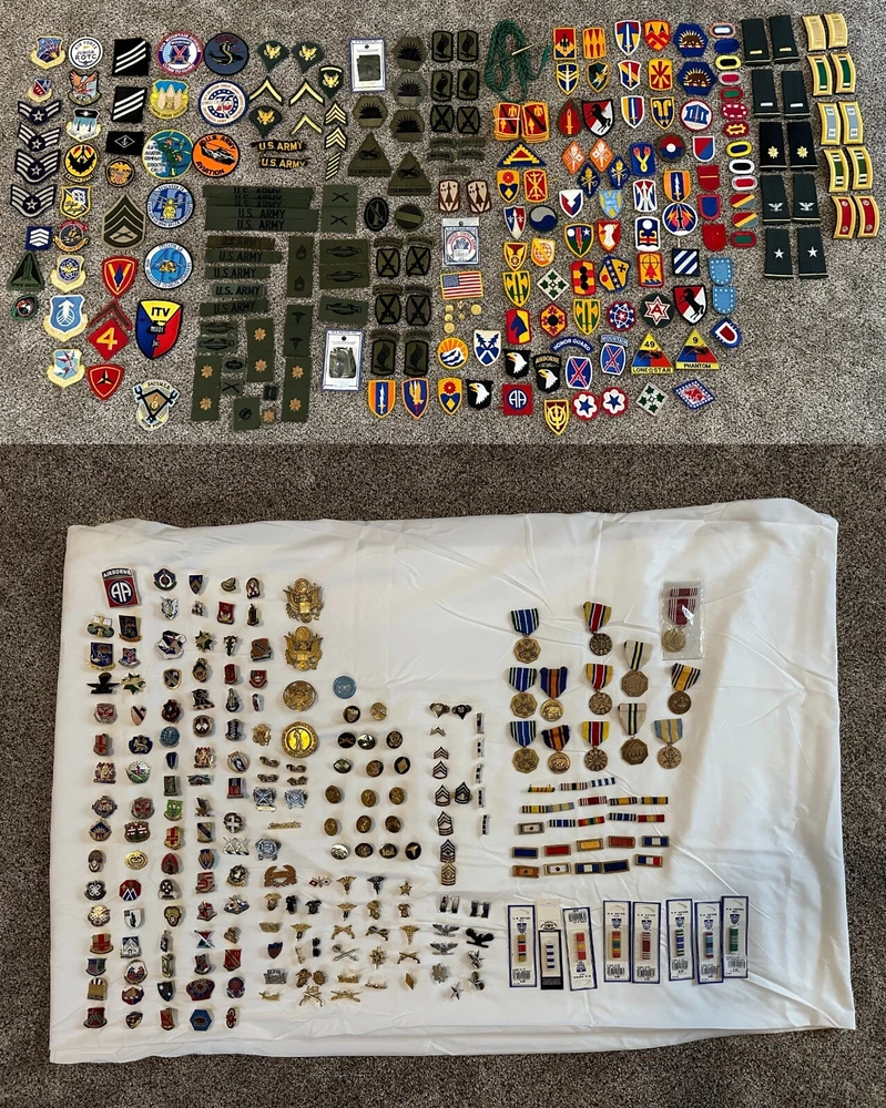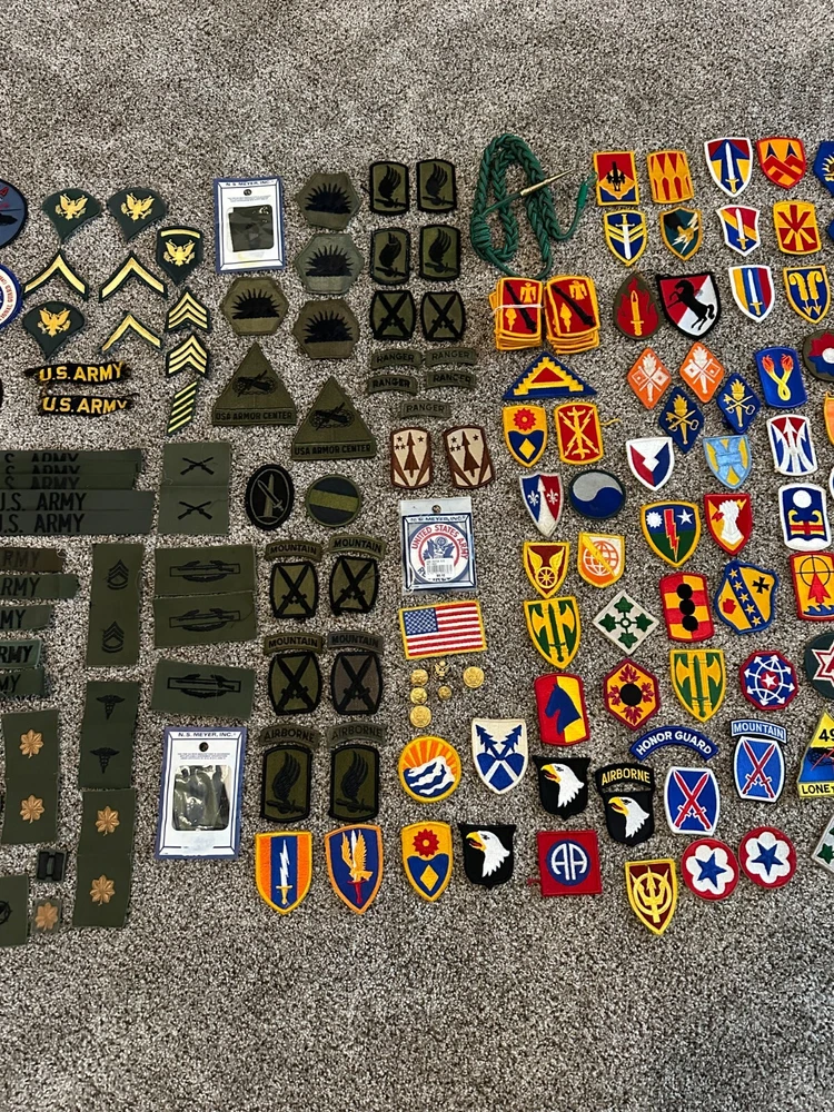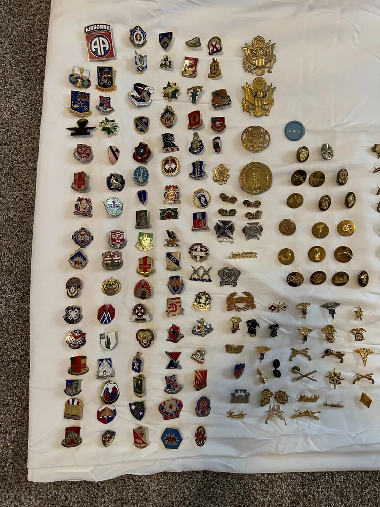 I have collected patches and insigniafor over 40 years, and I am restructuring my collection, and this representsitems that are duplicates or that I no longer collect. There are over 400 itemsincluded and there are few duplicates. Much of this has been in a footlockerfor the last 20-30 years. Most people in my family, including myself, served inthe Army and a some of these came directly from our uniforms over the years (allthe officer rank dress epaulets were worn by myself, my brotheror father) - I just have so many duplicates. Perfect for collectorof militaria or dealers. Included in the lot are shoulder sleeve insignia (SSI),distinctive unit insignia (DUI), Class A uniform office rank epaulets, dressblue uniform office rank epaulets, enlisted & officer branch insignia, hatand collar insignia, etc. Don't miss this opportunity to get so much history in oneplace.