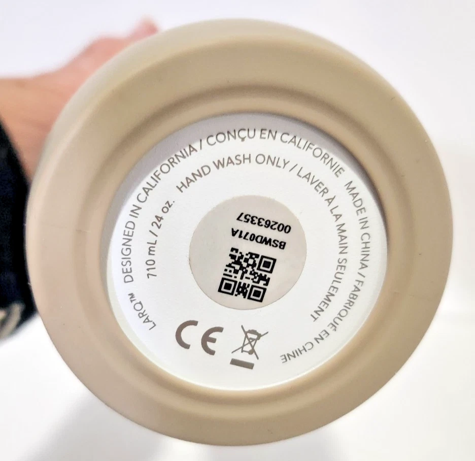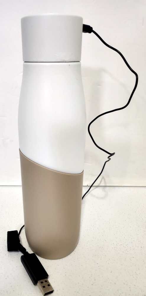 The LARQ Water Bottle is a 24-ounce stainless steel bottle in beige & white. It features a self-cleaning purification system using UV-C light, is insulated, lightweight, and BPA-free. Keeps water cold for 24 hours and hot for 12 hours.The set includes the water bottle with a screw-on lid and a charging cable. It is reusable and refillable, making it ideal for outdoor activities like camping, hiking, or sports. There is some scratches on the bottom edge of the lid. See picture #6. Manual available online for download.