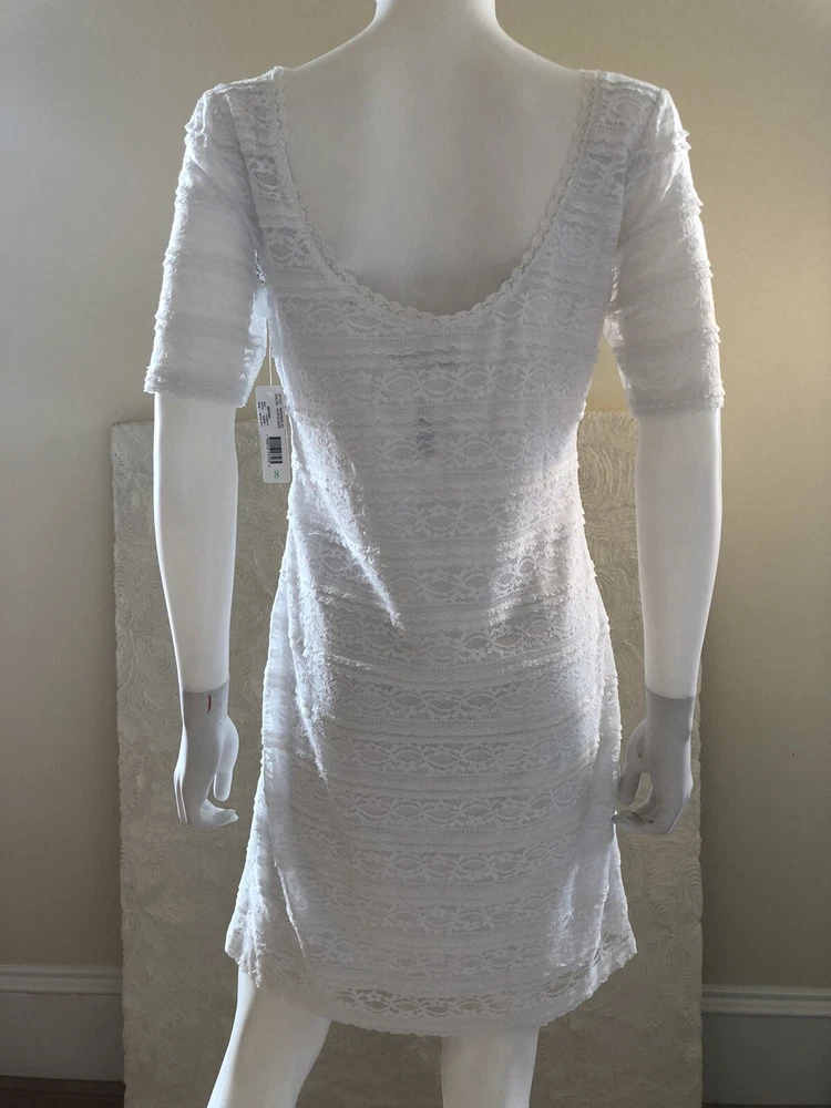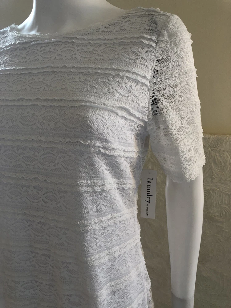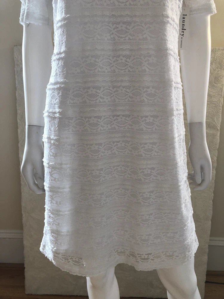 NWT Laundry by Design White Lace Pencil Dress 8 item details: shaped fit, scoop back, elbow sleeves, lined, stretch size: Women 8 shoulder: 14 chest\underarm to underarm, doubled): 36 sleeve\seam to sleeve edge: 12 waist\seam to seam across waist, doubled: 34 hip: 39 length/collar seam to hem bottom:35 condition: NWT Condition; No Flaws to Note condition rating: 1 Condition Rankings: NWT = Brand New, tags still attached, never used. Mint Condition = Item may have been used, but shows no signs of wear. Excellent Condition: Used, but with minimal signs of wear. Very Good Condition: Used and shows moderate signs of wear, may need repairs, and is sold As Is. Fair Condition: Item is showing significant signs of wear, may need repairs, and is sold As Is. PLEASE NOTE: Most of our items are pre-owned or vintage. Items will not be in new condition, unless otherwise noted. We carefully inspect each item for flaws prior to listing and will note flaws as needed. Condition Ratings: 1 = New/Unused Condition; 2 = Pre-Loved/No Flaws to Note; 3 = Pre-Loved/Mild Signs of Wear; 4 = Pre-Loved/Needs Repairs or Shows Significant Wear/Flaws *Measurements Taken in Inches