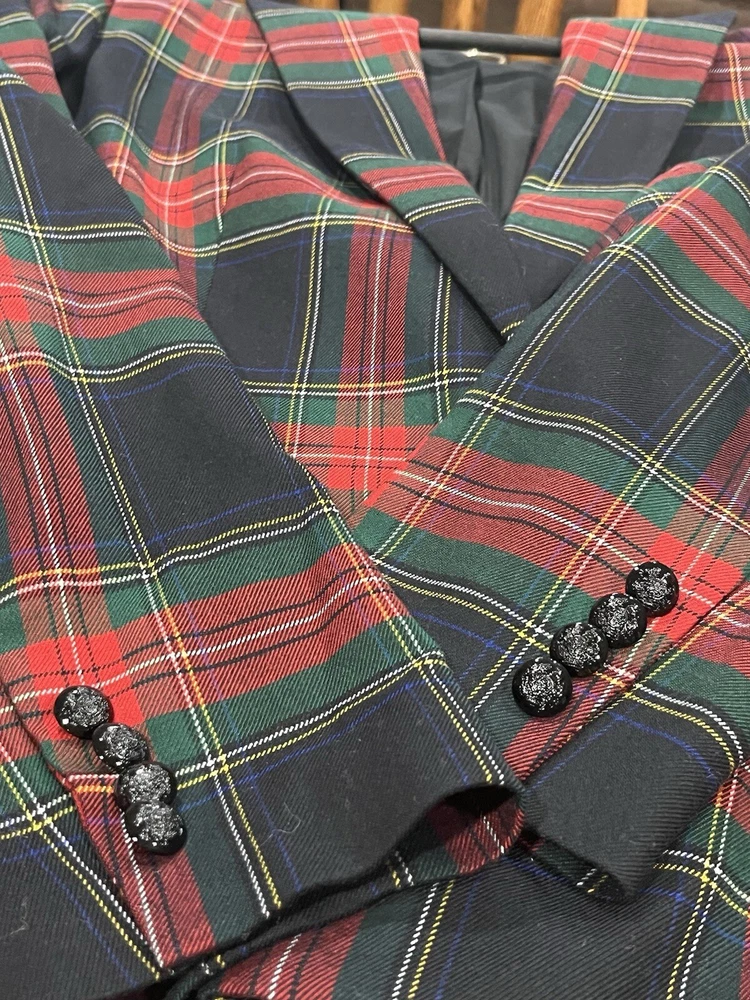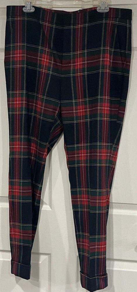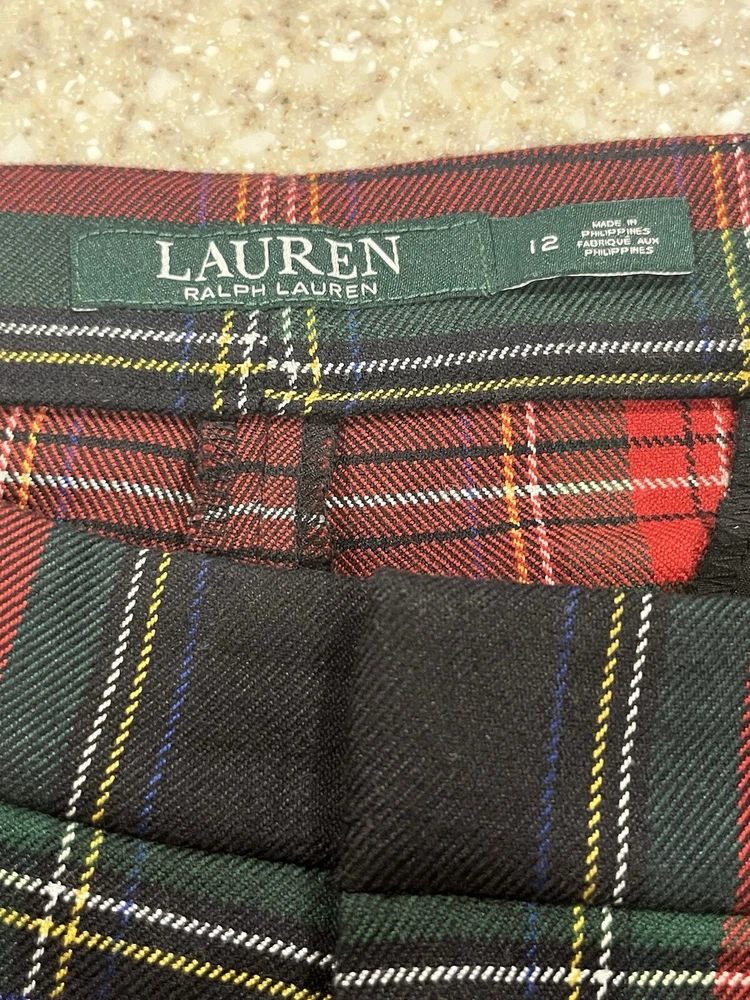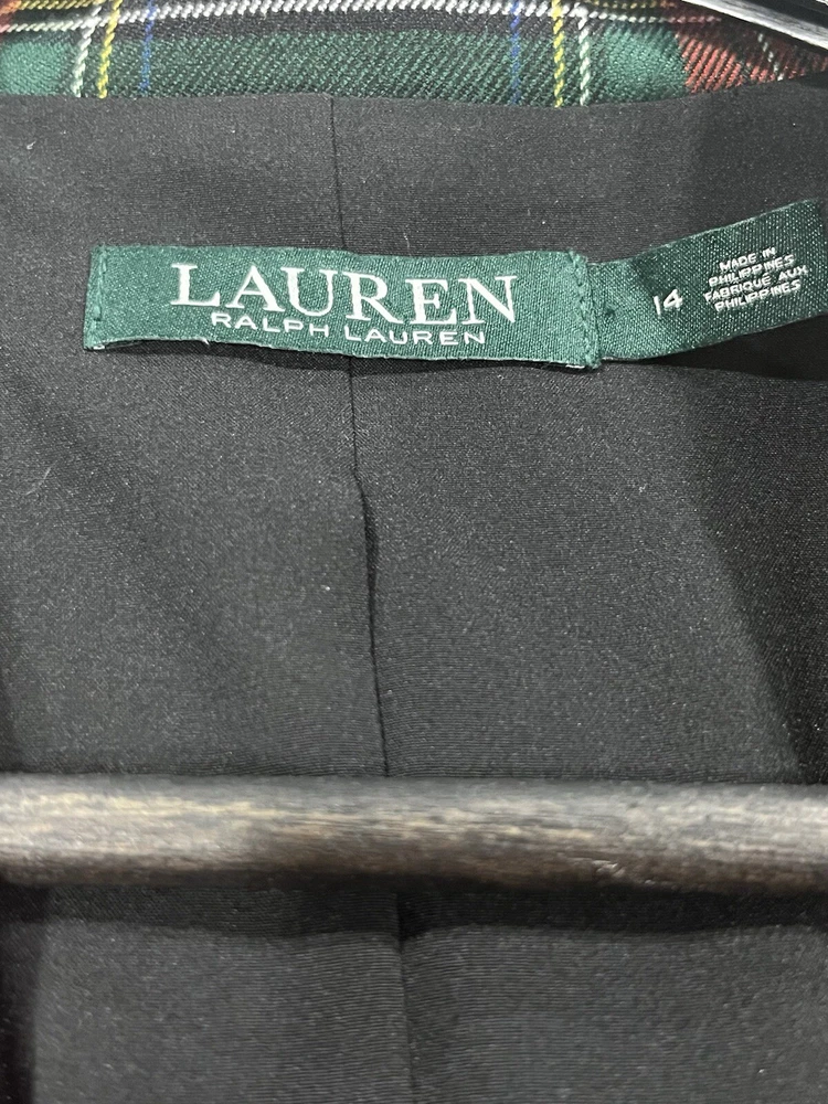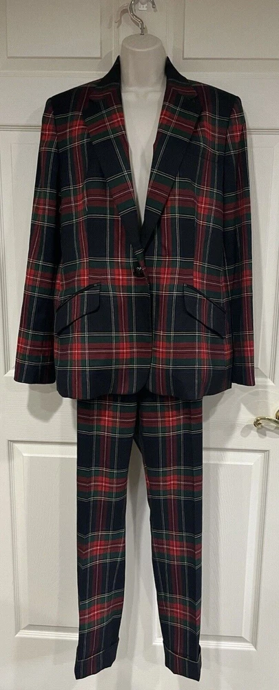 LAUREN RALPH LAUREN Women Size 12/14 Red Tartan Plaid 2 Piece Set Jacket: Size 14 Regular Fit. One button on front, two outside pockets that are sewn shut, 4 buttons on cuffs of sleeves, notch lapels, shoulder pads. Back center vent. Dry clean only due to lining. Inner sleeve length 17, outer sleeve length 25", length from center back of neck to hem 28". Pants: Size 12 Regular Fit. Ankle length. Inseam 28". 2 Front pockets, 2 back pockets (that are currently sewn shut). Items come from a smoke free, and pet free home.