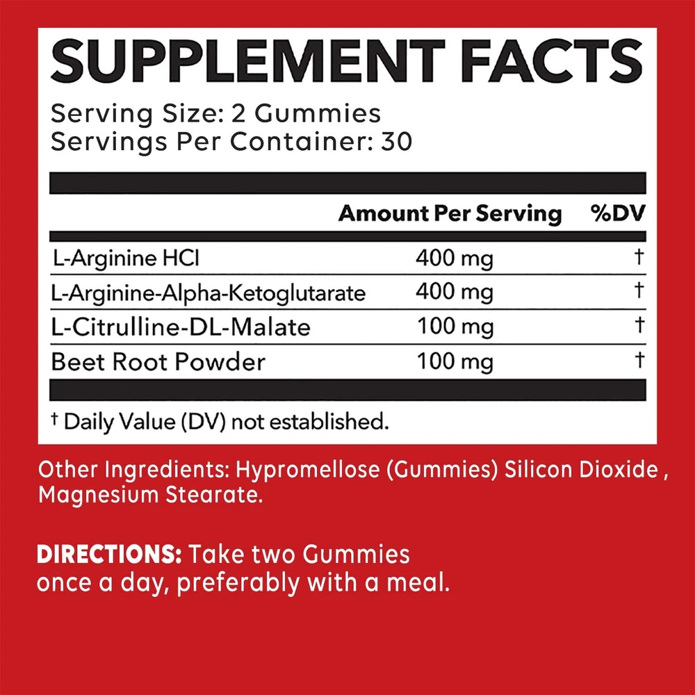 Effects: Energy & Endurance, Men's Health, Testosterone Booster Ingredients: L-Arginine Directions: Take 2 gummy twice a day after meals. Shipping: Ships within 48 hours on working days. Shelf life: 2 years Description: L-Arginine is an essential amino acid often used as a post-workout nutritional supplement and is specially formulated to improve overall circulation. As we age and stress increases, we know it can be difficult to hit a fitness plateau; our L-Arginine Gummies can help you gain the stamina you need for longer workouts. In addition to this, our gummies can also help increase your endurance, performance and improve your circulation, acting as a testosterone booster to enhance performance. Our gummies are free of preservatives, chemicals, and artificial ingredients, so you can trust you're using a quality product! Every batch of products undergoes rigorous third-party testing. Document