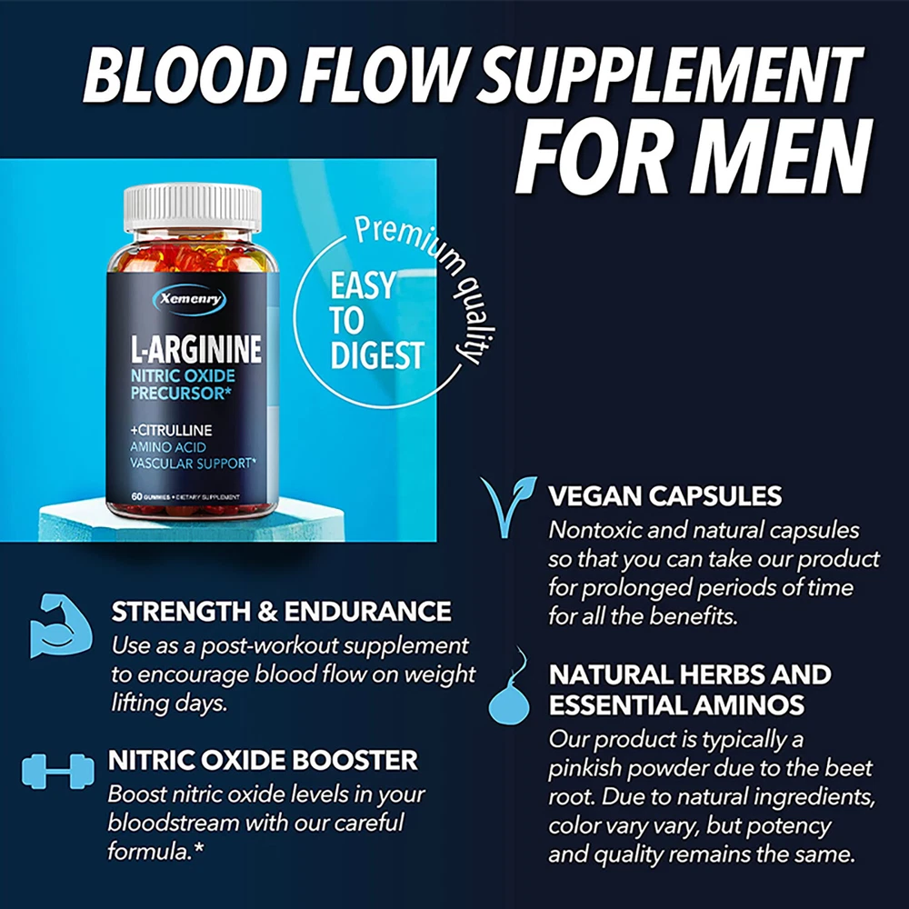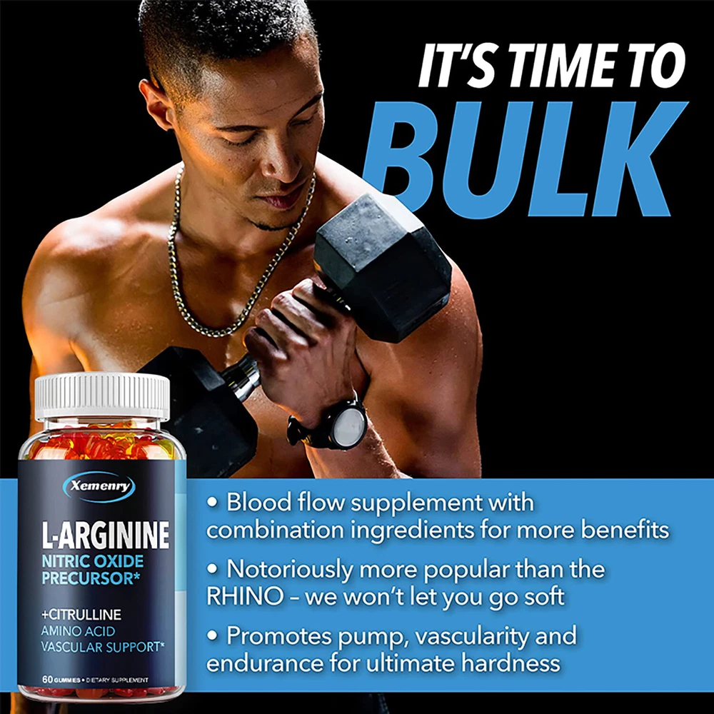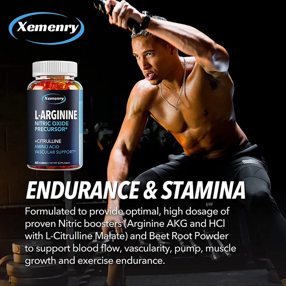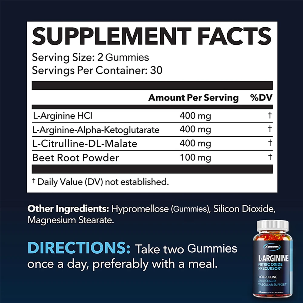 Effects: Energy & Endurance, Men's Health, Testosterone Booster Ingredients: L-Arginine,L-Citrulline,Beet Root Directions: Take 1 gummy twice a day after meals. Shipping: Ships within 48 hours on working days. Shelf life: 2 years Description: Enhance your physique and performance with our L-Arginine L-Citrulline supplement. Increased Nitric Oxide helps maximize your workout results! L-Arginine L-Citrulline supplement, including L-Arginine, Citrulline Malate, and Beetroot. This Nitric Oxide supplement for men helps improve athletic performance, healthy circulation, and cardiovascular support. L-Arginine Citrulline acts as a muscle pump supplement. It helps relax and dilate during your workout, providing nutrients to your muscles and creating a near-perfect environment! Document