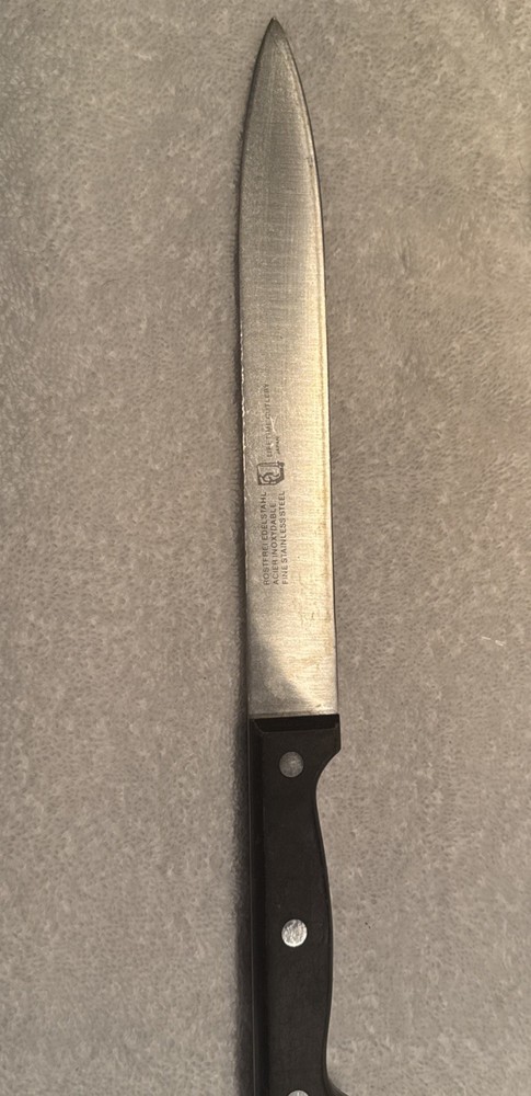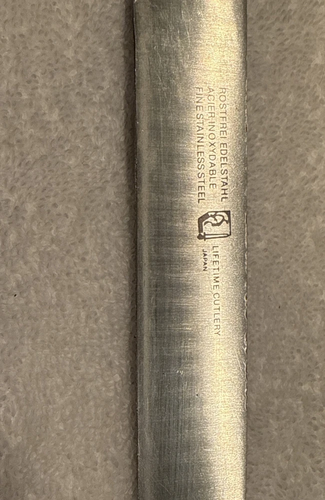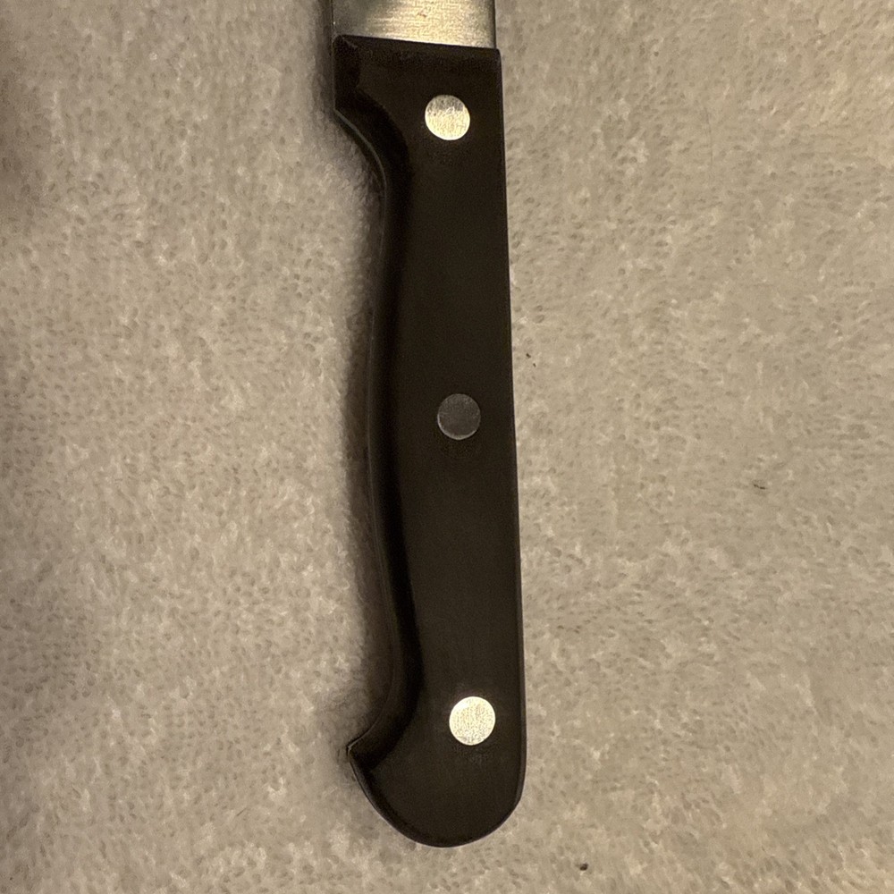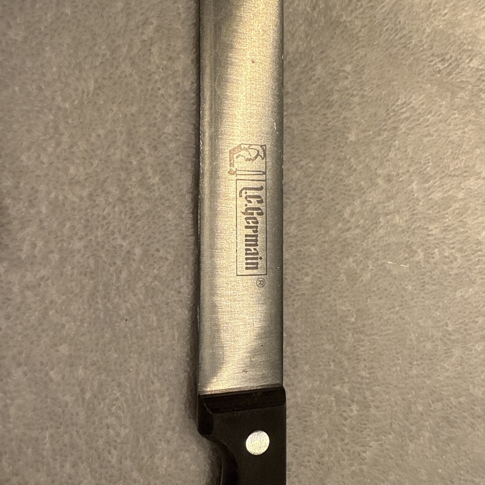 The LC Germain Utility Knife is a high-quality kitchen tool with a sleek black design and a fine stainless steel 8" blade imported from Japan. The knife features a straight edge and a wood handle for a comfortable and secure grip. This single utility knife is ideal for various cutting tasks in the kitchen, making it a versatile and essential addition to any kitchen arsenal. See photo used buyer to pay $6.95 shipping