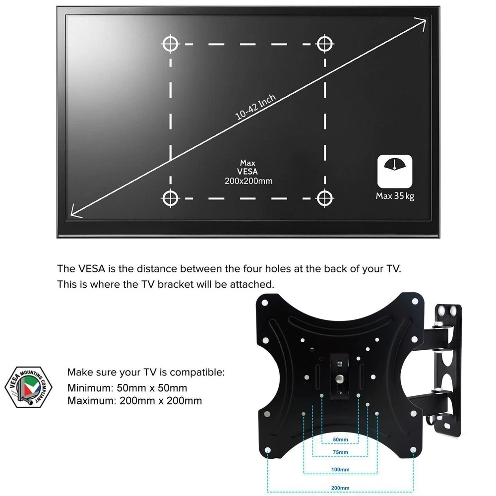 17-42 Inch TV Rack Monitor Universal Rotating Telescopic TV Storages Rack Wall Mount Bracket Description : Do you want to catch up on that thrilling series while lying on the couch after work but just can't find the right angle to watch? Strain no more! This TV wall mount bracket will make sure you never miss a moment of your favorite program. With this bracket, your TV can tilt up or down and rotate 180° horizontally. This TV wall mount bracket is suitable for most of 17"-42" flat screen TVs. No more sore necks or strained eyes with this versatile TV wall mount. Will this mount fit your TV? 1. Check the VESA of your TV whether it is under 200mm x 200mm; 2. Check the weight of your TV whether it is lighter than 55lbs; 3. Check whether your TV is within 17" to 42"; Features: Reliable Quality: This heavy-duty bracket, made from premium cold-rolled steel, means your TV will stay sturdy and stable. It's designed for flatscreens TV's and can carry a load of up to 55lbs. You can be confident that your TV won't run into any "whoopsies" while viewing. Just install the bracket on the wall, mount your TV, and choose a corner to enjoy it. It's that easy! Full Motion for Optimal Viewing: Full motion Mount your TV on this bracket to watch your favorite movie at the most comfortable angle. With a 180° left to right range of motion and upward and downward tilt of +15~-15°, this TV mount puts your screen at the perfect position for you or anyone to enjoy. Flexible and Wide Application: The bracket can extend, tilt, and swivel, anyway you please. Fits flatscreen TV sizes of 17"-42" (for example: 17" 19" 21" 25" 29" 34" 37" 40" 42"). Save Space: This TV wall bracket has an adjustable wall space from 400mm. Planning to have company over for the evening? Simply retract the moveable arms to place into a fixed position to save space for your guests. Easy Installation: Step-by-step instructions and all the necessary hardware is provided, single stud installation simplifies the placement of the TV/monitor on the wall. Removable TV plate designed for single-person installation which helps you to install this TV wall mount without any hassle. Specifications: Type Full Motion TV Wall Mount Bracket Color Black Material 2.0 mm thick Cold-rolled Steel Suitable TV Sizes 17"-42" Load Capacity 25kg/55lbs Adjustable Tilt (-15 degrees, +15 degrees) | Swivel (-90 degrees, +90 degrees) Max VESA Mounting Pattern 200 x 200 mm (8"x8") Use for TV, Monitor, Projector, LCD, LED, OLED, Plasma Available VESA range: 200mm x 200mm (8"x8") 200mm x 100mm (8"x4") 100mm x 100mm (4"x4") 75mm x 75mm (3"x3") Package Included: 1 x Full Motion TV Mount Bracket 1 x Assembly Manual Payment Delivery details Return Contact us Feedback Payment We only accept the paypal payment methods. All major credit cards are accepted through secure payment processor PayPal.(* If you use e-check on PayPal, delivery may take longer, as we will hold your order until your e-check clear) Delivery details Item will be shipped within 2 business day after confirmed payment. (Not including weekend or public holidays) Please verify your address during checkout. We are not responsible for any wrong or undeliverable addresses. All items will be checked strictly before shipping and it will be shipped to your PayPal address. Estimated delivery time is 1-5 working days (Not including weekend or public holidays) Delivery times may vary particularly during peak periods or unexpected weather conditions. In event of a very unlikely slight delay, your patience would be highly appreciated. We do not provide pick up or local collection service so far. Return We accpet return within 30 Days of dispatch. For exchange buyer MUST return the defective item for 1 to 1 exchange, return cost due to buyer. For free shipping means we paid the shipping fee on your behalf, that fee will be deducted. In case return cause by wrong buy, return postage will be at buyer side also. Please contact us immediately about any your return before shipping back the Once the item has shipped the regular return policy applies. Notifying us ahead of time will help us to ensure that your return is dealt with promptly upon arrival. Contact us We guarantee 100% Buyer Satisfaction. We are increasingly expanding international markets based on high quality products, excellent service, reasonable priceboas and timely delivery. Please contact us at any time for more information.We work hard to make sure EVERY CUSTOMER 100% approvingly. Feedback Very appreciated for your support. I hope you are happy with your purchase. We maintain high standards of excellence and strive for 100% customer satisfaction! Feedback is very important to us. We request that you contact us immediately BEFORE you give us or feedback, so that we can satisfactorily address your concerns. If you have any problem, please feel free to contact us via ebay message, we will reply your email within 24 hours (except weekends and holidays). We will do our best to solve your problem as soon as possible. We appreciate your continued patience and willingness to work with us. Thank you for choosing us and have a great day! Type Brackets Style/Adjustment Tilt & Swivel Fits TV Screen Size Up To 42" VESA Hole Pattern 50 mm x 50 mm, 75 mm x 75 mm, 100 mm x 100 mm, 200 mm x 200 mm Color black Brand Unbranded MPN Does Not Apply