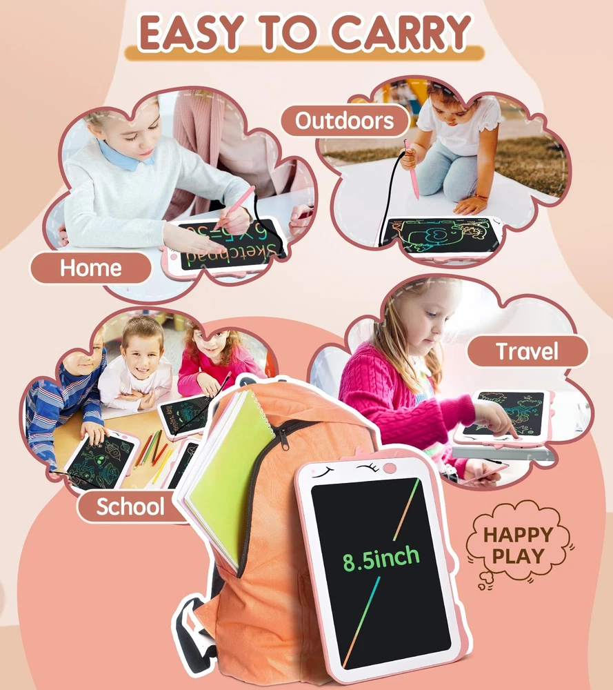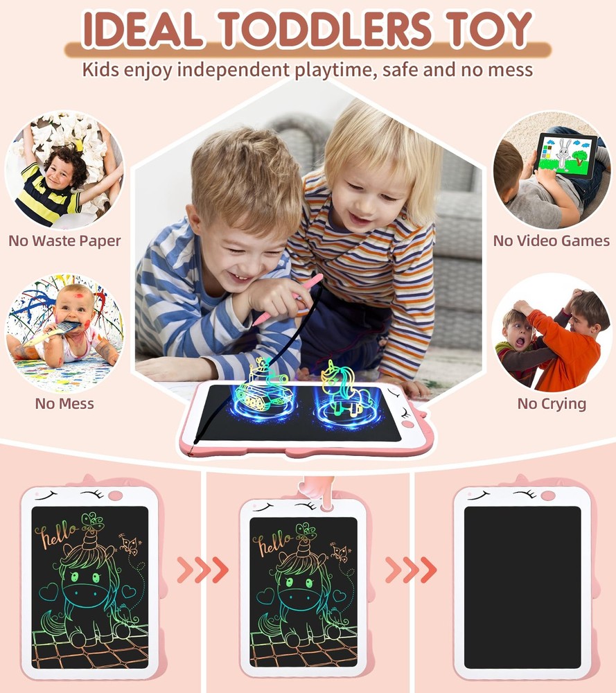 Product Name: Toddler Writing Tablet Material: Flexible Screen + ABS safety material Dimensions: L " x W " x H " Weight: 0.78 lbs writing tablet are great non-screen time form of entertainment for kids ages 3-8. If you want your baby can draw independently and hope promote his baby's brain development. What sets this tablet apart from other drawing pads is the erase button. With just one click, the screen is cleared, providing endless opportunities for kids to start doodling again. This feature not only saves paper but also allows for multiple drawings without any mess. Not only that, It features a lock where you can't accidentally delete the screen and some very vibrant colors. The battery is sealed inside the backplate, safe and durable, easy replacement. Function: Visual Training: Bright colors allow babies to recognize different colors and train their cognitive ability to color. Hand Training: Toddler to draw certain things, such as airplanes, ducks, encourage your baby to do hand exercises, and exercise dexterity when making patterns. Imagination and Creation: Encourage your baby to use his imagination and creativity to create his own letters, numbers, and patterns. Keep Attention: Our products allow children to create different pictures again and again, making them the ideal toy to keep their attention. 【Unicorn Writing Tablet】As parent and grandparent, are you worried about your children make the mess of walls and floors while writing and drawing? Look here, our unicorn LCD drawing pad gives your baby the freedom to draw, keep your kids exciting and engaging for hours. Pad surface is sturdy and scratch-resistant, it will withstand rough handling by toddlers. It not only be used for drawing, writing, counting and gameing, but also be a office noteboard anytime, anywhere. 【Educational Learning Toys】The multi-functional doodle board is a good educational learning toy. It exercises your child's writing and drawing skills, inspire kids creativity, develop concentration and patience. In addition, baby's use tablet to doodling, writing, drawing, vibrant colors and free creative ways can stimulate your baby's interest in art, so it's learning and entertainment go-to toy for baby aged 2-7 years. 【100% Safe Toys】Every parent wants a safe and durable toy, our 8.5 inch unicorn writing tablet adopts the new low-energy consumption eye protection material screen, No Backlight, No Blue Light, No Eye Irritation. Better protect baby's eyesight. The shell and pen is made of safe and durable ABS material, rounded and soft edges, Burr-Free, Non-Toxic, Lead-Free, BPA-free, and meets CPC certification requirements. Mom's absolutely trusts safe toys! 【Easy Draw & Delete】 Ours screen adopts highly sensitive pressure sensing technology, according to the writing strength change the line thickness free. Writing surface has a good matte texture, stylus drawing is very smooth, let child easily show his art world. While just one click erase button, you can start a new creation instantly. What's more, It features a lock where you can't accidentally delete the screen and some very vibrant colors. 【Surprise Gift for Little Artist】writing board toddler toy as a fantastic gift for kids of all ages. Its simplicity, durability, and endless creative possibilities make it a great addition to playtime. Our drawing tablet is a great birthday, Christmas, Thanksgiving gift for boys and girls aged 2-5 years old. In addition, our toys can also be a great gift choice for children with autism and ADHD. 【Toddler Travel Toys】Ours writing pad is lightweight and right size for little hands, children can easily carry it anywhere. The pad doesn't take up a lot of space and pen can be tightly fixed behind the tablet, so it's easy to put in your bag make it a great toy to carry on road trips or trips. In addition, our writing tablet will keep child occupied for hours on road/car/plane travel!! Let parents and babies can enjoy the perfect travel time!