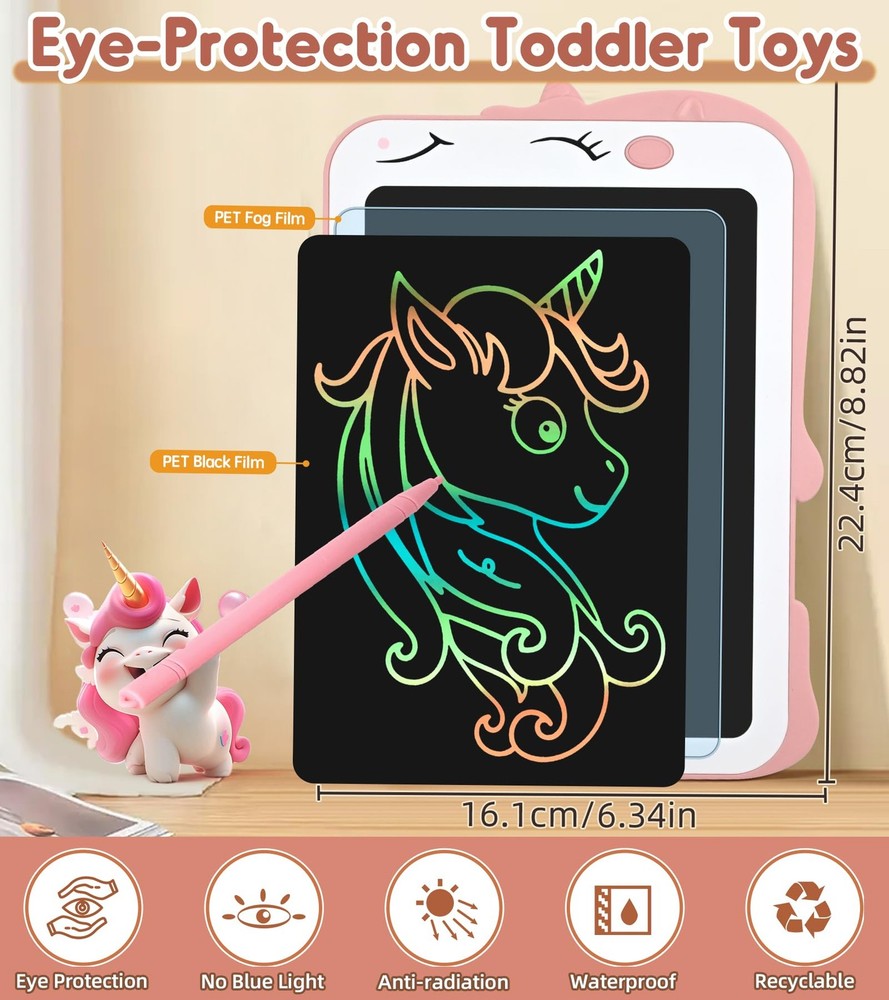 Product Name: Toddler Writing Tablet Material: Flexible Screen + ABS safety material Dimensions: L " x W " x H " Weight: 0.78 lbs writing tablet are great non-screen time form of entertainment for kids ages 3-8. If you want your baby can draw independently and hope promote his baby's brain development. What sets this tablet apart from other drawing pads is the erase button. With just one click, the screen is cleared, providing endless opportunities for kids to start doodling again. This feature not only saves paper but also allows for multiple drawings without any mess. Not only that, It features a lock where you can't accidentally delete the screen and some very vibrant colors. The battery is sealed inside the backplate, safe and durable, easy replacement. Function: Visual Training: Bright colors allow babies to recognize different colors and train their cognitive ability to color. Hand Training: Toddler to draw certain things, such as airplanes, ducks, encourage your baby to do hand exercises, and exercise dexterity when making patterns. Imagination and Creation: Encourage your baby to use his imagination and creativity to create his own letters, numbers, and patterns. Keep Attention: Our products allow children to create different pictures again and again, making them the ideal toy to keep their attention. 【Unicorn Writing Tablet】As parent and grandparent, are you worried about your children make the mess of walls and floors while writing and drawing? Look here, our unicorn LCD drawing pad gives your baby the freedom to draw, keep your kids exciting and engaging for hours. Pad surface is sturdy and scratch-resistant, it will withstand rough handling by toddlers. It not only be used for drawing, writing, counting and gameing, but also be a office noteboard anytime, anywhere. 【Educational Learning Toys】The multi-functional doodle board is a good educational learning toy. It exercises your child's writing and drawing skills, inspire kids creativity, develop concentration and patience. In addition, baby's use tablet to doodling, writing, drawing, vibrant colors and free creative ways can stimulate your baby's interest in art, so it's learning and entertainment go-to toy for baby aged 2-7 years. 【100% Safe Toys】Every parent wants a safe and durable toy, our 8.5 inch unicorn writing tablet adopts the new low-energy consumption eye protection material screen, No Backlight, No Blue Light, No Eye Irritation. Better protect baby's eyesight. The shell and pen is made of safe and durable ABS material, rounded and soft edges, Burr-Free, Non-Toxic, Lead-Free, BPA-free, and meets CPC certification requirements. Mom's absolutely trusts safe toys! 【Easy Draw & Delete】 Ours screen adopts highly sensitive pressure sensing technology, according to the writing strength change the line thickness free. Writing surface has a good matte texture, stylus drawing is very smooth, let child easily show his art world. While just one click erase button, you can start a new creation instantly. What's more, It features a lock where you can't accidentally delete the screen and some very vibrant colors. 【Surprise Gift for Little Artist】writing board toddler toy as a fantastic gift for kids of all ages. Its simplicity, durability, and endless creative possibilities make it a great addition to playtime. Our drawing tablet is a great birthday, Christmas, Thanksgiving gift for boys and girls aged 2-5 years old. In addition, our toys can also be a great gift choice for children with autism and ADHD. 【Toddler Travel Toys】Ours writing pad is lightweight and right size for little hands, children can easily carry it anywhere. The pad doesn't take up a lot of space and pen can be tightly fixed behind the tablet, so it's easy to put in your bag make it a great toy to carry on road trips or trips. In addition, our writing tablet will keep child occupied for hours on road/car/plane travel!! Let parents and babies can enjoy the perfect travel time!