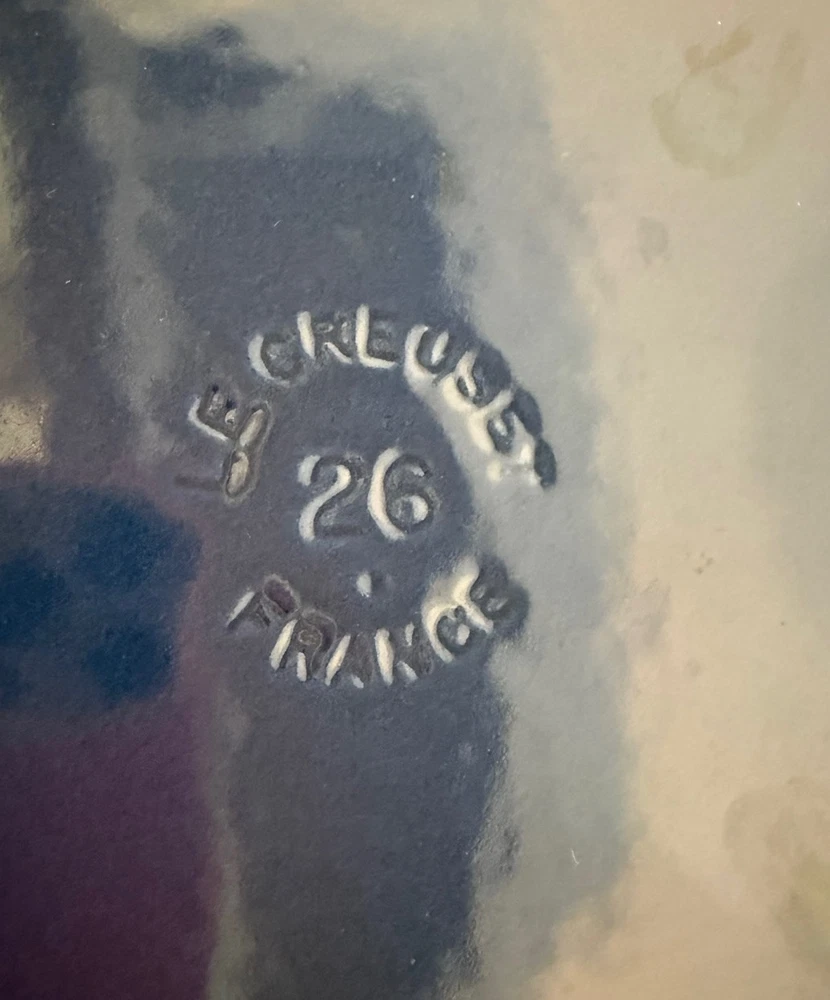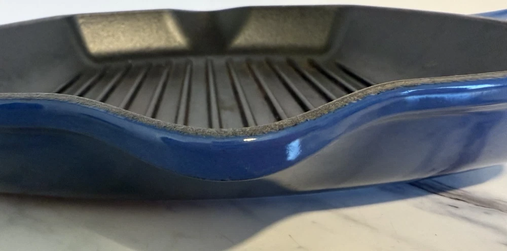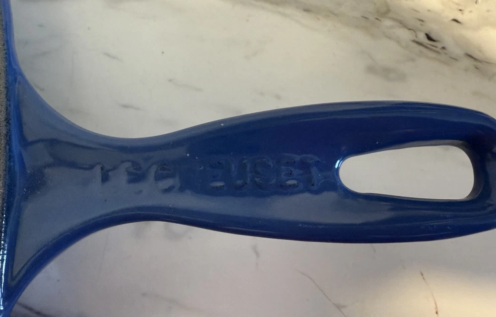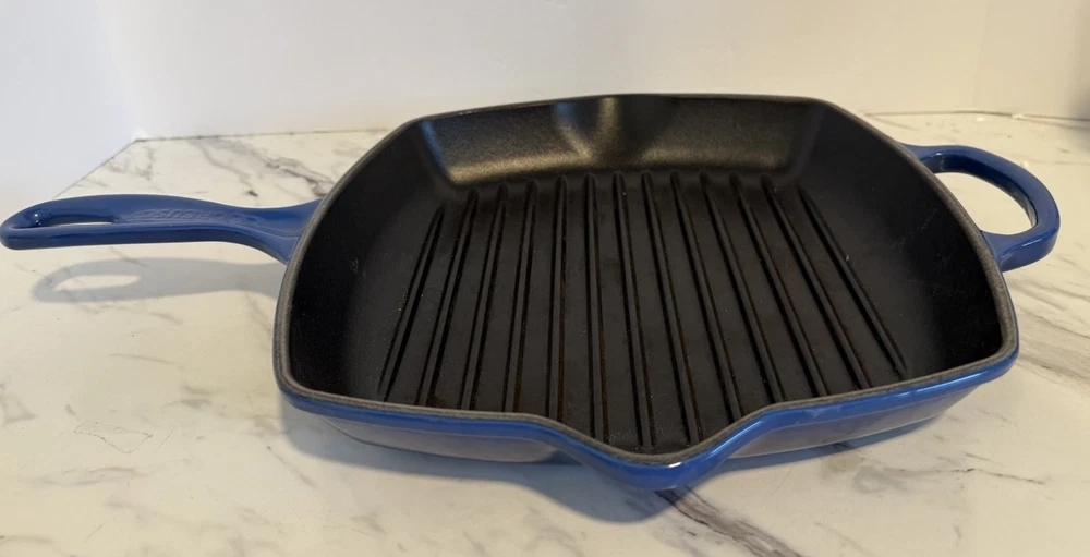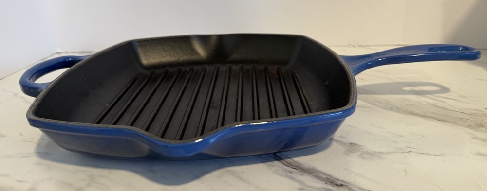 Le Creuset #26 Square GRILL Pan/Skillet Cast Iron 10.5" Double Spout- Blue Pre-Owned in very good condition. Lightly used. Some very minor scuffs on bottom around the edge. See all photos for best representation. Thank you for looking and supporting my small business!