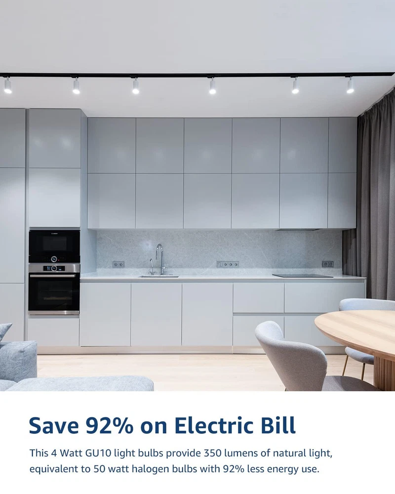 True high efficiency. This NON-DIMMABLE MR16 GU10 LED bulb consumes just 3 Watts, emitting 350 lumens of light, serving as an effective replacement for a 50 watts halogen bulb, saving you up to 90% in energy costs. Extremely long lifespan. Easy to install. Standard MR16 shape with GU10 twist and lock base fits well into all your regular MR16 halogen bulbs. Soft on your eyes. The led bulbs emits flicker-free and non-glare light, helping you avoid eye fatigue caused by flickering light and harsh glare as well as increasing the light emitting area. Wide beam angle. Beam angle is 120°, which is perfect for residential and commercial lighting, light up your living room, bedroom, kitchen, garage, bathroom, study or office. Instant on without delay. Switching on these lights, they were able to go onto full brightness within less than 0. 5 seconds, no need to wait for warming up the lamp. Excellent color consistency and CRI. CRI is a measure of a light source's ability to show object colors "realistically" or "naturally" compared to a familiar reference source, so that CRI is over 80 means more vivid and natural light. Input Voltage: About LE Lighting EVER, abbreviated to LE, focuses on creating the best lighting experience. Only high end LED and advanced optical design are adopted. Enjoy lighting with LE. 【5000K Daylight & 100°Beam Angle】 350LM output for bright, comfortable white light; perfect for track, recessed, and accent lighting. Note: These LED bulbs are NOT dimmable; using them with dimmer switches may cause flickers. 【Energy Efficient & Long Lasting】 4W GU10 LED bulbs replace 50W halogen bulbs, saving 90% on your electricity bill. With a lifespan of over 15,000 hours, they last 10 times longer than halogen and incandescent bulbs. 【Easy Installation】 Standard PAR16 shape and GU10 lock base allow for effortless installation in your regular GU10 lamp holders. 【Safe & Eco-Friendly】 No mercury, no UV/IR light; safe for your family and better for the environment. 【Versatile Application】 Ideal for residential and commercial lighting in living rooms, bedrooms, kitchens, garages, bathrooms, studies, and offices. 【Warm Tips】 Ensure that the light bulb base matches your light fixture. PAR16 is the reflector shape, and the base type is GU10. Verify the bulb type before ordering.