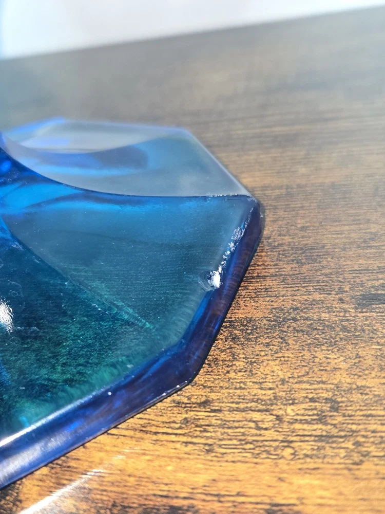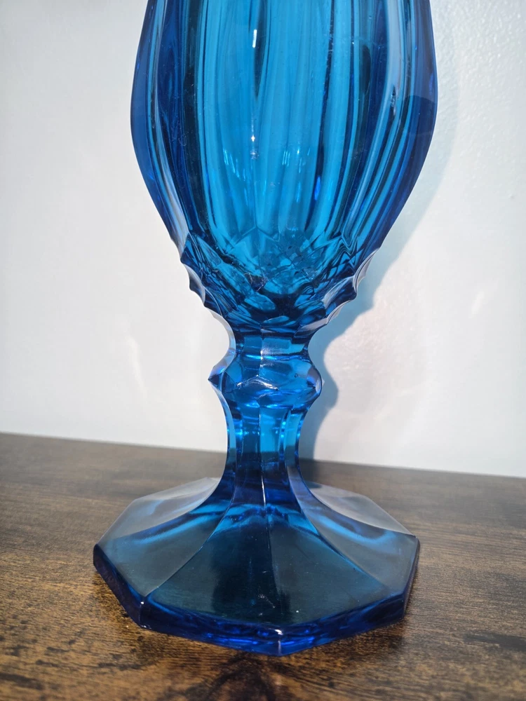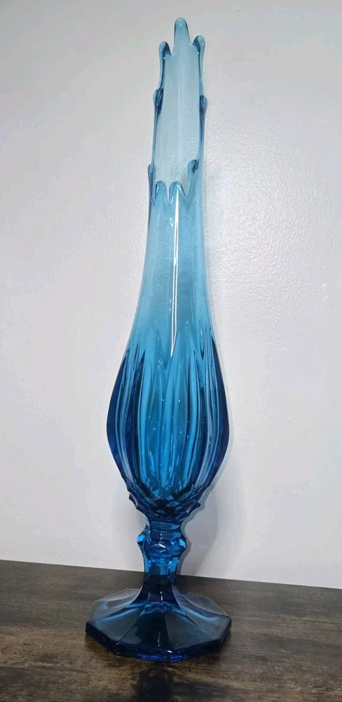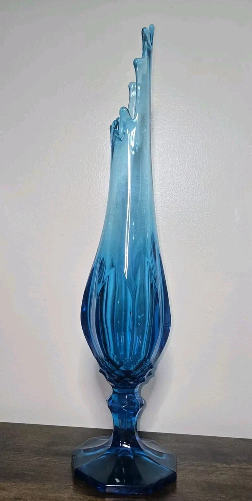 This beautiful vase from L.E. Smith's Blue Dominion collection is a stunning piece of hand-blown glass. With a glossy finish and a dominating blue color, it's sure to catch the eye of any Mid-Century Modern enthusiast. The vase measures 22 inches in height and has nine fingers, making it a unique and original piece. Crafted in the United States using traditional glass-making techniques, this vase is an impressive addition to any collection. The backstamp is impressed and the production style is stretch glass, adding to its authenticity. This original piece is perfect for displaying flowers or as a stand-alone decorative item.