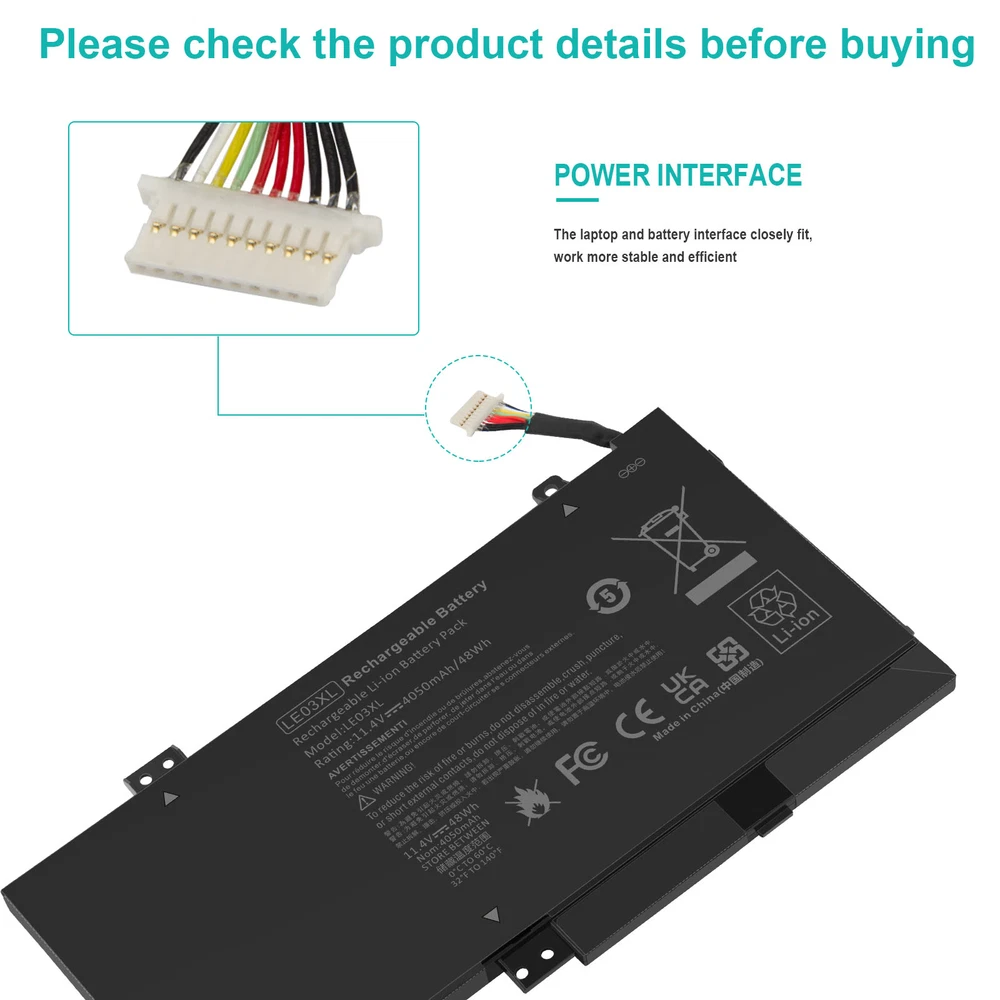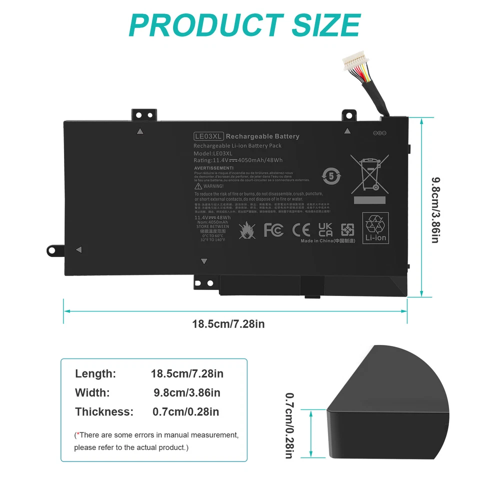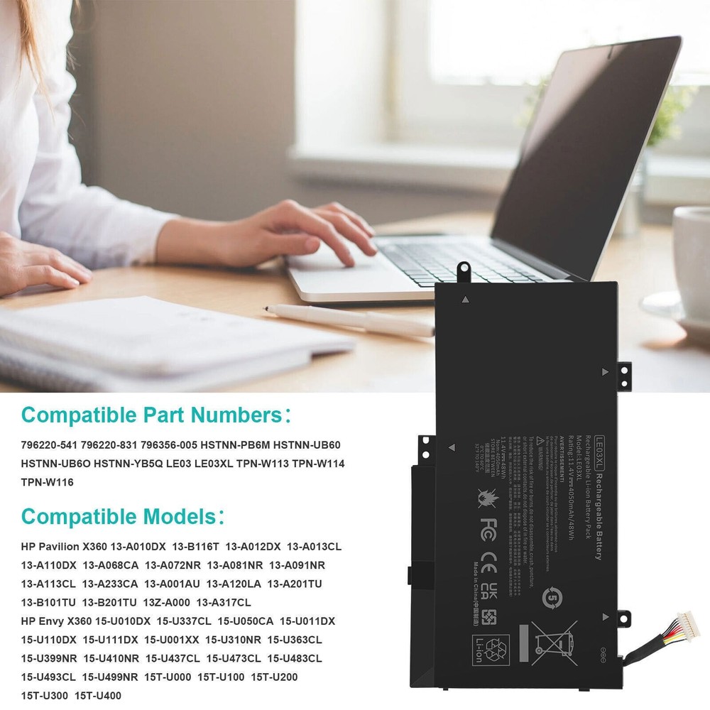 ✅LE03XL Battery for HP Pavilion X360 13-S 15-BK 796220-541 HSTNN-PB6M 796356-005 About us: ➡️We are a laptop battery manufacturer with more than many years , we are positioned for high quality, simplicity and durability. Our products are stable, safe and reliable in performance,and all batteries are made of Grade ''A'' cells . ➡️ If you have any question, pls feel free to contact us first instead of opening any form of case. Contacting our customer service is the best way to better cooperate with each other,thanks a lot. ➡️ Before purchasing, pls confirm that your model/capacity/size is compatible with your laptop . If you don’t know your model, you can provide us a picture of the appearance of the old battery for us to confirm. ➡️ Your positive feedback are the driving force for us to move forward. Specification: Battery type: Li-ion Voltage:11.4V Capacity:4050mAh/48Wh Cell:3 Cells recharge cycles: 500 Operation time: Around 1.5-3hours Replacment Part Number: For HP 796220-541 / 796220-831 / 796356-005 / HSTNN-PB6M / HSTNN-UB60 / HSTNN-UB6O /HSTNN-YB5Q / LE03 / LE03XL / TPN-W113 / TPN-W114 / TPN-W116 Compatible models: HP Envy x360 M6-W Series m6-w010dxm6-w101dxM6-W102Dxm6-w103dx HP Pavilion x360 13-s100 Series 13-s101ng(N9Q88EA) 13-s130ng (P5M88EA) 13-s131ng (T9N51EA)13-s184ng(POT96EA) HP Pavilion x360 15-bk000 Series 15-bk000ng 15-bk000no 15-bk000ns 15-bk000nt 15-bk000nu 15-bk000nv15-bk000nx15-bk001ng 15-bk001nk 15-bk001ns 15-bk001nt15-bk001nx 15-bk001ur 15-bk002ng 15-bk002nia 15-bk003ur 15-bk004na HP Pavilion x360 13-s000 Series 13-s000na(M1M00EA) 13-s000nc(M2Y38EA) 13-s000nj(M2Y72EA)13-s000nk(M6T64EA)13-s000nm(M2Y73EA) 13-s00ns(M4U13EA13-s000nt(M6T13EA) 13-s00nv(M2Y44EA)13-s000ur(M2Y46EA)13-s001la(K8N82LA) 13-s001nf(M1M04EA) 13-s001nj(N1J91EA) How to confirm that the battery is suitable for your laptop? Method 1: Use System Information to find your laptop model Step 1: Press Windows + R to open Run window. Step 2: Input "msinfo32" in the empty box and click OK to open System Information. Step 3: Keep in the System Summary section, and you will find the System Model item in the right pane. Method 2: Remove Battery from Laptop to find your laptop battery part number Step 1: Switch off the laptop and unplug the power cable in case of electric shock Step 2: Remove the back panel with the screwdriver. You should to this with care avoiding any harm to the laptop components. Step 3: Disconnect the cable connected to the battery and then take out the battery. After that, you can check the specifications of your battery. Enjoy Your Leisure time~ About us: High Quality Batteries ★ We are a laptop battery manufacturer with more than many years, we are positioned for high quality, simplicity and durability. we are the most professional full-service provider integrating development, production, sales and service. Our products are stable, safe and reliable in performance,and all batteries are made of Grade ''A'' cells.Quality determines the price, our products are worthy of your trust ! Good Customer Service ★ We provide 100% satisfied customer service,If you have any questions or suggestions about our products, pls feel free to contact us through eBay message,and we can provide the most convenient service for you. ★ Pls no not open any case, we will reply to you in 24 hours. ★ The inventory quantity on the link is not necessarily the actual quantity, if you need in bulk, pls contact us and make offer. Warm Tips ★ Pls make sure your address is exactly before purchasing ( Due to POBOX restrictions, we cannot deliver to you. ). If you want to revise the shipping address,pls contact us within 24 hours by message. Thanks in advance for your close cooperation! Warranty ★ We provide 3-5 Years warranty for your customers, any question or problem about our product, pls send us message first,and we will solve it as soon as possible. Shipment ★ Items are shipped directly from our US warehouse normally within 24 hours after payment.( Except Sat. & Sun. ) ★ If you fail to receive it after that period, you can contact us through message first, and we will give you further assistance. ★ We offer discounts for Combine Shipping. Pls contact us at the first time if you need combine shipping, and an invoice with discount will be sent to you. Returns ★ A full refund can only be issued within 30 days. ★ If you receive a product with quality problems or dissatisfaction, pls contact us first, do not apply for a refund directly, thank you for your understanding and cooperation ! ★ We can't receive the returned item if buyer returns by yourself according to the address on original shipping package. We won't solve such case and buyer should responsible for the consequences. Pls contact us before return the item. Payment Delivery details Warranty & Return About us Contact us Payment 1. We accept payment via Paypay only. 2. All payments must be prepaid. Delivery details 1. Items are generally shipped out within 24-48 hours after your payment has been cleared (Sat. & Sun. excluded.) 2. Orders from the United States will all be shipped out via USPS and FedEx. The shipment usually takes 3-7 business days( Exclude public holiday), if you need the item urgently, please contact us for detail before purchase. 3. We ship to US ONLY and do not support Collection. 4. All items will be shipped to buyer's paypal address. Please check your paypal address before place the order. 5. We are not responsible for wrong or undeliverable address. We reserve the right to charge the shipping fee again for returned items due to wrong address. Warranty & Return 1. We provide 30 days money back on non-defective, undamaged, unused and resalable products. Product is not eligible for refund after the 30-day refund period has expired. 2. Our warranty does not extended to any products that are physically damaged or that are not under normal operating conditions as a result of misuse or improper installation on