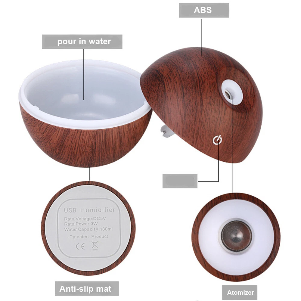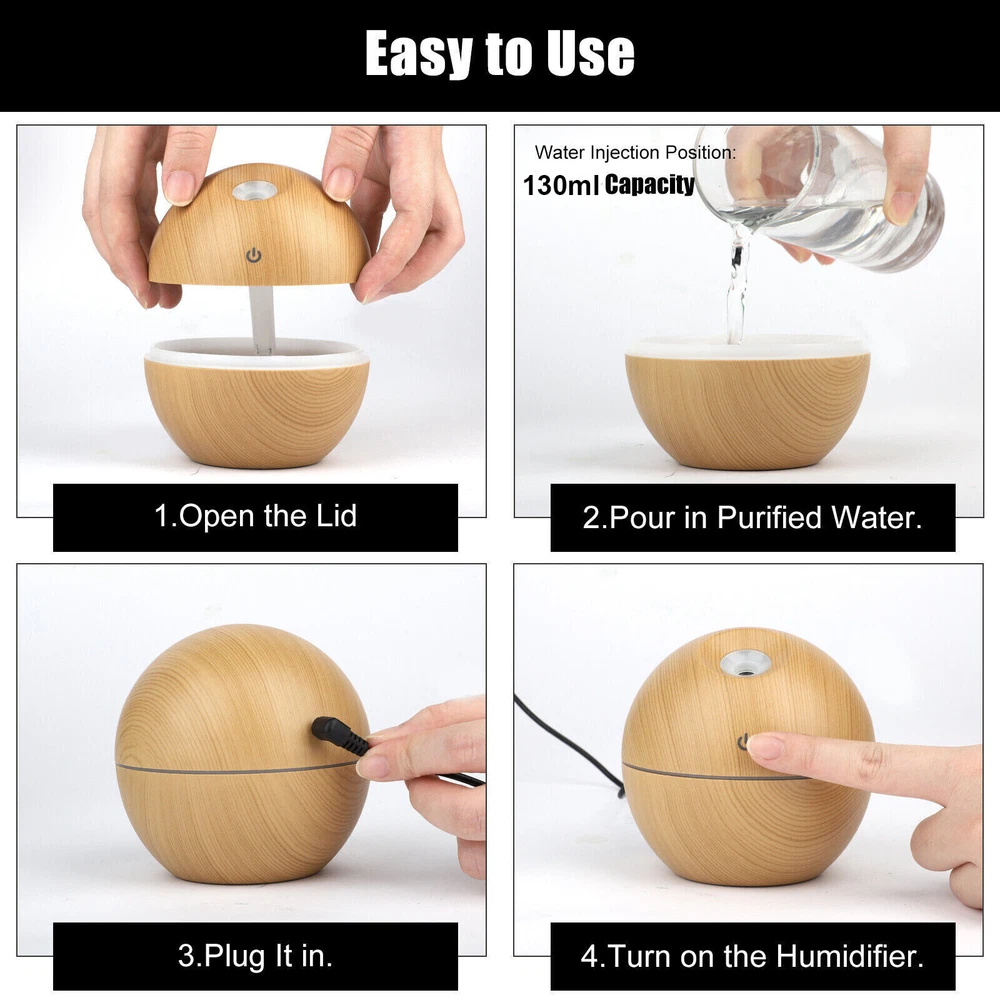Power Supply: USB Input Voltage: DC5V Function: creates a perfect sleeping atmosphere, keeping you away from dry Power Source: Electrical Warranty: One Year Warranty Model: Aromatherapy Diffuser Humidification Method: cool mist Power: 3W Voltage: 5 V Energy Star: compliant Room: Any Room Bundle Description: Wood Grain Humidifier Shape: Round Manufacturer Part Number: Does not apply Application: Car,Whole House,Whole Room Coverage: 10-20 Square Meters Recommended Room Size: Medium Brand: Unbranded Suitable for: A perfect holiday gift for friends, family and loved ones Type: Humidifier Manufacturer Warranty: 1 year Operating Sound Rating: below 23 dB MPN: Does Not Apply Tank Capacity: 130ml Features: Aroma Diffuser, LED Lights, Portable, Quiet Operation