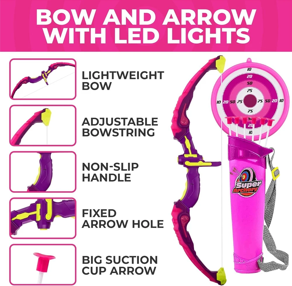 Youth Archery Set with LED Flash Lights - Includes Bow, Arrows, Target & Quiver ‹ › ‹ › ‹ › ‹ › ‹ › ‹ › ‹ › ‹ › ‹ › ‹ › Youth Archery Set with LED Flash Lights -Includes Bow, Arrows, Target & Quiver Features: Six Times The Fun: Includes x6, 16-inch suction cup arrows, x1, 13-inch bow, x1 bull's eye target, and x1 Arrow quiver. Educational And Fun: Practice fine motor skills, accuracy skills, and hand-eye coordination. Quality and Durable Materials: Made of quality ABS plastic, lightweight bow with adjustable chord, and strong suction cup arrowhead. Wonderful Shooting Game: Bright LED flashing lights illuminate while shooting the target to at least 3 feet distance. Amazing Gift Idea: Ideal for Birthdays, Christmas, or Special occasions for indoor or outdoor play. Benefits: Promotes fine motor skills, accuracy, and hand-eye coordination. Safe and easy to use for children. LED lights add excitement to target practice. Durable materials for long-lasting play. Encourages outdoor play and physical activity. Why choose our Youth Archery Set? Looking for a fun and educational toy for your child that promotes skill development and outdoor play? Our Youth Archery Set with LED Flash Lights is the perfect choice! Made of quality materials and featuring bright LED lights, this set will provide hours of entertainment and skill-building for your little one. Give them the gift of adventure and imagination with this exciting archery set! Don't miss out on this opportunity to spark your child's creativity and outdoor play - order your Youth Archery Set today! Shipping Free & Fast Shipping - We offer free shipping to most of the USA with a normal delivery time of 3-7 days. However, due to the current situation, additional delivery time (up to 3 weeks) may be required for some items. Alternative Carriers - We may use alternative carriers (e.g. USPS, FedEx, UPS, etc.) to ensure your package arrives safely and on time. Due to the use of multiple carriers, we are unable to provide a tracking number automatically. Handling Time - Orders are processed and shipped within 1-2 business days of receiving cleared payment. Shipping Restrictions - Shipping to Alaska, Hawaii, Puerto Rico, Guam, and other US territories may incur shipping charges or delivery restrictions. Please contact us before ordering, or your order can be refunded/cancelled. State Restrictions - There may be restrictions based on your state of purchase. For example, certain items may not be shipped to California due to state regulations. Contact for Tracking Updates - If you require tracking updates or have any concerns about the delivery of your order, please feel free to contact us, and we will be happy to assist you. Return 30-Day Hassle-Free Returns - We want you to be completely satisfied with your purchase. If you are not, you can return the item within 30 days of receiving it for a full refund or exchange. Easy Return Process - To start a return, simply contact us and we will provide you with a prepaid return shipping label and detailed instructions. Restocking Fee - There are no restocking fees for returns. However, the buyer is responsible for return shipping costs if the return is not due to a seller's error. Refund Processing Time - Refunds will be processed within 5 business days of receiving the returned item in its original condition. Payment We accept all major credit cards, PayPal, and Apple Pay for your convenience. Your payment information is secure and encrypted to ensure a safe and seamless transaction. Please complete your payment within 3 days of purchase to avoid any delays in shipping. Feedback Your feedback is extremely important to us. We strive to provide the best products and customer service possible. If you are satisfied with your purchase, please take a moment to leave us a positive review. If you have any concerns or issues with your order, please contact us before leaving negative feedback. We are committed to resolving any problems and ensuring your satisfaction. Contact Us If you have any questions or concerns, please feel free to reach out to our customer support team. You can contact us through the eBay messaging system. We are available Monday to Friday, 9:00 am to 5:00 pm EST, and we will do our best to respond to your inquiry within 24 hours. Thank you for supporting our small family business!