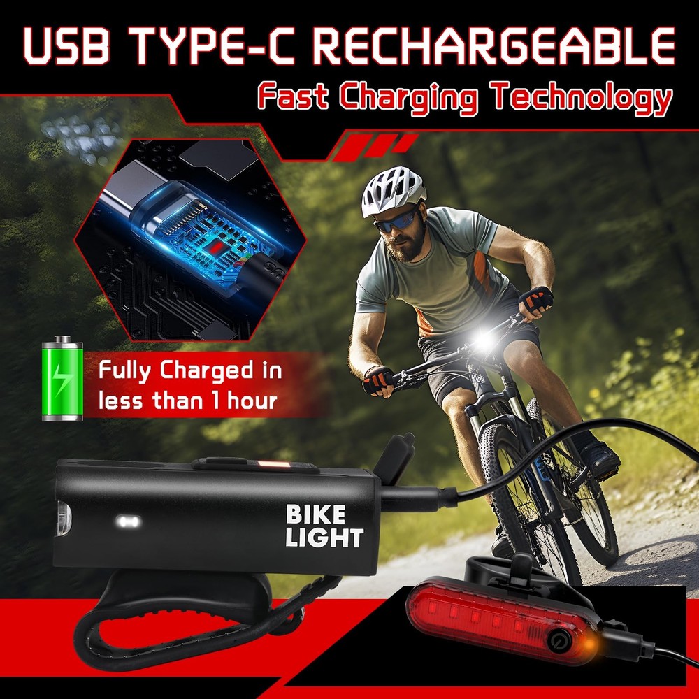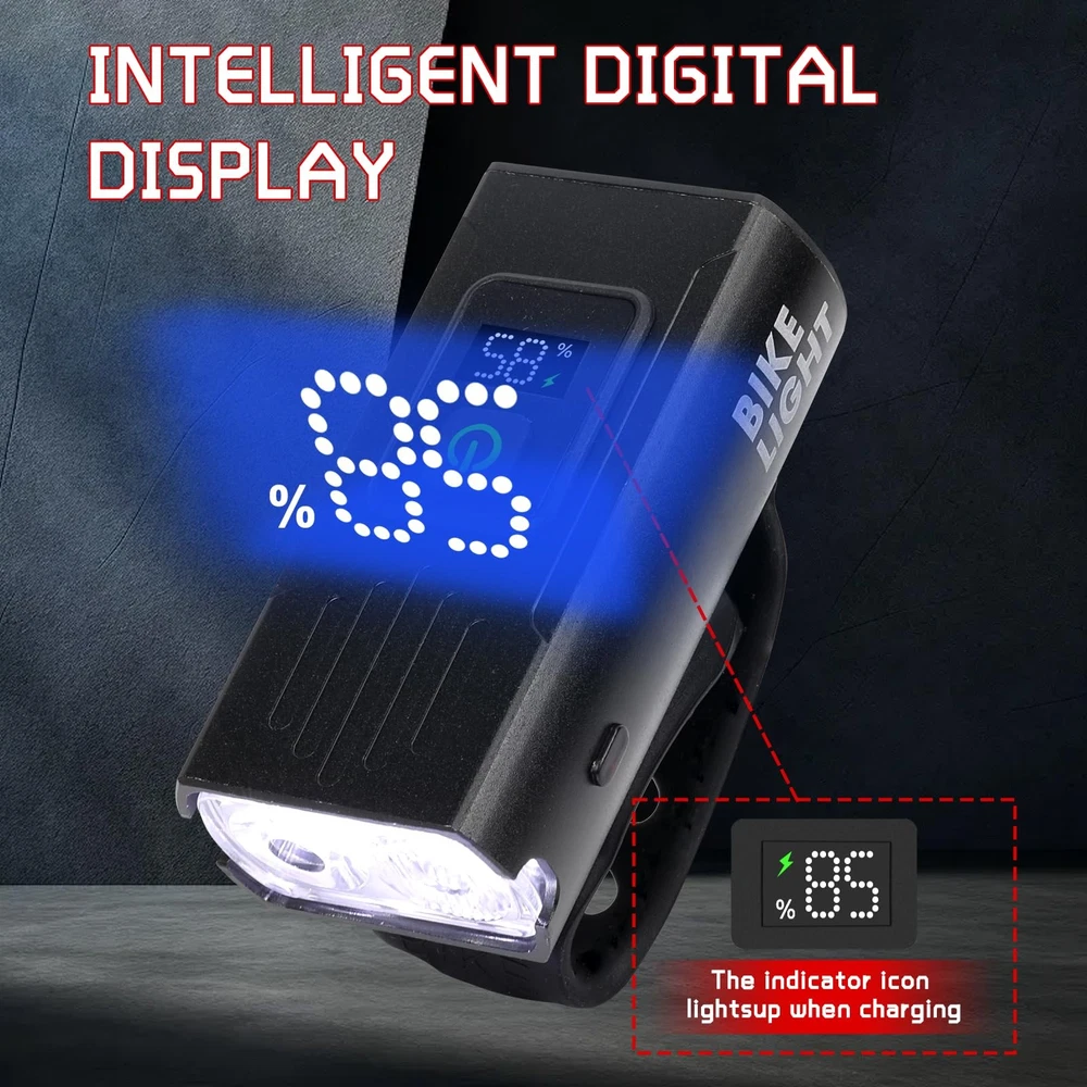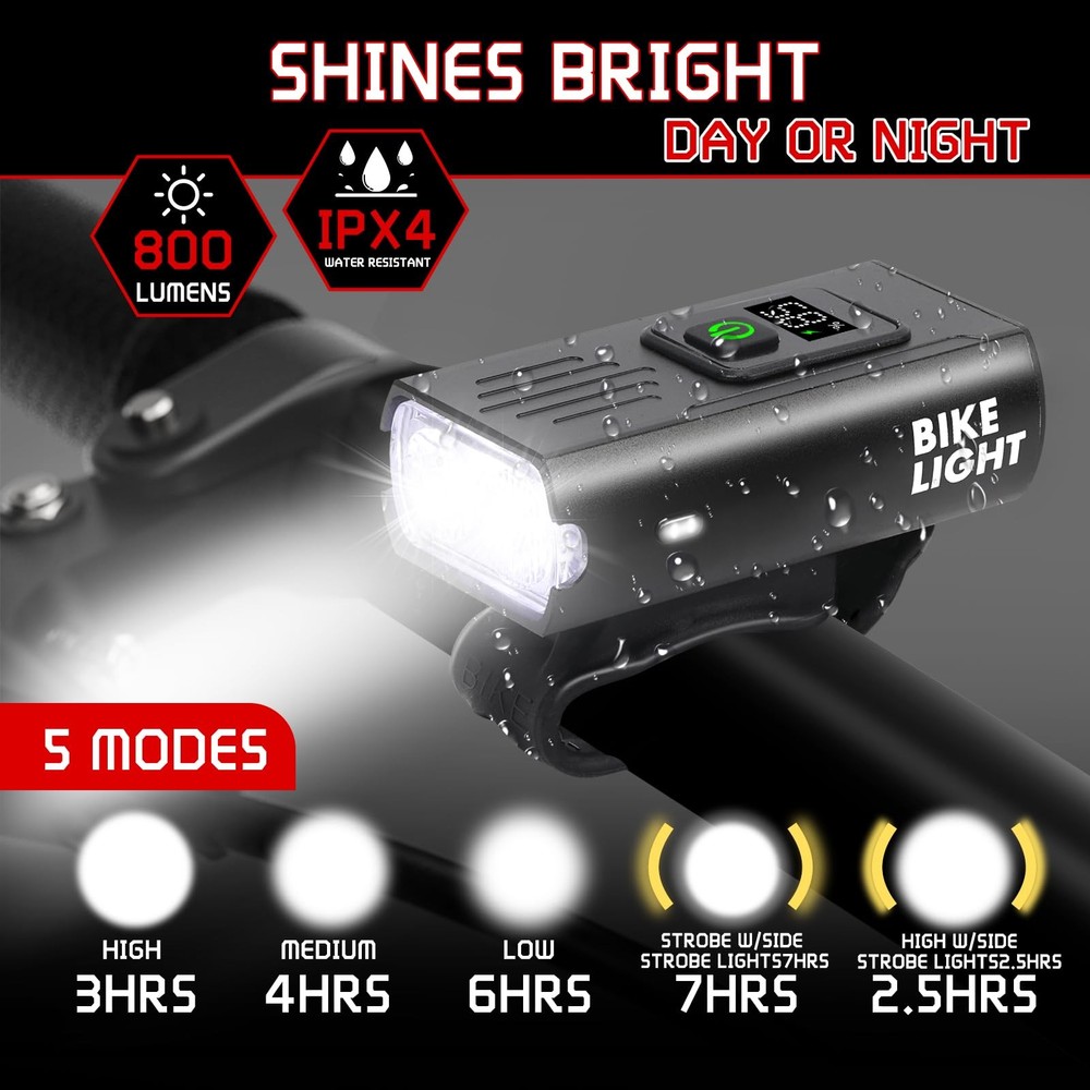Our bicycle lights front and rear use high-brightness LED lamp beads, which can provide sufficient light, so that you will no longer be confused when riding at night, and meet your needs in different environments; the bike bell has a clear and pleasant sound, reminding passers-by, and is your right-hand man on your cycling journey. Product name: bike light set, bicycle bell Product material: aluminum alloy Product size: 4"L x 4"W x 1"H Product weight: 4 oz Product color: black Product quantity: 1x bike headlight, 1x bike tail light, 1x bicycle bell Features: 1. Set design, including bicycle headlight, rear bike light, bicycle bell. Easy to install, suitable for most bicycle models. Lightweight and durable, waterproof, fearless of wind and rain, escort your cycling journey. 2. Bike lights can according to your needs and environment, you can choose different light modes, with 6 front light modes and 4 rear light modes to adapt to various road conditions. 3. Rechargeable bicycle light use USB rechargeable design, easy to charge, LED digital screen can display the remaining power, so you can see clearly at any time, adding safety and convenience to your cycling journey. 【Super Bright & Long Runtime】: This bike lights uses 2 pcs 800 high lumen LED lights with a crisp bike bell, illuminating the road you ride at night. The running time of the headlight is 5-10 hours,and the running time of the taillight is 50-80 hours,which can meet your long time riding lighting needs. 【LED digital screen】: Rechargeable bike light is equipped with an LED digital screen, which can accurately and clearly display the remaining power, and is equipped with the latest USB-C charging technology, allowing you to quickly connect to a USB power source for easy charging. It is clearly visible at night and during the day, adding safety and convenience to your cycling journey. 【Easy to Install】: The bike light set has front bicycle light, rear bike light, and bicycle bell adopt a simple and firm installation method, which is suitable for most bicycle models, and can also be used for scooters, strollers and wheelchairs. And the bike lights for night riding light weight allows you to carry it anywhere anytime, and it can also be used as a normal flashlight. 【Excellent Quality】: This Bicycle light is made of premium quality aluminum alloy, and the IPX4 waterproof design can withstand bad weather, so you don't have to worry about windy and rainy weather and muddy roads when you go out, and bike lights front and back can provides you with a long service life, ensuring the stable operation of the bike accessories. 【Widely Use】: Bicycle lights front and rear has 6 different front light modes and the bike tail light has 4 modes . In addition to daily use installed on the bicycle, you can rely on this light in power outages, roadside repairs and safety emergencies. Bike headlight and tail light set is very suitable for use at home, walking the dog at night, camping, fishing. Bicycle light adapt to various road conditions and escort your cycling journey.