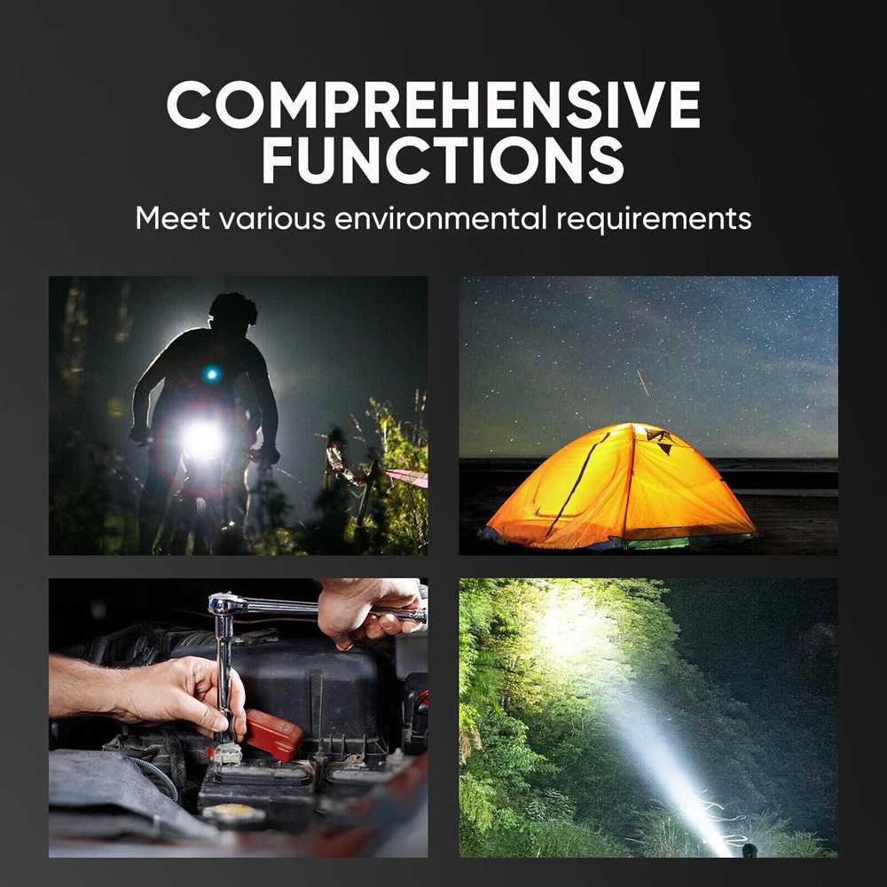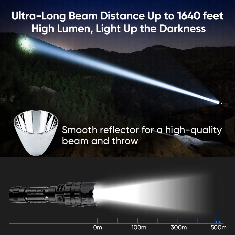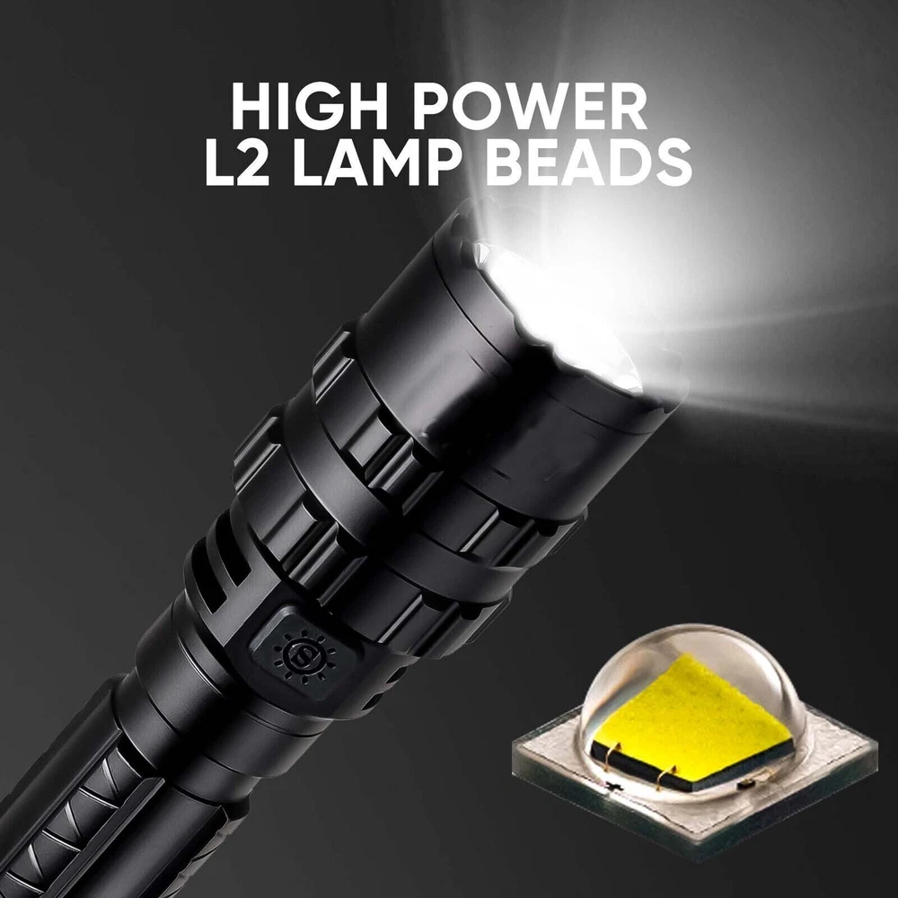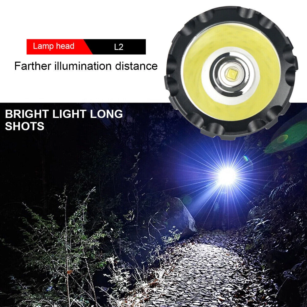 Rechargeable Tactical Flashlight,LED Flashlight 5 Modes,Waterproof, SUPER BRIGHT! Rechargeable Battery,Handheld Flashlight for Camping Hiking Biking Outdoor Activity Powerful flashlight with powerful rechargeable battery built into the flashlight!charges VIA USB cable!! Product Description 【Super Bright Flashlight】Our 200000 lumens tactical flashlight utilizes the durable LED chip,provides poweful light,2 times brighter than normal flashlight.Max beam distance up to 500 meters (1640ft).With a lifetime up to 50,000 hours.Attention:You need get it fully charged before use.please make sure the battery "+" face the inside. 【Rechargeable Flashlight】With rechargeable battery,it can be charged by usb cable(included),low light modes for 6 hours use.Power indicator above the flashlight helps you to know the statu of the battery clearly. 【5 Modes Flashlight】Features with 5 different modes:High,Medium,Low,Strobe,SOS.Easy to change modes by pressing the switch button gently.Mini size fits in your hand or pocket,backpack, survival bag,or car glove compartment. 【Waterproof & Durable】IP65 Waterproof level protect it from splashing water from any angle.Suitable for outdoor environment and adverse weather conditions.Please do not submerge in water for a long time.This flashlight is made of aluminum alloy,skid-proof, abrasion resistance,which is a sturdy tool to hit something during emergency. 【Widely Application】Convenient to operate by one hand with lanyards and compact enough to carry to anywhere in your pocket.Ideal for dog walking,hunting, boating,power outages,patrolling,camping,hiking,emergency.Perfect gift for a father, husband, wife, or college student for any occasion.If you have any question,please feel free to contact us,we promise you a refund/replace anyway. Product Features Utilized upgrade LED with a lifespan of 500,000 hours. Made by military-grade aluminum alloy, premium solid built body. Can be charged via a car/wall adapter, computer or power bank. IP65 waterproof for extreme conditions indoors or outdoors 5 Light Modes: High/Mid/Low/Strobe/SOS With power indicator light Package include : 1x LED Tactical Flashlights 1x USB Cable