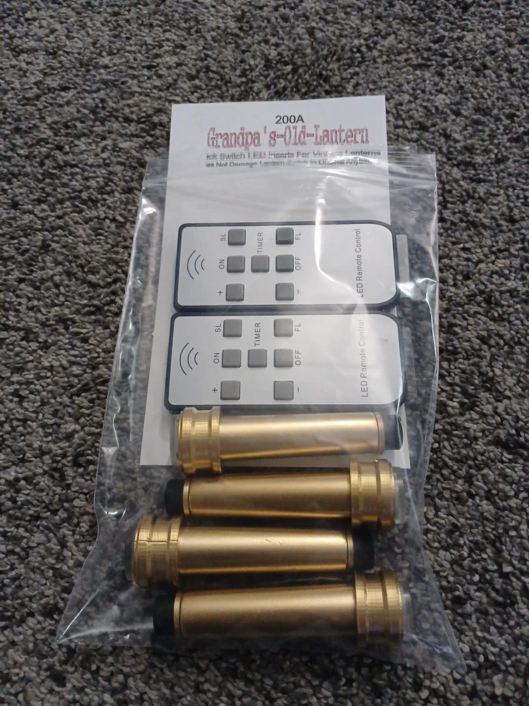 Fits Coleman 200A Lanterns. 4 tubes and 2 remotes. No Electrical Cords or Wires. Gold Plastc. Grandpas Old Lantern LED Burner Tube Inserts is Made For Coleman 200A Lanterns. Remove Original Tubes and Insert LED Tubes Quickly Without Damaging Lantern. Made to Display Your Collection Indoors, Shows, or Rare Unfired Lanterns. Lights. Switch Back to Original anytime! Lights are not made to replace the Same Light Output As Original Fuel. But Makes A Nice Light. 3 Modes of Glow, Including Slow Flicker, fast flicker, or steady. Requires 1 AAA battery per tube. LED inserts are made to display non- working lanterns, unfired rare lanterns, and indoor displays for a comforting light and show. I am always on the lookout to find a brighter light. As soon as one is developed that can run on the size of battery used, I'm all in. No one would love that more than me. LIGHTS FOR 220-228s ARE FOR SALE AS WELL. KEYWORDS: GRANDPAS OLD LANTERN 220-228