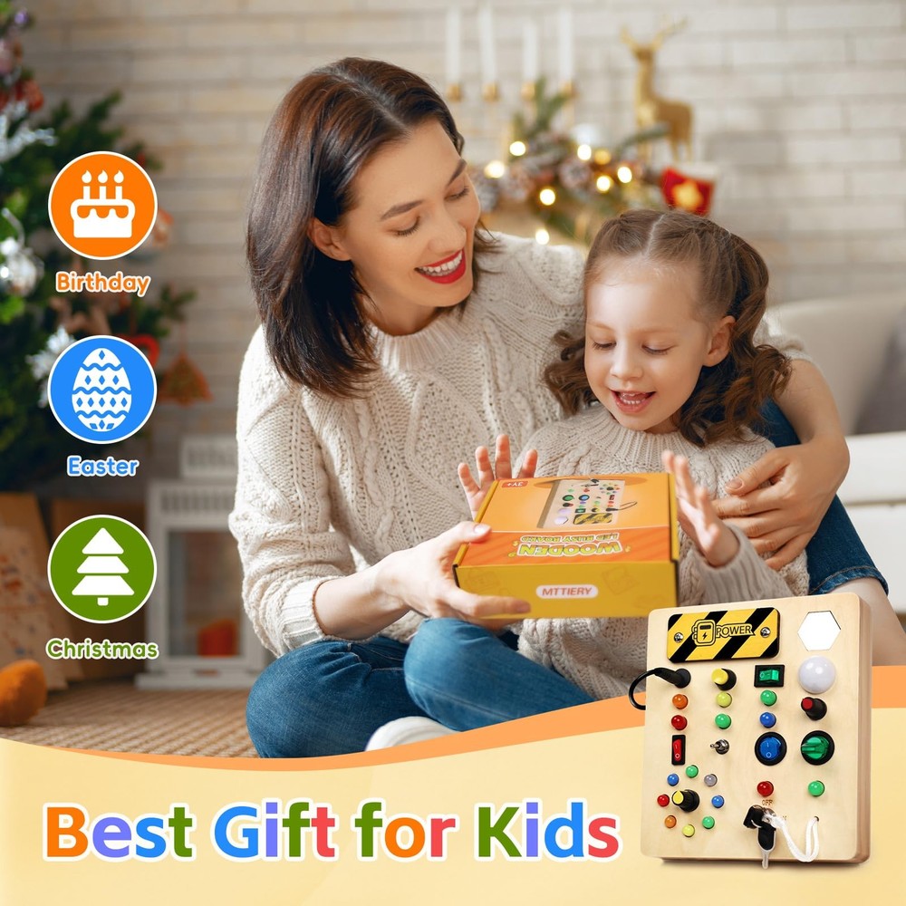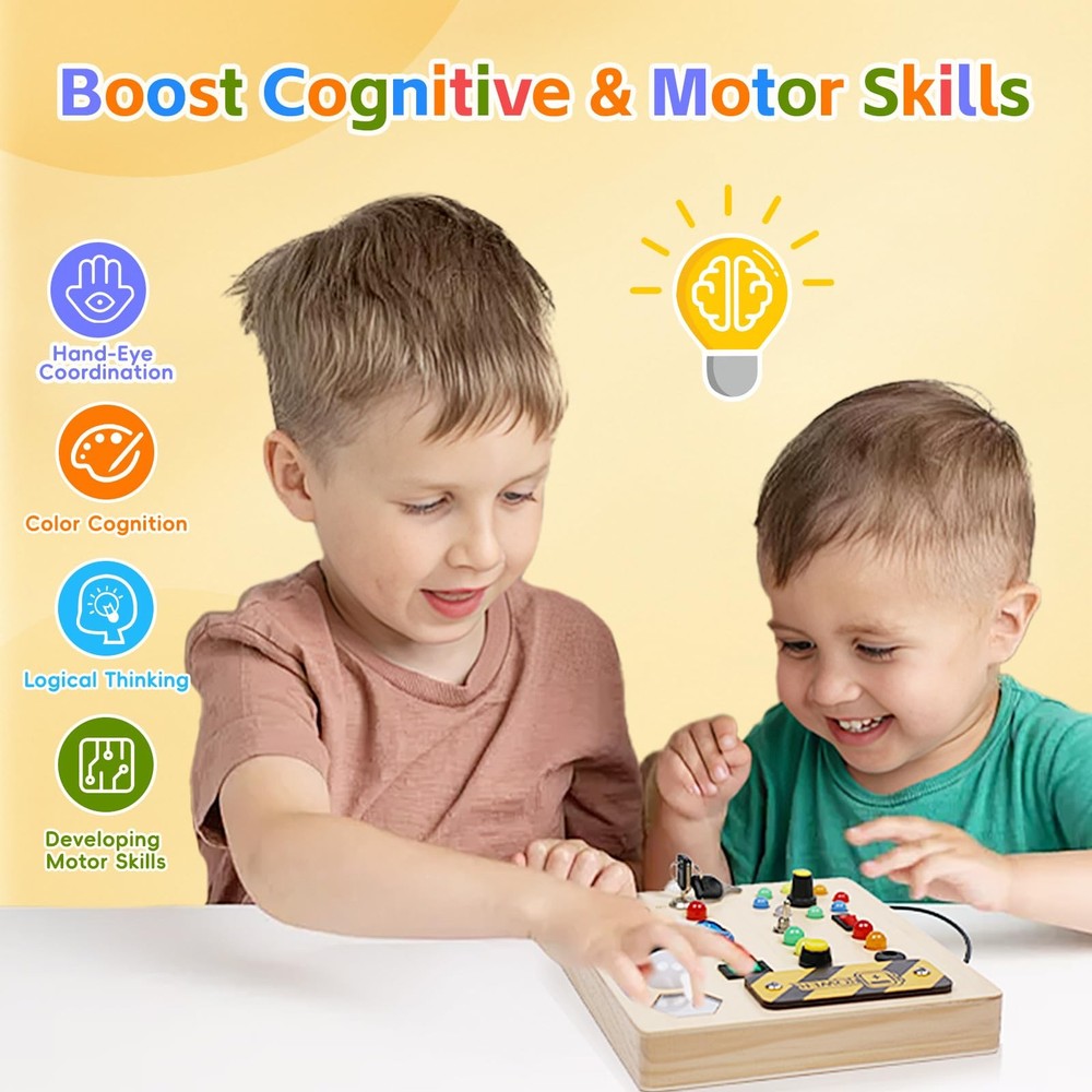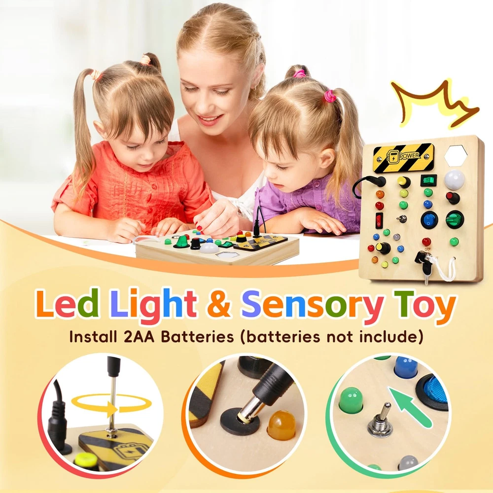 Perfect Learning activity- Fun and unique sensory boards can improve your baby's recognition and sensory activity. Exquisite Sensory toys-Improve children's motor skills and problem-solving abilities. Bring hours of entertainment with endless combinations of buttons, wires and lights. This is a very interactive game, recommended for children from 1 to 5 years old to play. Safe and high quality-Wooden busy board is made of natural wood, smooth corners, completely suitable for children's small hands, to ensure safe and independent use. A great learning toy.-This wooden busy board helps your baby develop fine motor skills, practice hand-eye coordination, distinguish colors and develop intelligence. This sensory toy is well constructed and all the buttons are perfectly sized for toddlers to press easily. Portable Travel toy -I think this baby busy board is a must-have item for kids on road/plane trips. Taking it on the road/on plane trips allows him to focus on his seat and not get bored Toddler Montessori Busy Board - This toy is designed for kids who love switches and LED lights. This wooden toys is set with 10 different switches, each corresponding to a different color or style of LED light.At the same time, this busy board also has a master switch to turn off all the lights with one click to avoid tedious operation.The board also comes with a mirror to keep your child occupied throughout the journey Educational Learning Toys - This sensory board offers a fun and interactive way for toddlers to recognize colors, improve fine motor skills, and enhance problem-solving abilities through hands-on activities High Quality Sensory Toys - Our toddler fidget toys are made of natural wood with smooth edges. All the various buttons, switches, and shifters are securely installed. The busy board with led lights is high quality and very sturdy, ensuring safety for your child. The light is soft and won't hurt children's eyes Fit Size - This product measures 7*6*1 inches.This baby busy board with a mirror for 1 2 3 year olds is suitable for different scenarios, such as at home, on the airplane, in the car, and during travel. It's a perfect travel toys to keep your baby quiet and engaged Best Gifts for Kids - This toddler busy board is the perfect birthday gift for your child. Toddlers can use it to identify different colors and sizes. Designed to turn the boring learning process into a creative and fun one. Please bring your own 2 x AA batteries before use