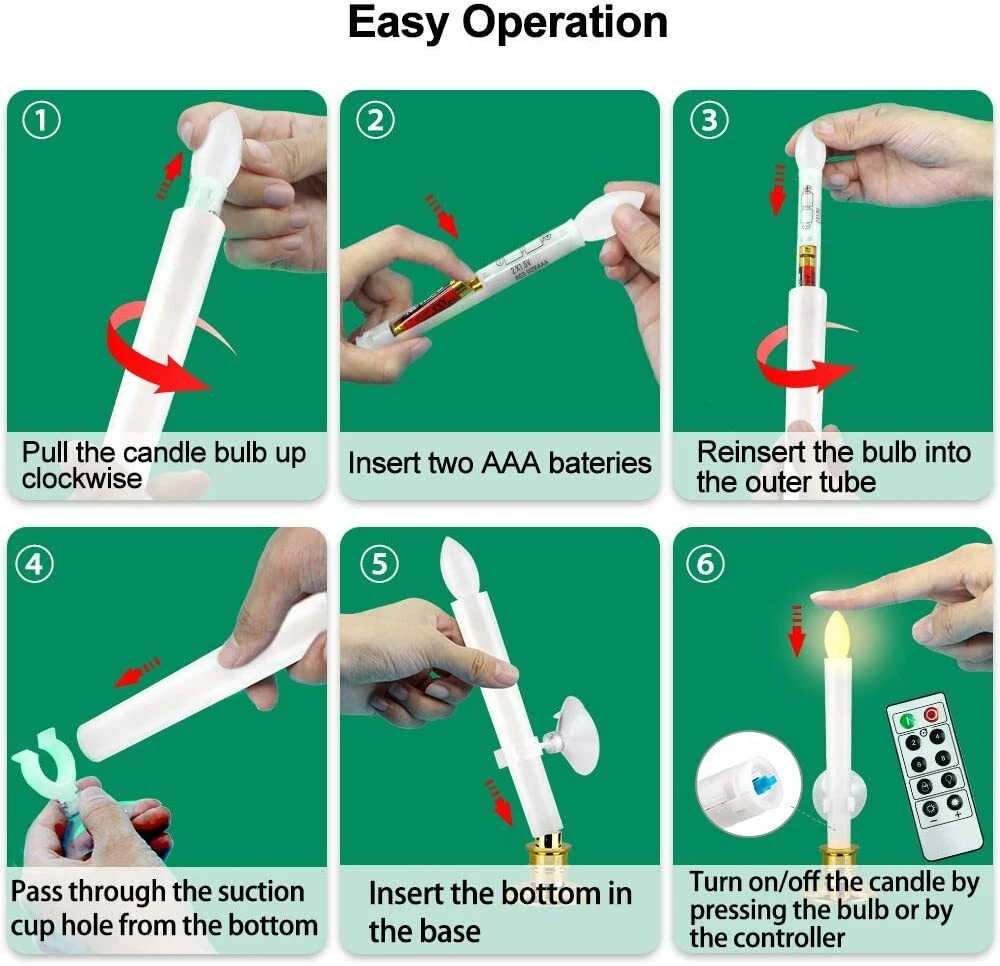 LED Candle Window Light Flameless Taper Candles with Suction Cups 8 Pack+Remote Must Have for Holiday -- 3D flickering flame like the actual taper candles and are safe to touch. The electric LED candles with remote control have multi-modes to show in flicker and brightness. Warm realistic candle light is vivid, enhance and rich family Christmas atmosphere. Best Christmas Decoration Ideas -- The holiday candles with suction cups can be stick on windows or just put on desk. Suitable for dinner desk, bars, home decoration, churches, birthday parties, on the beach, on the grass, Indoor & Outdoor decoration, etc. To build an unforgettable holiday memory. Remote Control & Timer -- Daily 24-hour cycle 2H/4H/6H/8H timer setting function. The distance can be to 5 meters from the infrared remote control with variations in flicker and steady, dark and bright function. The battery operated window candles can be controlled by a remote or by pressing the candle head. 100% Safe & No Mess -- The electric candles are battery operated without cables, no need for any wall socket. LED Candle light, no fire, no smoke, no messy dripping wax. Much safer and cleaner than real candles. Extremely convenient for your family. The candles bulk is easy to store and are reusable. Best Gift Idea for Family - Package includes: 8 x Candles, 8 x Gold Candle Holders, 8 x Suction Cups, 1 x Remote Control with Timer (Batteries Not Included). Candle Size 8.5x2.5". Suitable for Thanksgiving Day gift, Christmas gift for your family or friends. Payment Shipping Returns Payment Shipping Returns We accept payment by any of the following methods: PayPal Please pay as soon as possible after winning an auction, as that will allow us to post your item to you sooner! We offer FREE shipping on all orders! Your order will be dispatched within 1 working day of receiving payment (Monday-Friday) and you should expect to receive it one or two days after dispatch (for orders sent RM 1st Class). In the very unlikely event that your item is lost or damaged during post, then WE are responsible and will issue either a full refund or replacement. If you are not 100% satisfied with your purchase, you can return the product and get a full refund or exchange the product for another one, be it similar or not. You can return a product for up to 14 days from the date you purchased it. Any product you return must be in the same condition you received it and in the original packaging. Please keep the receipt. ---Must Have for Holiday -- 3D flickering flame like the actual taper candles and are safe to touch. The electric LED candles with remote control have multi-modes to show in flicker and brightness. Warm realistic candle light is vivid, enhance and rich family Christmas atmosphere. ---Best Christmas Decoration Ideas -- The holiday candles with suction cups can be stick on windows or just put on desk. Suitable for dinner desk, bars, home decoration, churches, birthday parties, on the beach, on the grass, Indoor & Outdoor decoration, etc. To build an unforgettable holiday memory. ---Remote Control & Timer -- Daily 24-hour cycle 2H/4H/6H/8H timer setting function. The distance can be to 5 meters from the infrared remote control with variations in flicker and steady, dark and bright function. The battery operated window candles can be controlled by a remote or by pressing the candle head. ---100% Safe & No Mess -- The electric candles are battery operated without cables, no need for any wall socket. LED Candle light, no fire, no smoke, no messy dripping wax. Much safer and cleaner than real candles. Extremely convenient for your family. The candles bulk is easy to store and are reusable. ---Best Gift Idea for Family - Package includes: 8 x Candles, 8 x Gold Candle Holders, 8 x Suction Cups, 1 x Remote Control with Timer (Batteries Not Included). Candle Size 8.5x2.5". Suitable for Thanksgiving Day gift, Christmas gift for your family or friends. LED Candle Window Light Flameless Taper Candles with Suction Cups 8 Pack+Remote Must Have for Holiday -- 3D flickering flame like the actual taper candles and are safe to touch. The electric LED candles with remote control have multi-modes to show in flicker and brightness. Warm realistic candle light is vivid, enhance and rich family Christmas atmosphere. Best Christmas Decoration Ideas -- The holiday candles with suction cups can be stick on windows or just put on desk. Suitable for dinner desk, bars, home decoration, churches, birthday parties, on the beach, on the grass, Indoor & Outdoor decoration, etc. To build an unforgettable holiday memory. Remote Control & Timer -- Daily 24-hour cycle 2H/4H/6H/8H timer setting function. The distance can be to 5 meters from the infrared remote control with variations in flicker and steady, dark and bright function. The battery operated window candles can be controlled by a remote or by pressing the candle head. 100% Safe & No Mess -- The electric candles are battery operated without cables, no need for any wall socket. LED Candle light, no fire, no smoke, no messy dripping wax. Much safer and cleaner than real candles. Extremely convenient for your family. The candles bulk is easy to store and are reusable. Best Gift Idea for Family - Package includes: 8 x Candles, 8 x Gold Candle Holders, 8 x Suction Cups, 1 x Remote Control with Timer (Batteries Not Included). Candle Size 8.5x2.5". Suitable for Thanksgiving Day gift, Christmas gift for your family or friends. Payment We accept payment by any of the following methods: PayPal Please pay as soon as possible after winning an auction, as that will allow us to post your item to you sooner! Shipping We offer FREE shipping on all orders! Your order will be dispatched within 1 working day of receiving payment (Monday-Friday) and you should expect to receive it one or two days after dispatch (for orders sent RM 1st Class). In the very unlikely event that your item is lost or damaged during post, then WE are responsible and will is