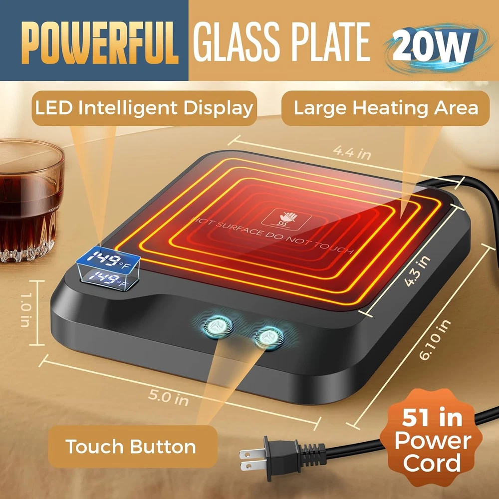 Store New Arrivals Add to Favorite View Feedback Contact LED Display Coffee Mug Warmer, Candle Warmer W/4Hrs Auto Shut off & 2-12Hrs Timer, 3 Temp Settings Smart Cup Warmer for Coffee, Milk, Tea, Beverage, Candle, Coffee Warmer for Desk Ideal Coffee Gifts Description Item model number coffee mug warmer Manufacture Year 2025 Maximum Temperature 149 Degrees Fahrenheit Lower Temperature Rating 104 Degrees Fahrenheit Power Source Corded Electric Color Black Upper Temperature Rating 149 Degrees Fahrenheit Wattage 20 watts Material Glass and ABS Item Weight 11.7 ounces Product Dimensions 5"L x 6.1"W x 1"H Voltage 110 Volts (AC) Keep Your Drink Warm Ready Anytime-- Say goodbye to lukewarm coffee! The coffee mug warmer offers powerful, ensuring every sip is just right. Whether you're working, relaxing, or on a cozy morning routine, mug warmer keeps your favorite drinks warm for hours—no more rushing to finish before it cools. Make every moment cozy and satisfying with this must-have for coffee and tea lovers Easy-to-Use for Ultimate Convenience-- The candle warmer features an intuitive touchscreen design that makes operation effortless. Simply adjust the temperature (104°F, 131°F, 149°F) or set a timer with a gentle touch. The LED display provides real-time temperature and timer updates, coffee warmer ensuring a seamless and user-friendly experience for all Smart Timer for Safe, Worry-Free Use-- Enjoy the convenience of a 2-12 hour adjustable timer and 4-hour auto shut-off with the coffee warmer. Set it and forget it—perfect for long workdays, relaxing evenings, or busy mornings. No need to worry about turning it off; mug warmer takes care of itself, giving you peace of mind and energy savings while keeping your drinks perfectly warm Durable and Waterproof Heating Panel-- Built with a tempered glass heating surface, this coffee mug warmer is not only waterproof but also exceptionally easy to clean. Coffee cup warmer large square design accommodates various cup sizes and materials, offering superior versatility compared to standard coffee warmers Versatile Warmer for Beverages & Candles-- This multi-functional candle warmer is designed to heat a wide range of beverages, from your morning coffee to your evening tea, and even your favorite scented candles, this candle warmer handles it all. Enjoy a warm drink or create a cozy ambiance effortlessly, coffee cup warmer making it a practical addition to any space Brings Warmth Gift for Every Occasion-- Stylish, practical, and reliable, this mug warmer for desk makes an ideal gift for family, lovers, friends, or colleagues. Whether it's for Christmas, birthdays, or any celebration, this thoughtful gift brings warmth and convenience to their daily routines Simple Steps to Keep Your Drink Warm Step 1. Connect to Power--Plug in the coffee mug warmer to an outlet. Step 2. Turn On--Touch the power button to turn on the candle warmer. The display will show the default temperature of 104°F. Step 3. Adjust Temperature--Touch the power button again to cycle through and adjust the temperature settings. Step 4. Set Timer--Touch the timer button to set a timer between 2 and 12 hours (in 2-hour increments). Step 5. Turn Off--When finished, touch the power button to turn off the coffee warmer. Warm Drinks, Anytime, Anywhere – Coffee Mug Warmer Experience the joy of perfectly warmed beverages with our coffee warmer for desk. Whether it's your morning coffee, afternoon tea, or cozy hot cocoa, this cup warmer ensures every sip stays at the ideal temperature, bringing comfort to your busy day. Warm Drinks, Warm Scents Double the function! Use this mug warmer to keep your beverages warm and safely heat your favorite candles, releasing calming aromas for ultimate relaxation. Candle Warmer Designed for Stability With four secure anti-slip pads, coffee mug warmer for desk provides a stable base, giving you peace of mind as you enjoy your perfectly warmed drinks or candles. Versatile Compatibility Cup warmer works seamlessly with various cup materials and is perfect for any setting—home, office, coffee shops, or libraries. Heated mug warmer is wide applicability makes it a practical and stylish addition to your daily routine. A Heartwarming Gift for Loved Ones Looking for a thoughtful gift? The coffee cup warmer for desk is the ultimate cozy present for loved ones, friends, or colleagues. Perfect for birthdays, Valentine's Day, Thanksgiving, or Christmas, mug warmer is a warm gesture that suits everyone. ABOUT US We offer the best prices around on high quality products. Our E-store includes media such as books, movies, music and games while offering electronics, toys, sporting apparel, clothing, tools, general home, garden items and more. SHIPPING We are always working hard to ensure your package arrives as soon as possible. Please understand that some factors like weather, high postal traffic, and the performance of shipping companies are outside of our control. We offer free shipping to the lower 48 states and ship within 2 business days of payment, usually sooner. We do not accept P.O. Boxes. Please provide a physical address. For shipping outside of the continental USA, we only use eBay's Global Shipping Program.The item is shipped to KY and then sent to the rest of the world. International customers are responsible for all duties and taxes. Continue to check out in order to calculate costs for shipping the item to your country. Messages regarding eBay's Global Shipping Program MUST be directed at eBay EXCLUSIVELY. RETURNS We offer a 30-Day Return Policy on items which you are not completely satisfied with. You have the option for a full-refund or an exchange of the item. No returns are available on items shipped outside of the USA. PAYMENT We accept PayPal. CONTACT US This page content is yet to come Please ad us to your favorite seller and visit again later Thank You CUSTOMER SATISFACTION We try our very best to make sure every customer is completely satisfi