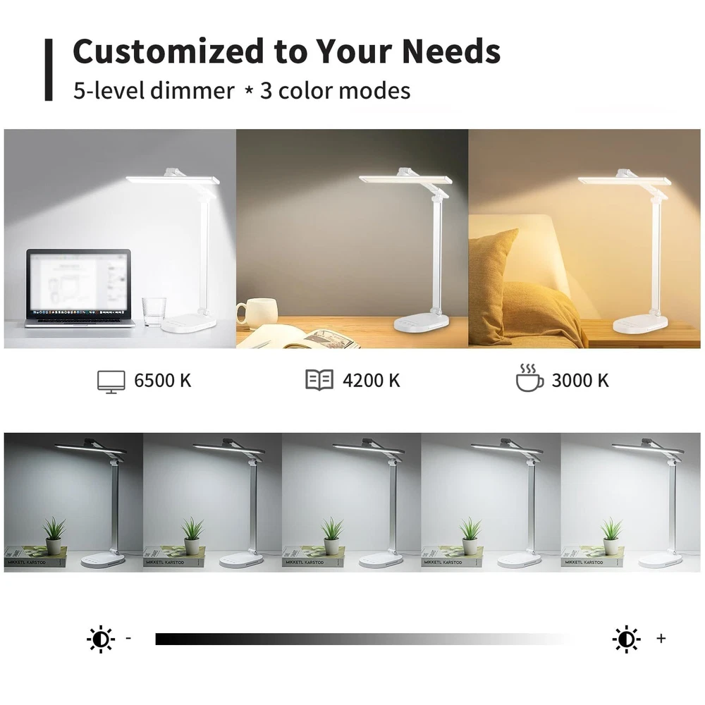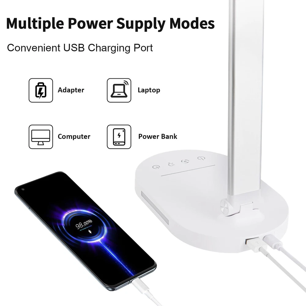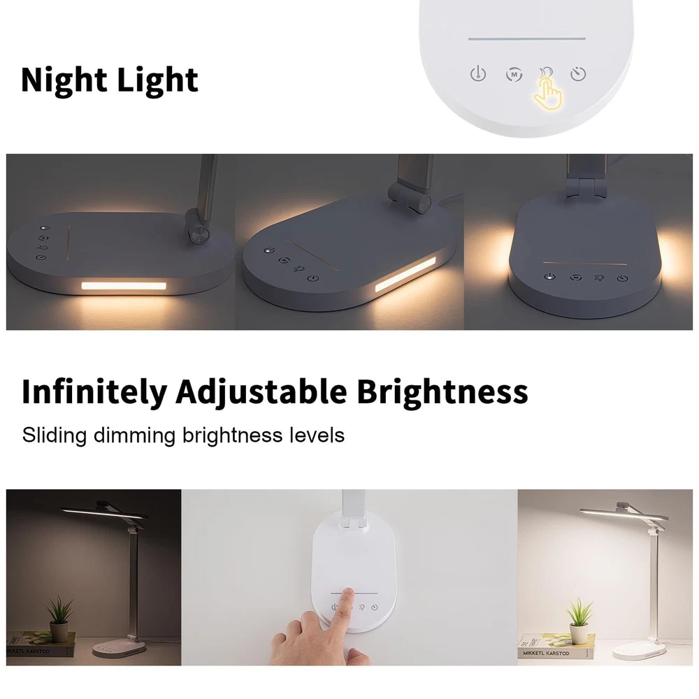Touch Control Dimmable Desk Light-Adjustable Desk Lamp with 3 Color Modes and 5 Brightness Levels allowing you to customize the lighting you need for work, study, reading or relaxation,like bright daylight white light for home office and soft warm light for bedside. Foldable Dseign:LED desk lamp with 180 degree flexible arm and 90 degree base axis. The foldable design saves space and you can carry it anywhere in the office, living room, bedroom, dormitory and any other places.Easy to place on shelves, bags, suitcases and boxes. Auto-off Timer. - Desk led lamp with 60 minute automatic timer function, even if you fall asleep while reading or working, it will automatically turn off for you, very energy saving. Eye Care Diffused Non-Flickering Lighting- This touch table lamps are designed to be soft, stable, and non-flickering light. The office desk lamp adopts surface led light source design which could perfectly eliminate glare, visual fatigue, and improve visual effects. USB POWER (AC ADAPTER INCLUDED) --- You can power the desk lamp by USB Port, easy to plug into any available USB port to power the lamp, such laptop, computer, power bank. Also, you can power by the AC Adapter which includes the package.