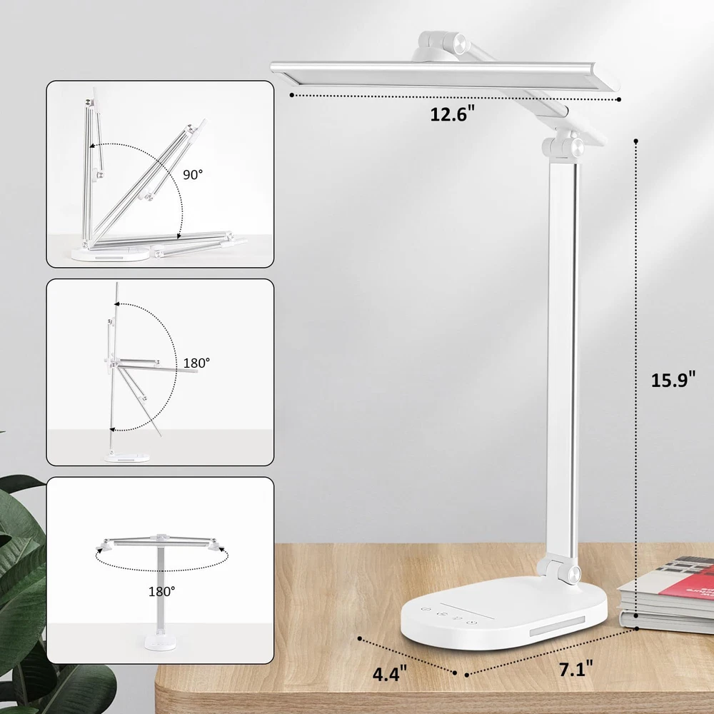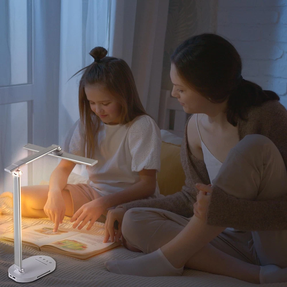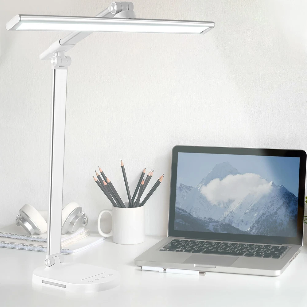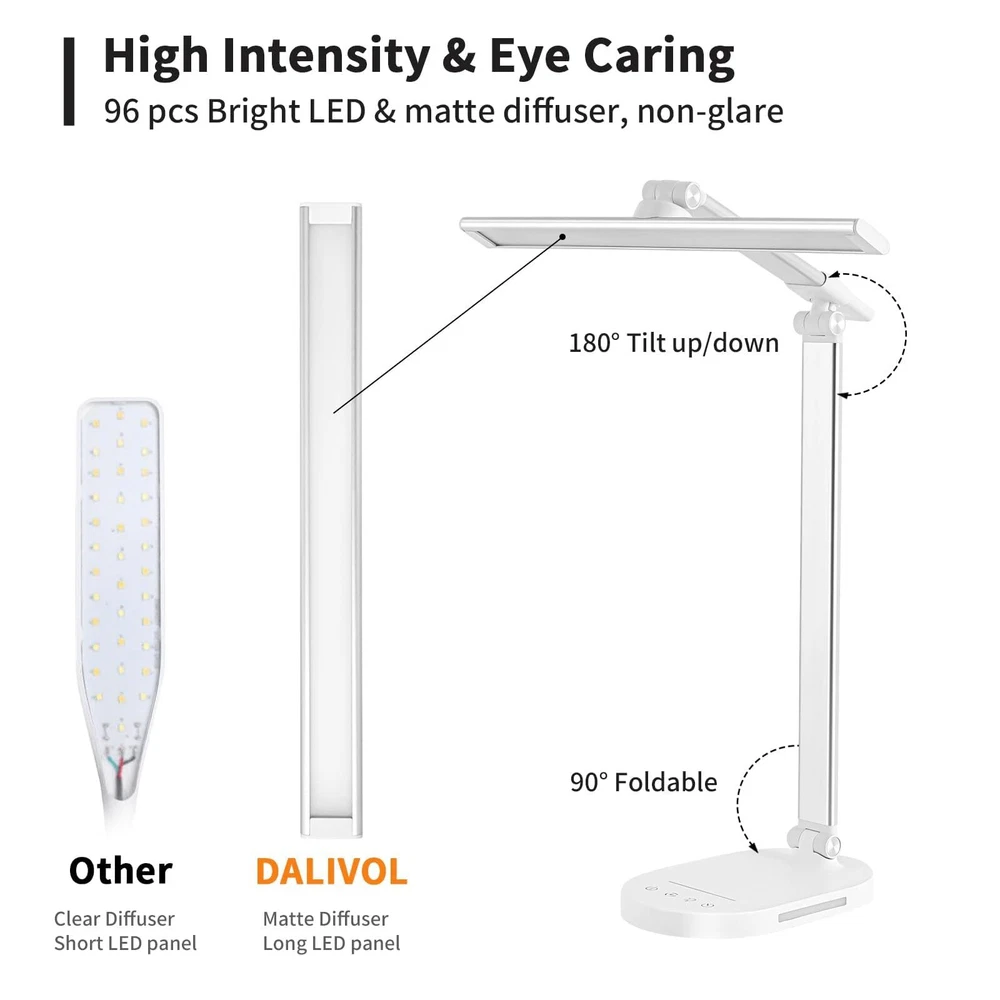 Touch Control Dimmable Desk Light-Adjustable Desk Lamp with 3 Color Modes and 5 Brightness Levels allowing you to customize the lighting you need for work, study, reading or relaxation,like bright daylight white light for home office and soft warm light for bedside. Foldable Dseign:LED desk lamp with 180 degree flexible arm and 90 degree base axis. The foldable design saves space and you can carry it anywhere in the office, living room, bedroom, dormitory and any other places.Easy to place on shelves, bags, suitcases and boxes. Auto-off Timer. - Desk led lamp with 60 minute automatic timer function, even if you fall asleep while reading or working, it will automatically turn off for you, very energy saving. Eye Care Diffused Non-Flickering Lighting- This touch table lamps are designed to be soft, stable, and non-flickering light. The office desk lamp adopts surface led light source design which could perfectly eliminate glare, visual fatigue, and improve visual effects. USB POWER (AC ADAPTER INCLUDED) --- You can power the desk lamp by USB Port, easy to plug into any available USB port to power the lamp, such laptop, computer, power bank. Also, you can power by the AC Adapter which includes the package.