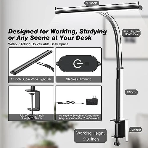 30 Days Return Policy Fast Delivery Trusted seller LED Desk Lamp for Office Home, Eye-Caring Desk Light with Stepless Dimming Adjustable Flexible Gooseneck, 10W USB Adapter Desk Lamp with Clamp for Reading, Study, Workbench (Black) Product Description Stepless Dimming Mode: The desk light offers effortless switching of color temperatures (2700K-6500K) and stepless dimming (1% - 100%) to meet your arbitrary color temperature and brightness needs, providing you with a healthy and comfortable office lighting experience. It is perfect for you and your child to read, work, study, unwind, draw, knitting, sew, craftwork, etc 360° Adjustable & Long Flexible Gooseneck: The long flexible gooseneck with 360° adjustable, easy adjustment to your preferred position, giving you full control over the direction of light. Our LED table lamp is made of aluminum and ABS material for excellent heat dissipation and a long lifespan of up to 60,000 hours. Additionally, the office lamp includes a built-in wire management feature, allowing you to neatly collect and conceal the wires, ensuring a clean and organized desk setup Big Size & Fit Models: Our table lamp features a 17-inch extra-wide lamp bar that can fully light up your workspace, providing you with enough brightness to complete any task. It is suitable for a maximum work height of about 31 inches, making it compatible with 30-inch monitors (backward compatible with 29-inch, 27-inch, 24-inch, and other monitors). Office desk lamp with easy installation and an adjustable metal clamp design, the sturdy metal clips can support desktops up to 2.36 inches thick Eye Care: Our eye care light is composed of 100 high-quality lamp beads. This clip lamp experience uniform brightness, a wide lighting range, and an absence of bothersome strobes, blue light hazards, and glare. Our lamp emits soft, eye-friendly light that safeguards your eyesight and minimizes eye fatigue even during extended periods of use Reliable USB Adapter & Customer Service: To ensure a seamless experience, office desk lamp come with a complimentary 5V/3A reliable adapter, providing you with everything you need right out of the box. The package includes: 1x Eye-caring Desk Lamp, 1x Metal Clamp, 1x Power Adapter(5V/3A), 1x User Manual. our dedicated customer support team is to assist you promptly and effectively Shipping Returns Payment Shipping Shipping is FREE to all addresses other than APO/PO boxes in the lower 48 states. All our stock ships from US-based warehouses. Shipped via USPS or UPS (depending on location and package weight) Unless stated otherwise, all orders will ship within 24-72 hours of your payment being processed. Check our feedback to see the great reviews of FAST shipping we offer. Returns As our valued customer, we will do our best to make sure the product you receive arrives to you on time and as expected. If you are not satisfied with your purchase, please contact us within 30 days of receiving your order to process a return. Payment We currently accept payment via eBay managed payments only. Once payment is cleared, we will dispatch your shipment within 1-3 business days. Please refer to the "Shipping" tab for more information regarding shipping speed to your destination.