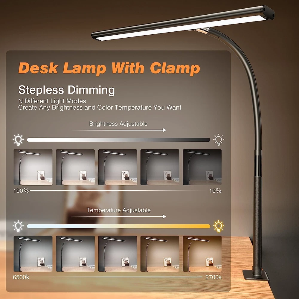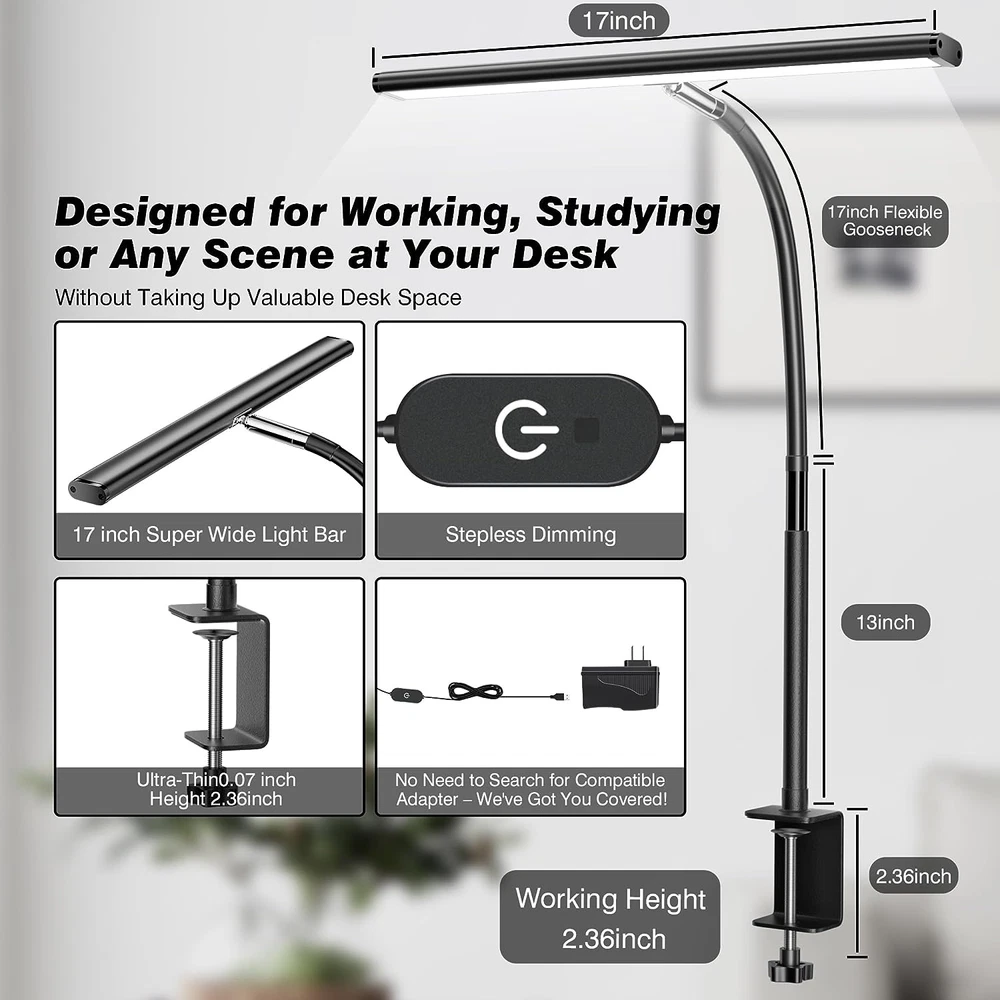 Stepless Dimming Mode: The desk light offers effortless switching of color temperatures (2700K-6500K) and stepless dimming (1% - 100%) to meet your arbitrary color temperature and brightness needs, providing you with a healthy and comfortable office lighting experience. It is perfect for you and your child to read, work, study, unwind, draw, knitting, sew, craftwork, etc 360° Adjustable & Long Flexible Gooseneck: The long flexible gooseneck with 360° adjustable, easy adjustment to your preferred position, giving you full control over the direction of light. Our LED table lamp is made of aluminum and ABS material for excellent heat dissipation and a long lifespan of up to 60,000 hours. Additionally, the office lamp includes a built-in wire management feature, allowing you to neatly collect and conceal the wires, ensuring a clean and organized desk setup Big Size & Fit Models: Our table lamp features a 17-inch extra-wide lamp bar that can fully light up your workspace, providing you with enough brightness to complete any task. It is suitable for a maximum work height of about 31 inches, making it compatible with 30-inch monitors (backward compatible with 29-inch, 27-inch, 24-inch, and other monitors). Office desk lamp with easy installation and an adjustable metal clamp design, the sturdy metal clips can support desktops up to 2.36 inches thick Eye Care: Our eye care light is composed of 100 high-quality lamp beads. This clip lamp experience uniform brightness, a wide lighting range, and an absence of bothersome strobes, blue light hazards, and glare. Our lamp emits soft, eye-friendly light that safeguards your eyesight and minimizes eye fatigue even during extended periods of use Reliable USB Adapter & Customer Service: To ensure a seamless experience, office desk lamp come with a complimentary 5V/3A reliable adapter, providing you with everything you need right out of the box. The package includes: 1x Eye-caring Desk Lamp, 1x Metal Clamp, 1x Power Adapter(5V/3A), 1x User Manual. our dedicated customer support team is here to assist you promptly and effectively Product Description The video showcases the product in use. The video guides you through product setup. The video compares multiple products. The video shows the product being unpacked. Our LED desk lamp protects the eyes of people who work and read for long periods from harm. No glare, No flickering, No ultraviolet rays, No frequency radiation. 1 Multiple Lighting Modes 2 Wide Coverage 3 Eye Protection 4 Simple Installation 360° Free Rotation Lamp Holder Provides wider and greater lighting coverage, the direction of the light canbe adjusted freely. One Button Operation Touch Lightly: ON/OFF or switch the light color. Long press: Adjust the brightness. 360° Adjustable Gooseneck Rotatable neck easily adjuststhe light to the desired angle. Simple Installation Flexible adjustable clip design, which can support up to the desk thickness of 2.36 inches. Applicable To Multiple Occasions This LED desk lamp can be fixed at any position you desire, making it highly suitable for large workbenches and drafting desks. It provides ample and comfortable lighting for your work at home, studying, drawing, reading, sewing, and crafting.