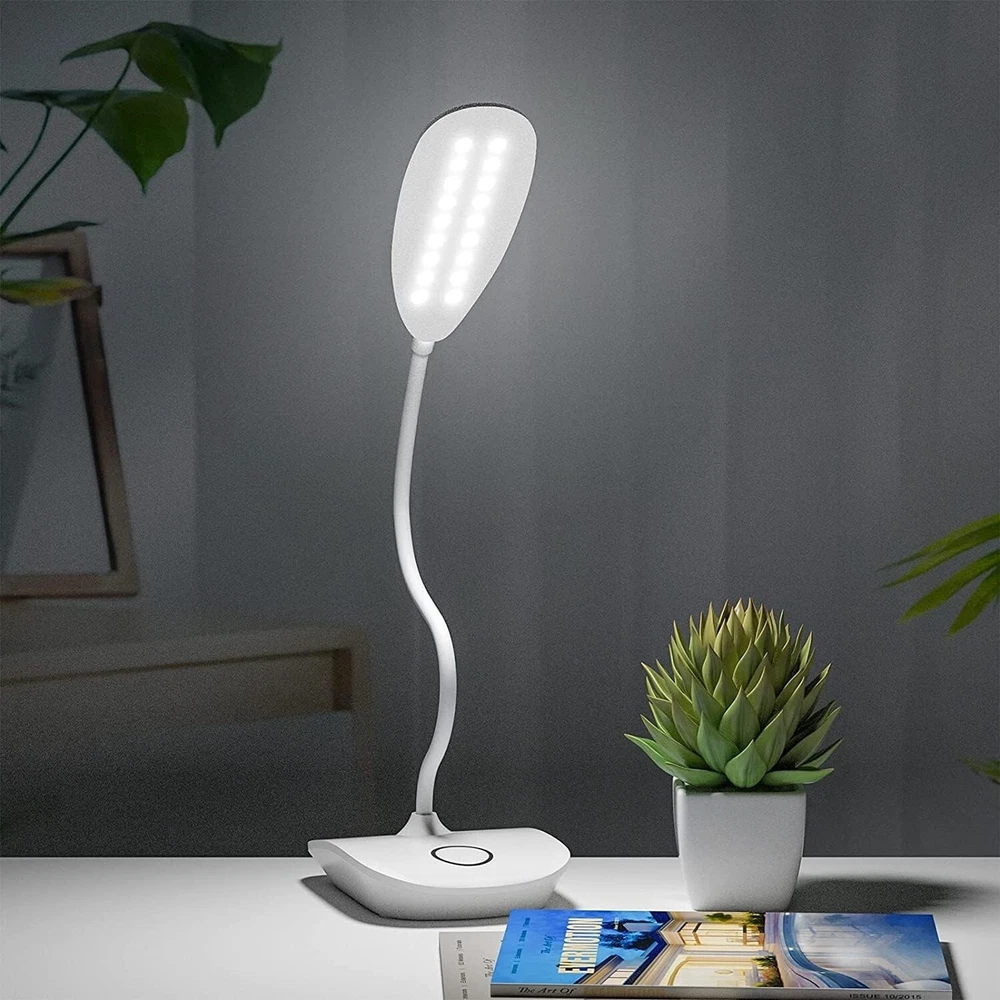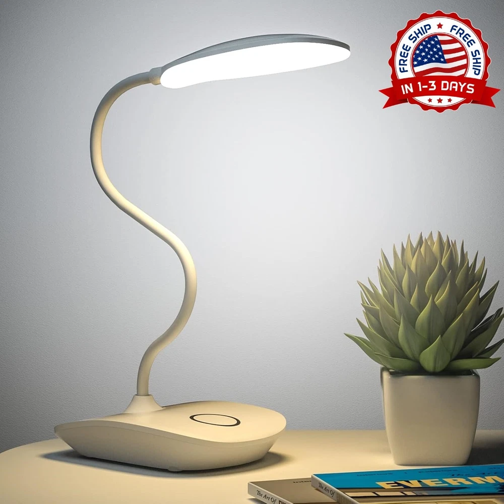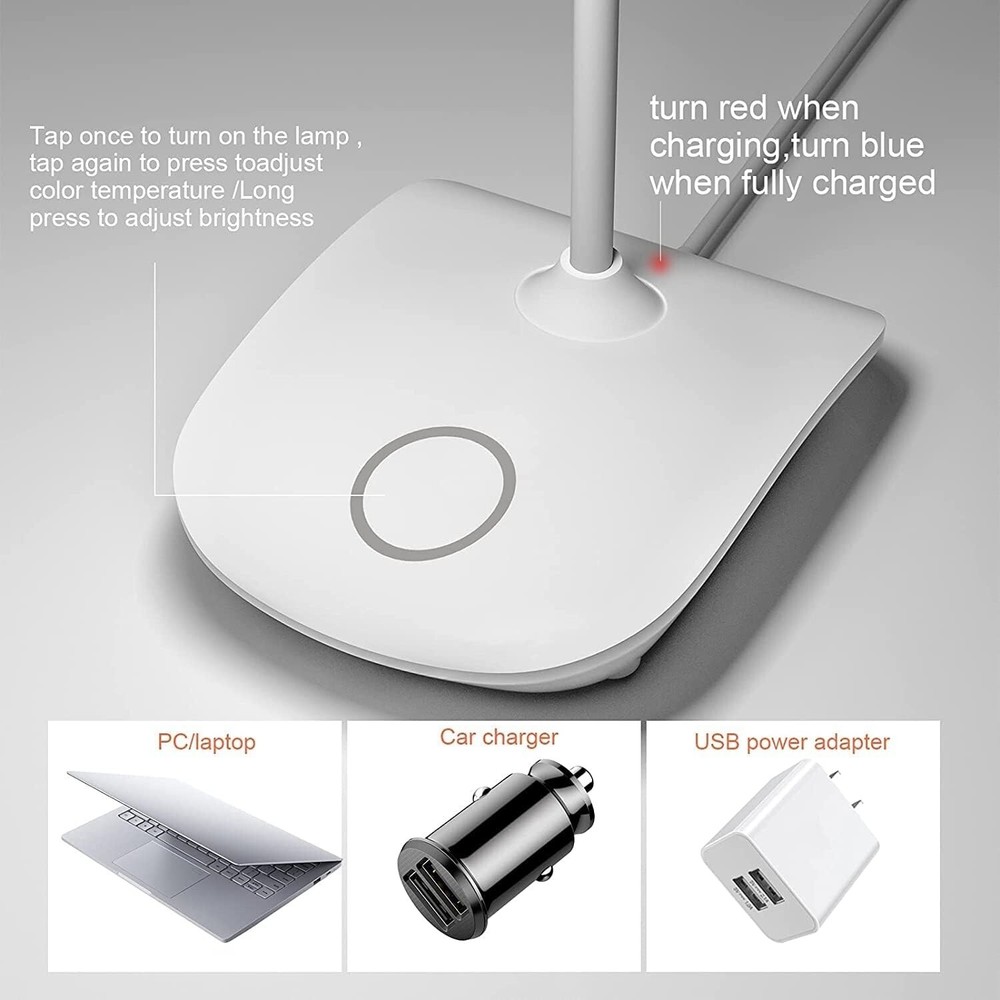 Lampara De Escritorio Luz LED Lectura Lámpara Mesa Para Oficina Y Casa Hogar NEW 3 modos de iluminación, atenuación continua: esta pequeña lámpara de escritorio con 3 temperaturas de color disponibles (luz blanca, luz cálida, luz blanca cálida) cada modo es regulable. Mantenga presionada la base táctil para obtener su brillo favorito, ideal para relajarse, leer, trabajar, estudiar, hacer manualidades, exhibir, acampar, etc., adecuada para dormitorios universitarios, oficinas, dormitorios, salas de estar, habitaciones de niños, baños, etc. Lámpara táctil de larga duración: esta lámpara LED está equipada con una batería recargable incorporada de 1800 MAH, funcionará de 4 a 6 horas con el brillo más alto después de estar completamente cargada. El cable USB de 4.9 pies incluido es muy útil para cargar la lámpara con un adaptador USB (no incluido), banco de energía, toma de pared USB, computadora portátil o de escritorio (cargue la lámpara para proteger la vida útil de la batería si no se usa durante mucho tiempo) Lámpara portátil: esta lámpara que funciona con batería no tiene que enchufarse cuando se usa, es inalámbrica y portátil para llevar al exterior o al interior libremente, especialmente si hay tomas de corriente limitadas y se producen cortes de energía. Y la función de memoria de esta mini lámpara de mesa recordará el último uso tanto para los modos de color como para el brillo. Lámpara de estudio plegable: esta moderna lámpara de escritorio se ve elegante y con estilo, y el cuello de cisne con flexibilidad de 360° asegura que se pueda plegar en una lámpara pequeña, no ocupa demasiado espacio en tu bolso cuando viajas. Luz LED que cuida la vista y ahorra energía: luz LED brillante de 5 W, 400 lúmenes con brillo completo, sin parpadeo, sin área oscura, ahorro de energía y cuidado de la vista, protege tus ojos de la fatiga.