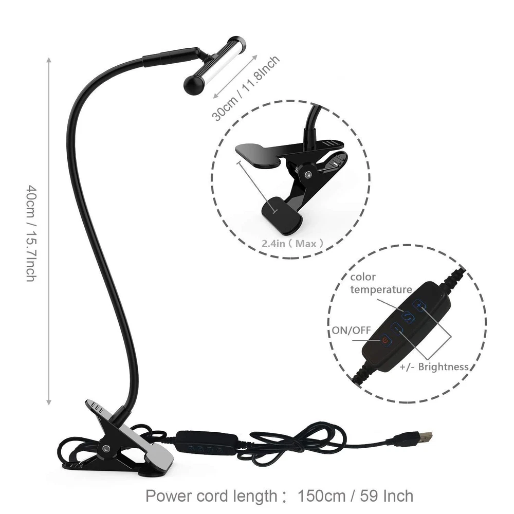 [Flexible Gooseneck Design] The video conference lights with a flexible neck and head can be adjusted up and down 180 degrees and rotated 350 degrees for easy positioning and setting of perfect lighting directions as needed. [Dimmable] 10 Brightness Levels - Press the brightness button can allows you to easily adjust the brightness level between 10% and 100% to achieve the perfect lighting. easily find the perfect lighting for your project. 3 color temperatures optional - Reading lamp have 3000K-4000K-6500K (3 color temperatures) to satisfy your different lighting needs. [USB Powered & Memory Function] This desk lamp come with an adapter. Insert the USB Cable to power adapter, computer or other USB devices to power the clip lamp. Brightness memory will memory your current brightness when turning off the light. (Note: if you cut off the power supply instead of turning off the switch, it will release all settings.) [Desk Lamp Clamp Easy to Install] The clip on light with strong metal clamp can be clipped on any flat surface that the thickness is less than 2.4"/6cm(max) thick. [Professional Eye Protection] Adopting diffusion translucent material, close to daylight illumination, emitting soft light without ghost, glare or flicker. led task lamp suitable for bedside, reading, music stand, drawing, work, study, etc.