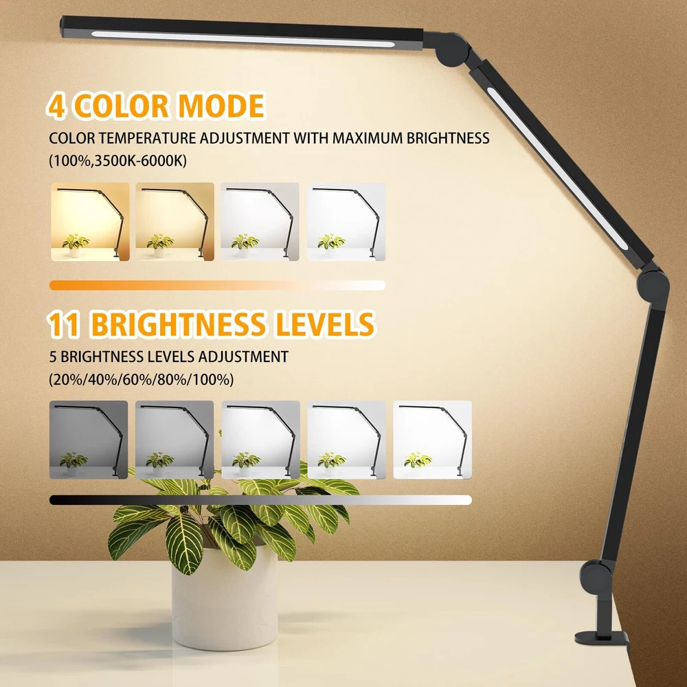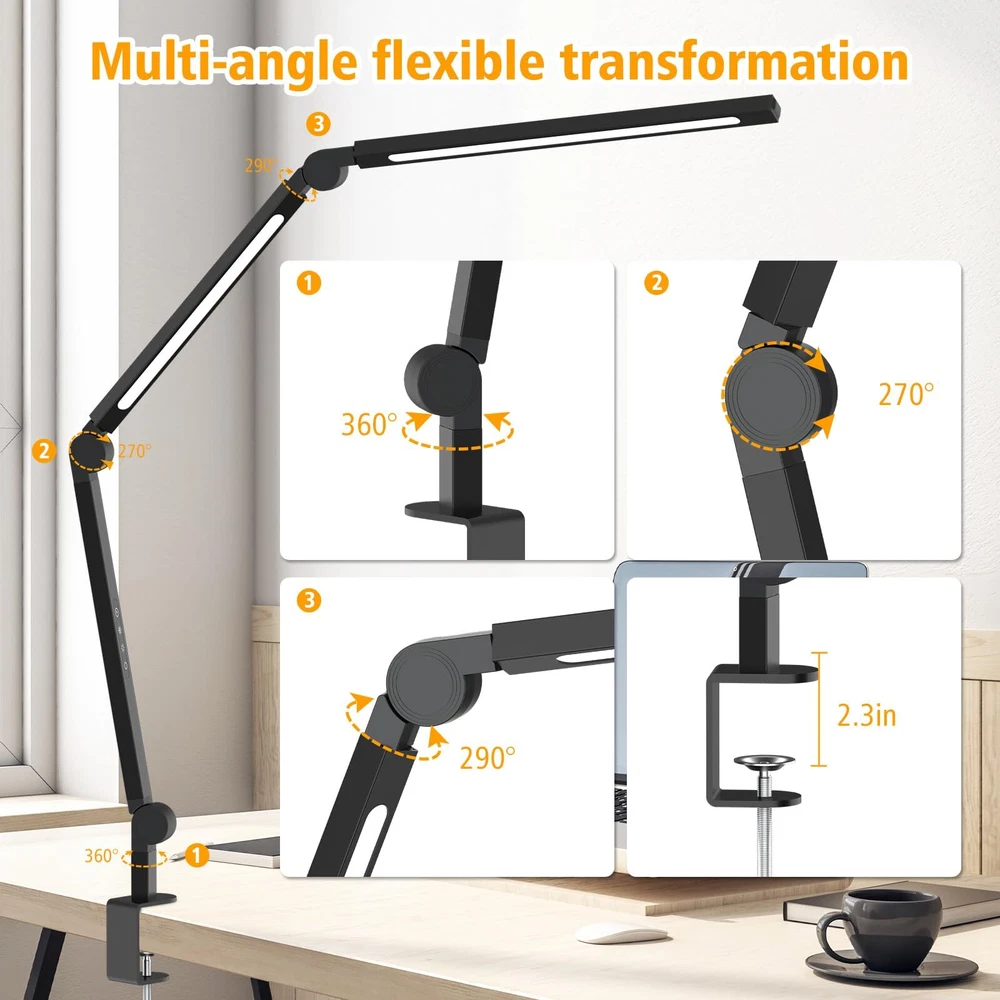 [Efficient and Stylish Workspace]: The Foldable LED Desk Lamp is an ideal complement to your office or home workspace, combining efficiency with a touch of style. This desk lamp not only offers abundant illumination but also adds a touch of elegance to your workspace. The adjustable lamp arm and head enable you to precisely direct the light to your desired position, ensuring optimal visibility, minimizing eye strain, enhancing work efficiency, and igniting your creative inspiration. [Multi-functional Lighting]: The foldable LED desk lamp provide multiple lighting options according to your preferences. Whether you want to create a comfortable atmosphere with soft warm light or need bright cool light to focus on work, this desk lamp has it all. With a 4-level dimmer, you can adjust the brightness according to your needs. In addition, the color temperature control function allows you to create the perfect lighting atmosphere for any occasion. [Space-saving and Versatile] The foldable LED desk lamp by is designed with convenience in mind. Its compact and foldable design makes it easy to store and carry, making it perfect for individuals with limited desk space or those who frequently travel. Equipped with a sturdy clamp, this desk lamp can be securely attached to any desk, shelf, or table, providing you with a stable lighting solution while freeing up valuable space. [Energy-saving and Eco-friendly] Traditional desk lamps are not only energy-wasting but also harmful to our eyes. But with 's foldable LED desk lamp, you can now enjoy long-lasting and energy-efficient lighting. Its natural and flicker-free light can reduce eye fatigue and discomfort, allowing you to work or study for extended periods without feeling tired. Say hello to healthy and eco-friendly lighting with 's foldable LED desk lamp! [About Us] offers quality products and efficient after-sales service, and the Foldable LED Desk Lamp is no exception. Its modern and stylish aesthetics combined with durable construction ensures that it not only enhances your workspace, but also stands the test of time. If you encounter any problems during the use of the product, please feel free to contact us, we will be happy to serve you and provide you with a solution as soon as possible.