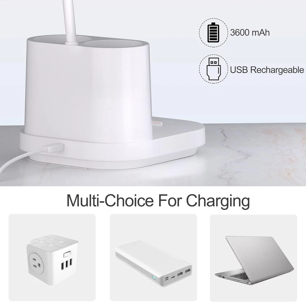 【Multifunctional Design】 3-in-1 Multifunctional small desk lamp with Night Light, Cell Phone Holder and Pen Holder design is fully functional, you can conveniently place stationery, small items, etc. to reduce desktop space or organize your messy desktop; Night Light design accompanies you to sleep peacefully every night; Cell Phone Holder design is convenient for watching videos. This desk light is small and doesn't take up much space, perfect for use in home office, bedrooms, study rooms 【Stepless Dimming & 3 Color Modes】LED cute desk lamp consists of 60 high-quality LEDs, 3 lighting modes (Warm, White, Warm-White Mixed) with touch-sensitive switch, responsive, and infinitely dimmable (long press: continuous attenuation or enhancement); Dimmable desk lamp has a light memory function so that you can remember your last light setting when you use it 【Adjustable Gooseneck and Eye Protection Effect】The LED office desk lamp is designed with a gooseneck, which can be bent and folded, and the height and angle can be adjusted arbitrarily. Desk lamp office lighting is wider and brighter, the light is soft, no glare and no flicker, and the reading lamp is also suitable for people with sensitive eyes, which can effectively care for the eyes 【Durable Battery & Easy to Use】The desk lamps for home office has a built-in 3600mAh lithium battery, which takes 4-5 hours to fully charge, and the desk lights works for up to 3-5 hours, which is very durable. The desk lamp cute comes with a USB power cord that you can charge with a USB adapter, computer, power bank, car charger, and other devices with a USB port, making it convenient for indoor and outdoor use 【Wide Use and Energy Saving Warranty】The desk lamp adopts modern LED technology, which is more energy efficient than traditional lighting. It can be used as an office light, study light, USB reading light, LED desk lamp, computer desk lamp. If you have any questions during use, please feel free to contact us Product Description The video showcases the product in use. The video guides you through product setup. The video compares multiple products. The video shows the product being unpacked. Easy to Adjust the Lighting The study desk lamp with the touch-sensitive button. Just press the “ON/OFF” button to adjust different lighting to coordinate with the different work. Rechargeable LED Desk Lamp Modern Design Pen holder Making it to keep your desk organized and clutter-free. Night Light You can turn on the small night light when you need to sleep. It will accompany you tenderly. 1 Pen holder 2 Night Light 3 Eye-caring Designed for kids, studren, business people. Desk Lamp for Home/College Dorm Room Our rechargeable desk lamp is perfect for students, kids. You have enough light to work or study even during power outages. Also designed with your eye health in mind. The lamp is flicker-free and provides you with a stable and consistent light source that is easy on your eyes, reducing eye strain. Desk Lamp for Office This desk lamp is also the perfect addition to office. The lamp has 3 color modes - warm white, cool white, and natural light - allowing you to choose the best lighting for your work. In addition to its lighting, also comes with a pen holder, making it to keep your desk organized and clutter-free. Suitable for home, office, study room, reading room, dorm room. Ideal gift for kids, family, friends.