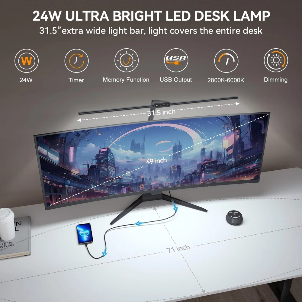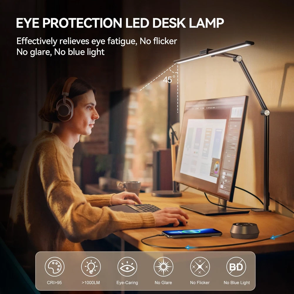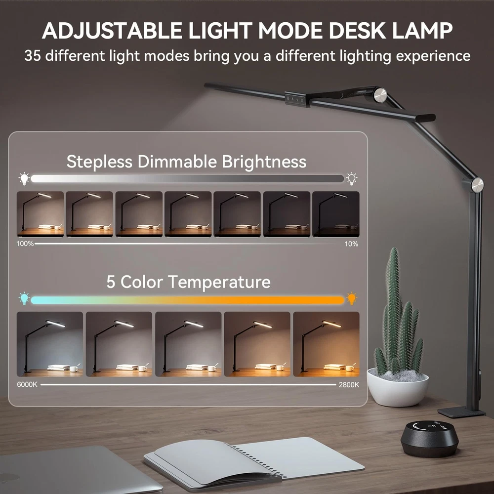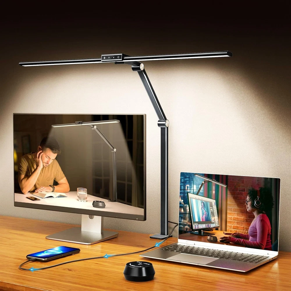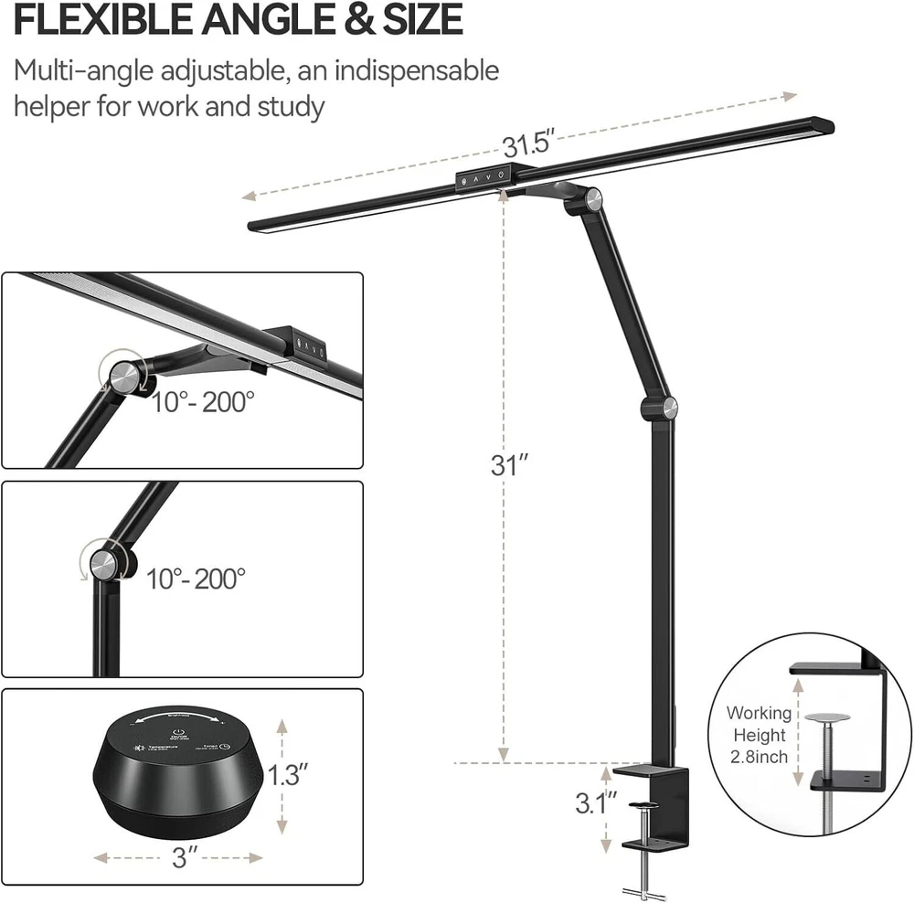 Table Lamp with Clamp for Home Offices:This 24 W LED desk lamp is designed with dual lamp heads, the light bar can be extended up to 31.5 inches, the height can be up to 31 inches, and the angle is adjustable.The desk lamp is suitable for multi-monitor workstations,home offices,large desks, study rooms,architects,computers, drawing,sewing,crafts,painting,reading,games and piano Multi-Light Modes:The office table lamp provides a wide range of brightness adjustments, including 7 brightness stepless dimming and 5 color temperature modes (2800K to 6000K).The modern desk lamp has a sensitive touch function and is equipped with a wireless remote control Eye-Caring Protection and USB Charging Port:This LED desk light illuminates uniformly,softly,flicker-free,glare-free,blue light-free and accurate.The desk lamp with a USB charging port allows you to charge your devices without a wall plug Memory and Timing Function:The memory function can keep the table lamp in the last used mode and brightness without resetting.The timer function can make the desk lamp turn off automatically after working for 1 hour to prevent us from being overworked Easy to Install and Durable:The LED lamp installation process is simple and easy.The LED desk lamps with metal compact base clamps fit easily in any space.The task desk lamp is made of aluminum alloy and ABS material, which is durable and sturdy