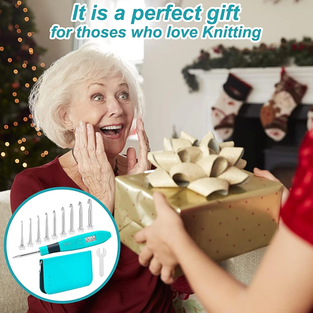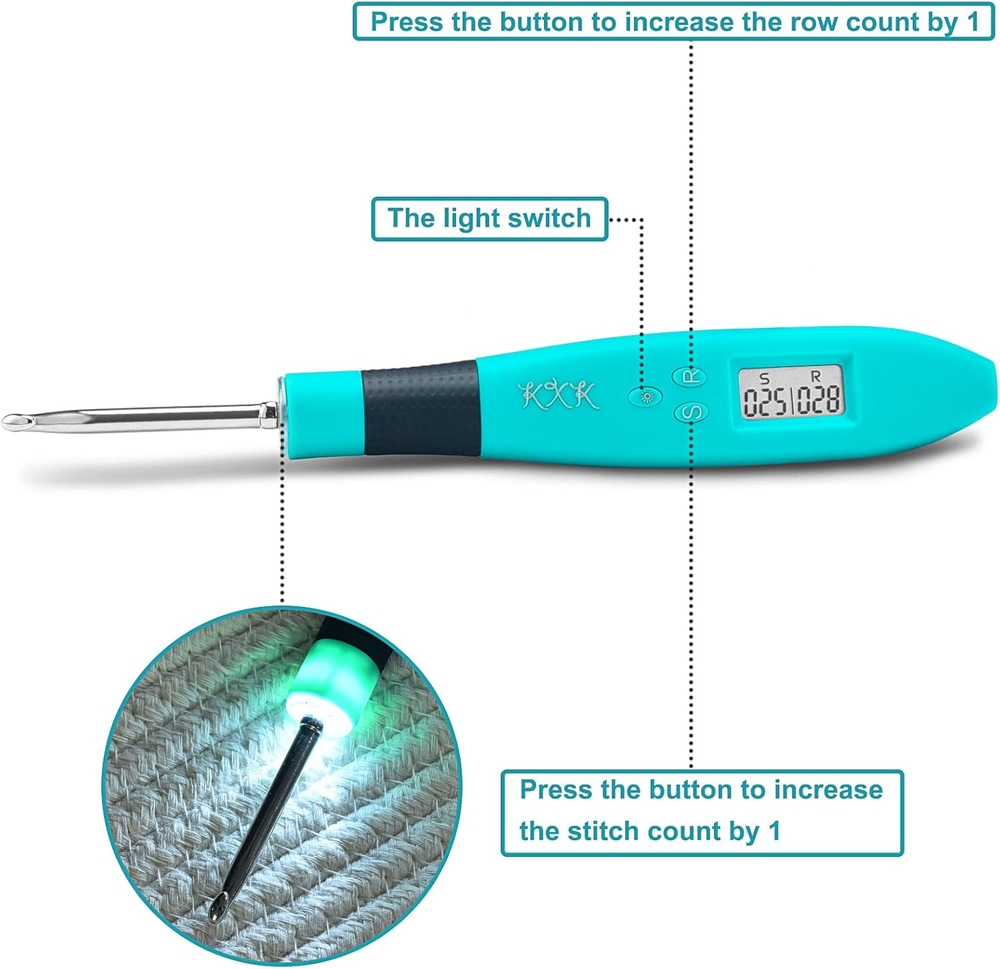【DIGITAL COUNT KNITTING NEEDLES SET】By clicking the button "S" & "R" on the handle, the number of rows and stitches can be recorded in real time, and the data of the last stitch and the last row can also be stored. NOTE THAT THIS CROCHET YARN DOES NOT AUTOMATICALLY COUNT. 【LIGHTED CROCHET SET】With the click of a button on the handle, the crochet hook can be lighted up, suitable for working in dark night. Built-in lithium battery can be quickly charged and reused. 【9 IN 1 ALUMINUM HEADS】Counting crochet tools set contains 9 in 1 aluminum interchangeable heads with hook sizes from 2.5 mm - 6.5 mm, and the metal heads are durable and sturdy to use for a long time. 【CROCHET KIT WITH ERGONOMIC DESIGN】The handle is ergonomically designed to keep your fingers from soreness during long hours of work. In order to meet the usage habits of most people, this crochet hook is only suitable for RIGHT-HAND users 【PERFECT GIFT】This LED Crochet Kit with high quality crochet bag is an ideal gift for beginners, experienced people or DIYers, especially for old crocheters. Just prepare this set as a gift for Christmas, birthdays and other special occasions. Product Description Complete Set Crochet handle with built-in counter 9 aluminium hooks (2.5mm - 6.5mm) USB cable Aluminium wrench Blue Zip Bag Instructions Count Increase Click the button to increase the count by 1. Count Decrease Hold the button for one second to decrease the count by 1. Count Reset Hold the button for three seconds to reset the count. First Step Use the small wrench to loosen the hook head out. Second Step Select the size you want and align the protrusion near the marked size with the slot in the handle connector. Third Step Align the wrench with the groove on the hook head and tighten the hook head until you hear a click. LED Lighted Electric crochet needle with glowing LED light, no worries even in the dark.